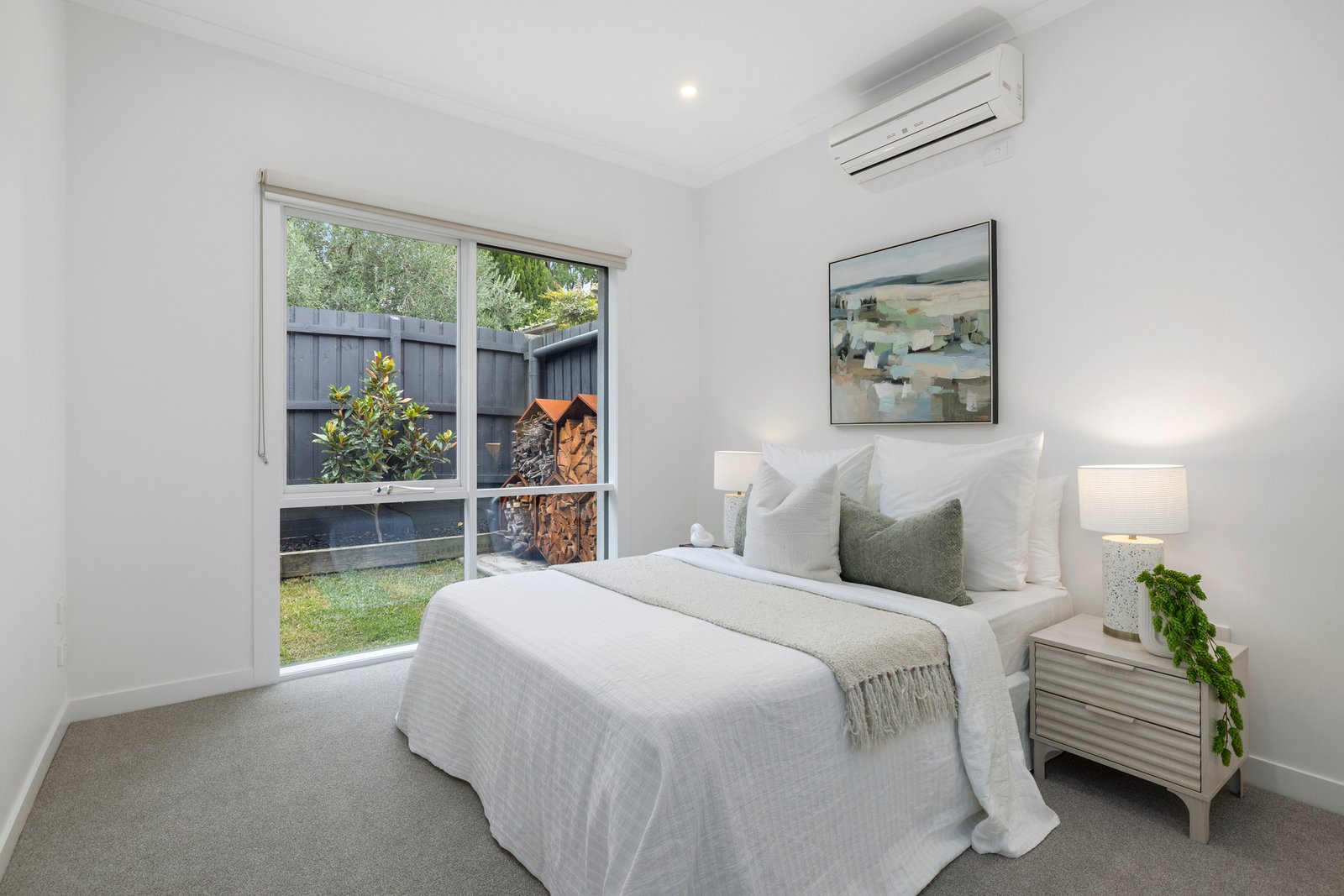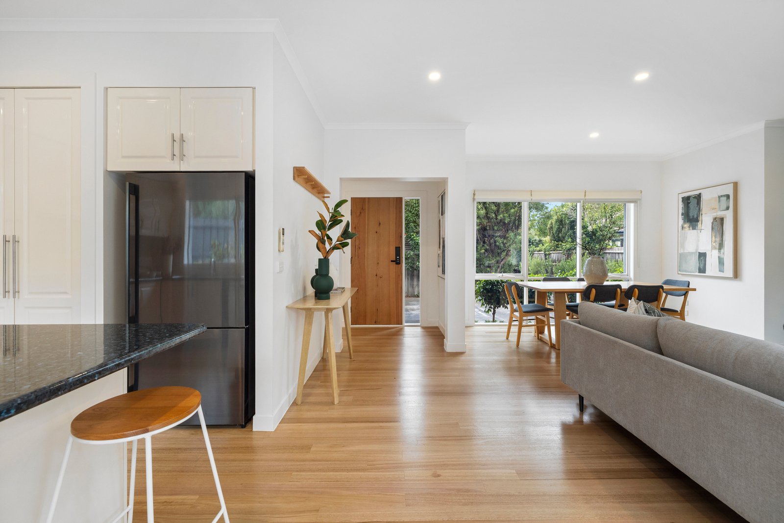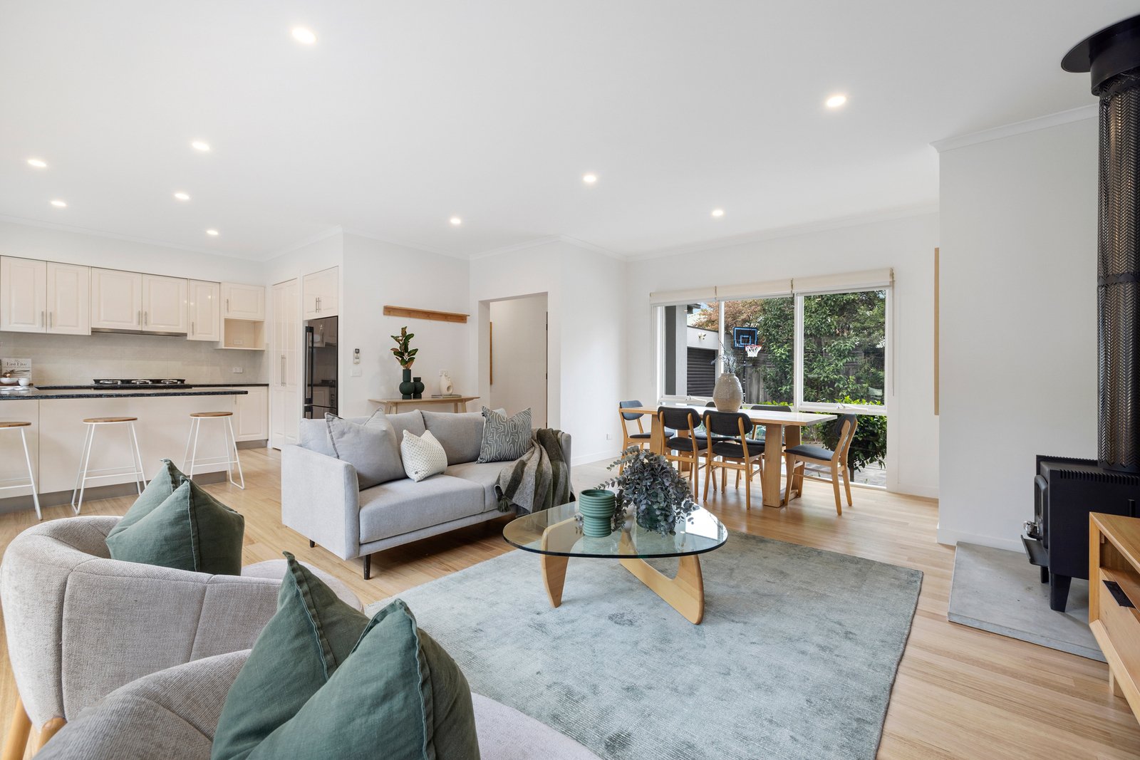 Smartly rendered on the outside, keyless entry gives way to the light-filled interiors which showcase pale coastal oak floor through the generous social areas. Featuring an open plan entertaining zone with gorgeous panelling and an inviting wood-burner heater, the layout flows into a well-equipped kitchen and out to the alfresco deck and an easy-care garden – an idyllic setting for lazy summer get-togethers.