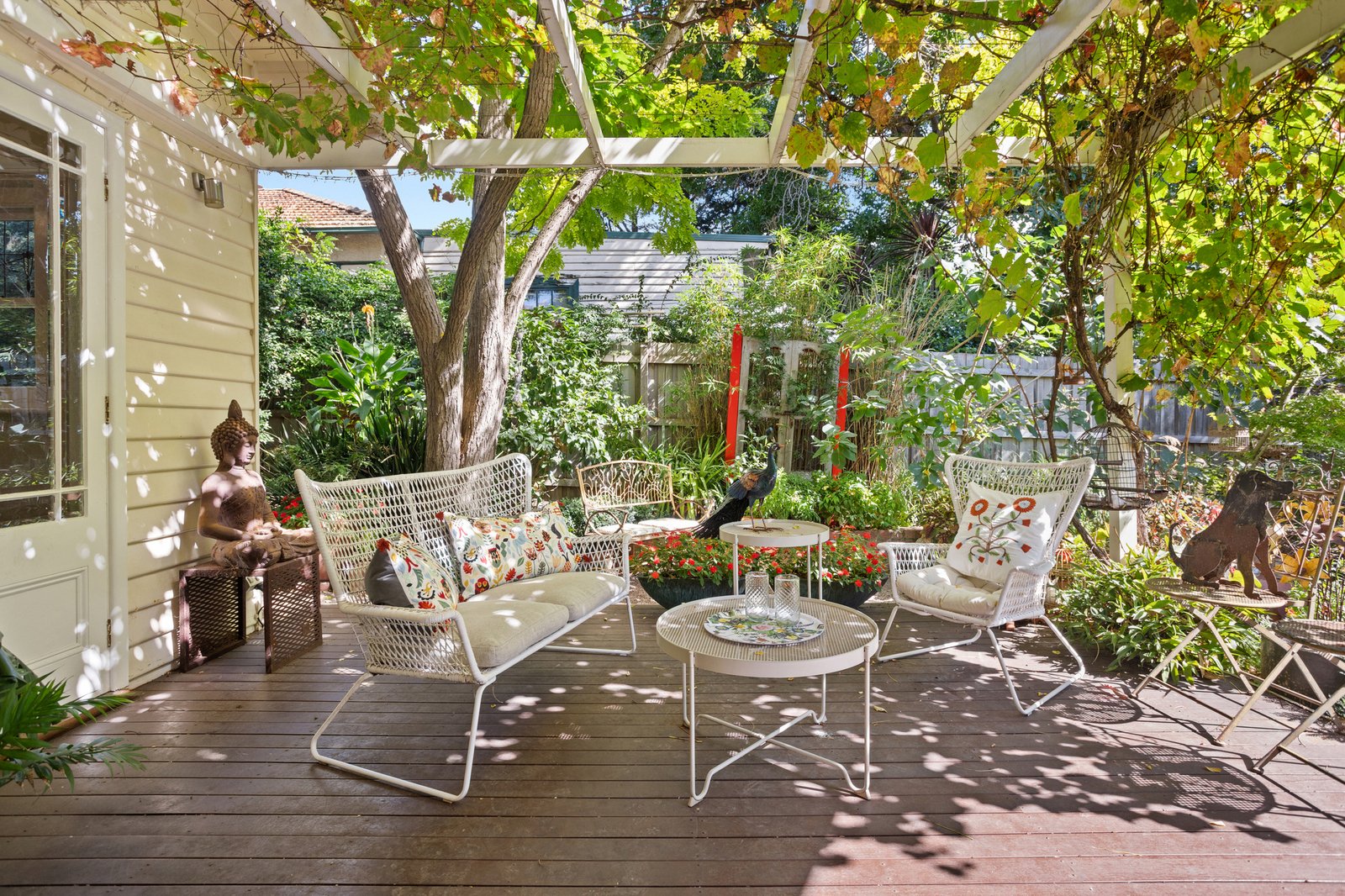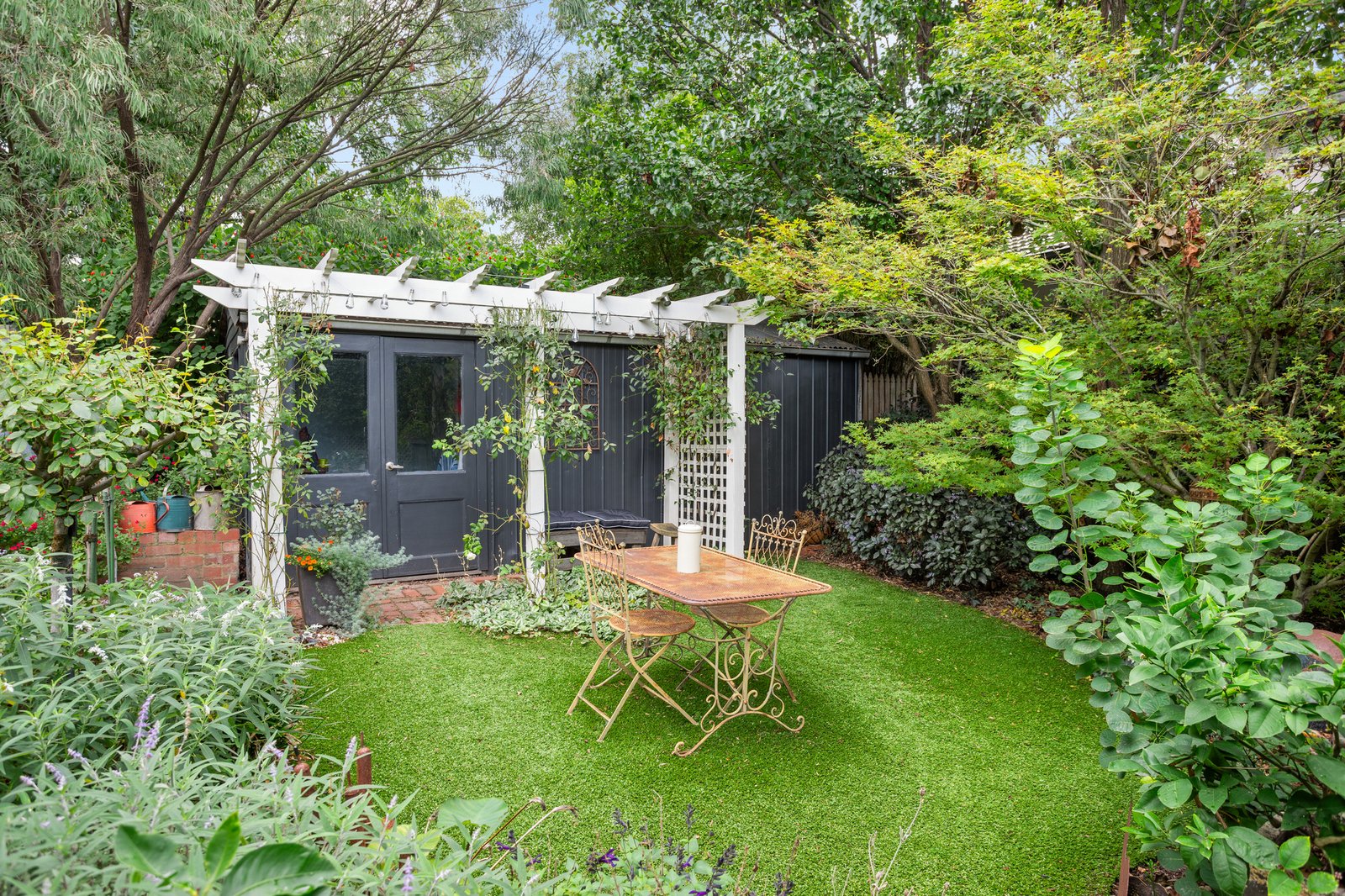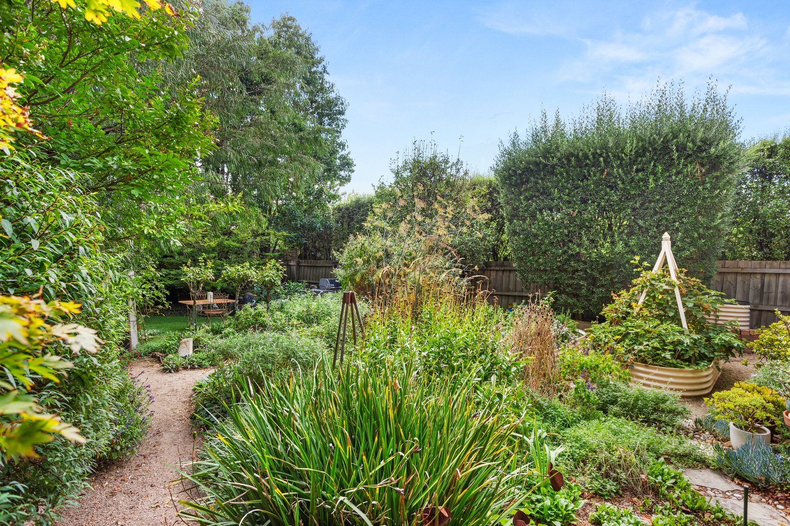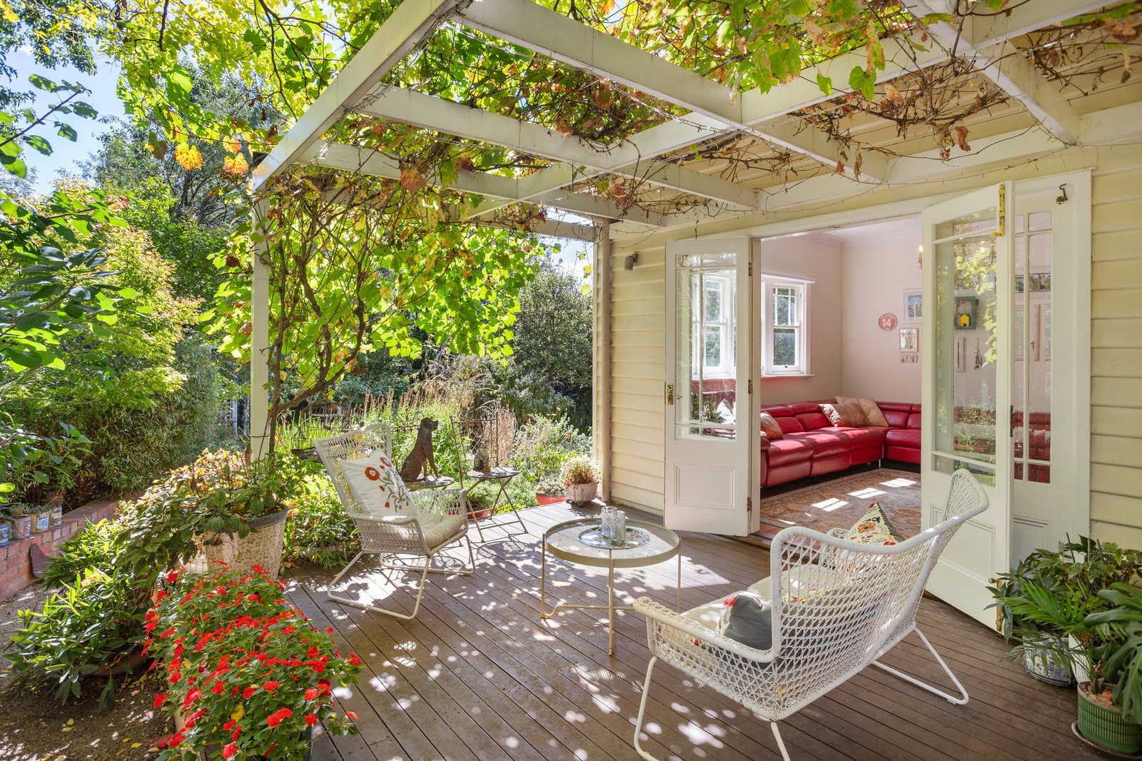 At the rear, a separate living domain opens through French doors to a stunning vine-covered deck, creating a seamless indoor-outdoor connection for entertaining or relaxed afternoons overlooking the established garden. The outdoor setting is a true highlight, with mature greenery, productive garden beds, winding pathways and a wonderful sense of privacy rarely found.