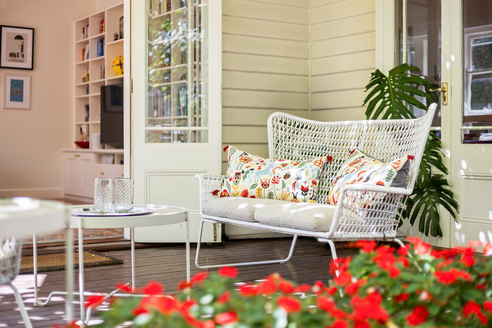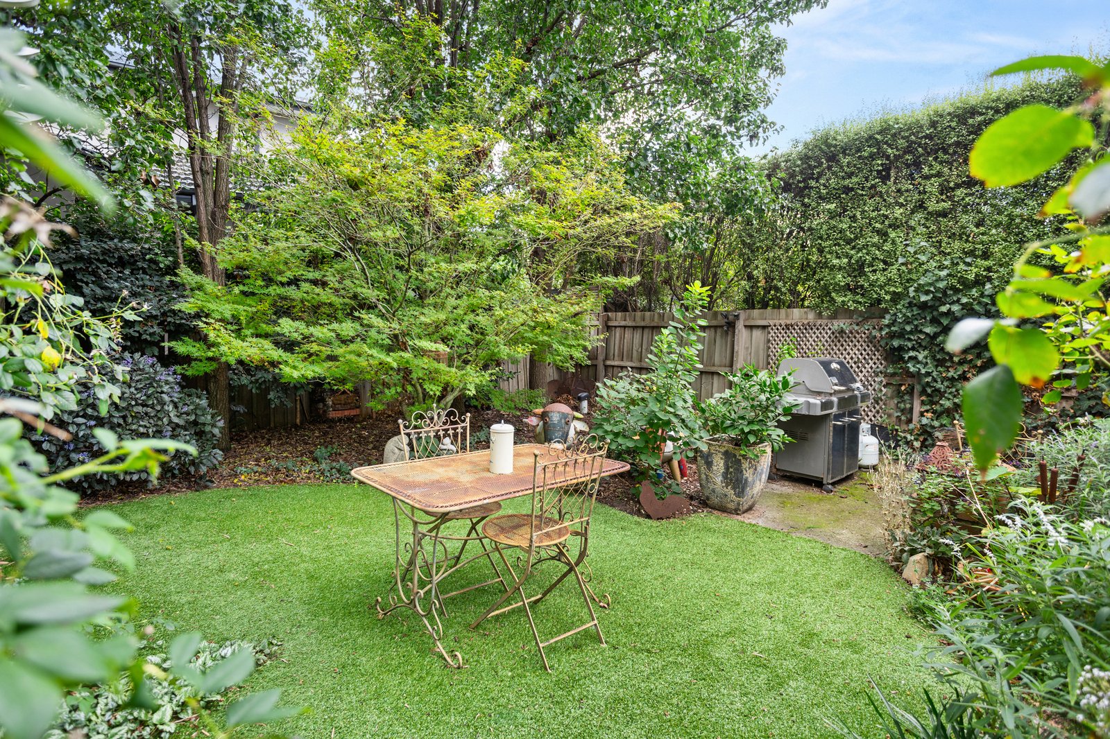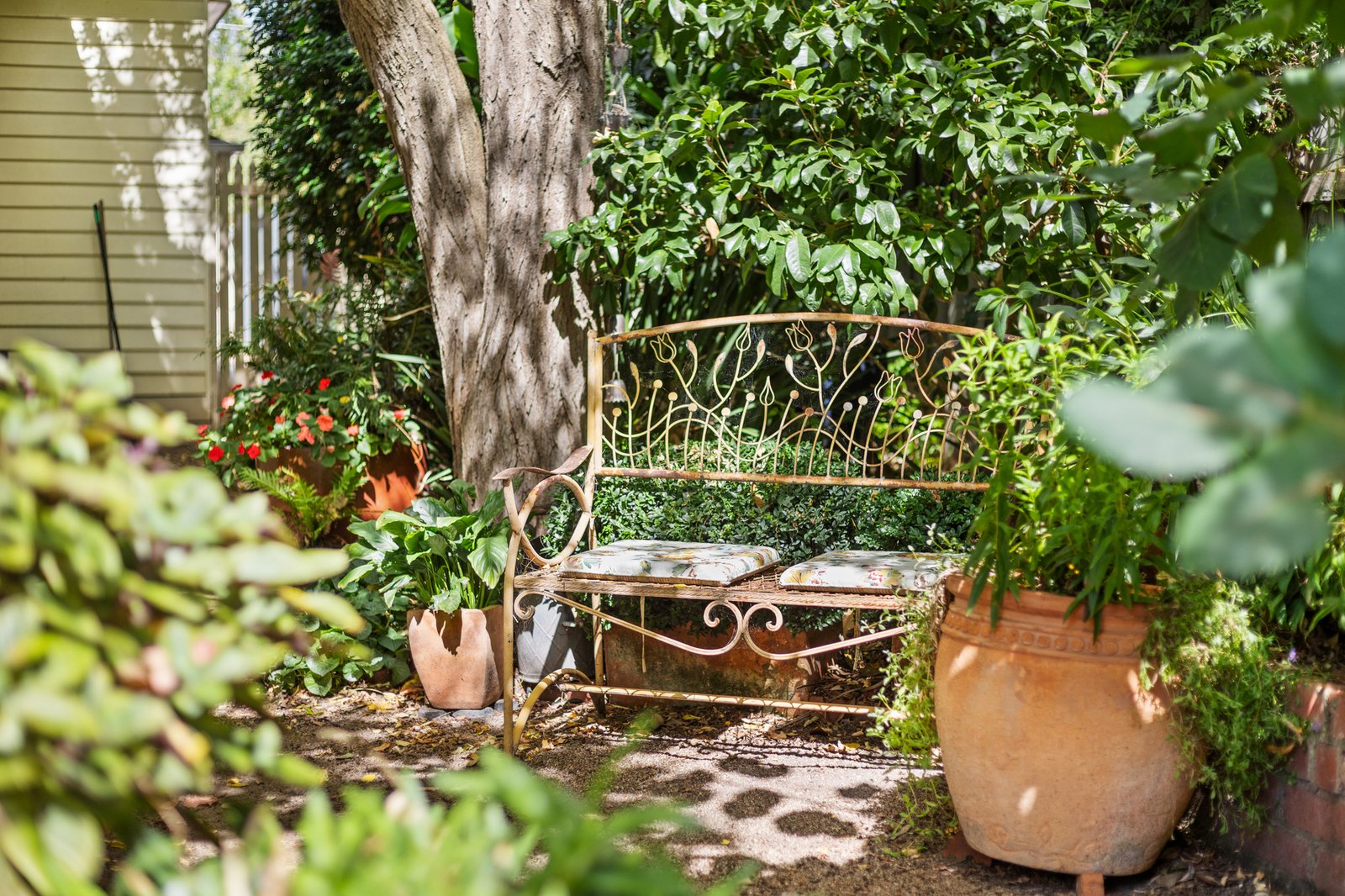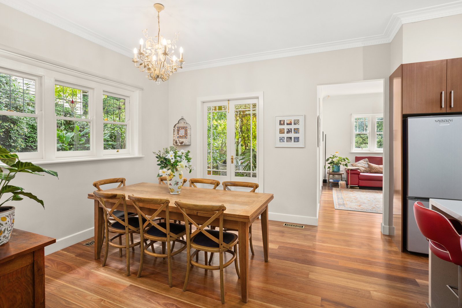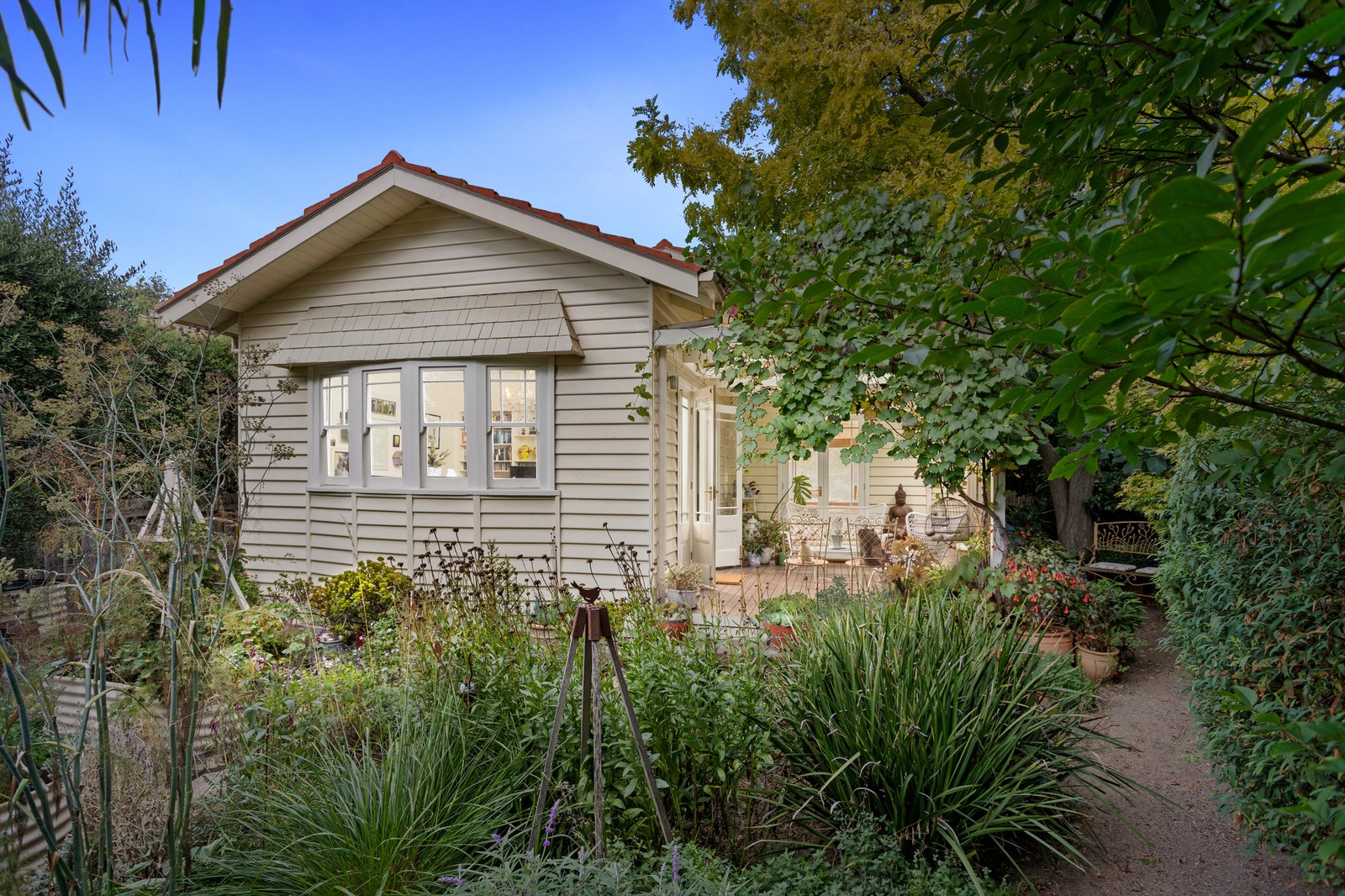 At the rear, a separate living domain opens through French doors to a stunning vine-covered deck, creating a seamless indoor-outdoor connection for entertaining or relaxed afternoons overlooking the established garden. The outdoor setting is a true highlight, with mature greenery, productive garden beds, winding pathways and a wonderful sense of privacy rarely found.