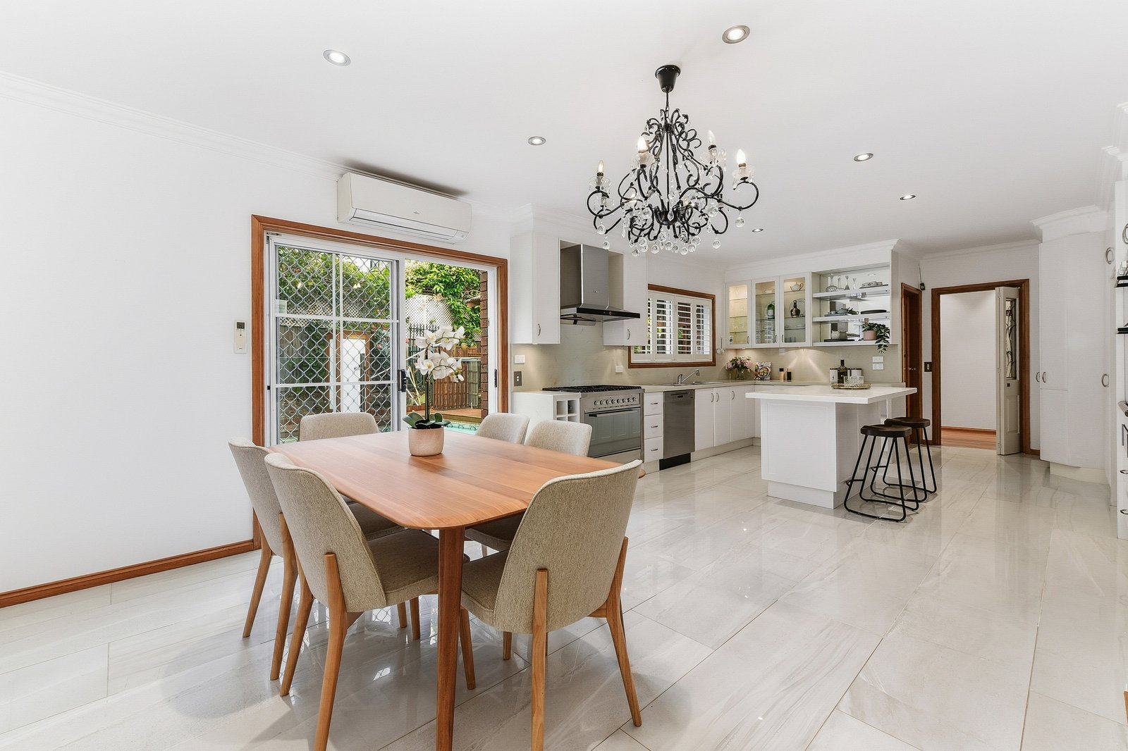 The home is updated and ready to live in, offering generous space for a growing family. Living zones boast high ceilings, modern LED down lights, classic pendant lighting and there are plantation shutters throughout. Luxe timber-look laminate flooring and polished porcelain floor tiles flow through an open-plan layout filled with natural light. Children can retreat to a separate lounge room for harmonious living. Reverse cycle AC, screen doors, security cameras and an alarm system are all quality additions.