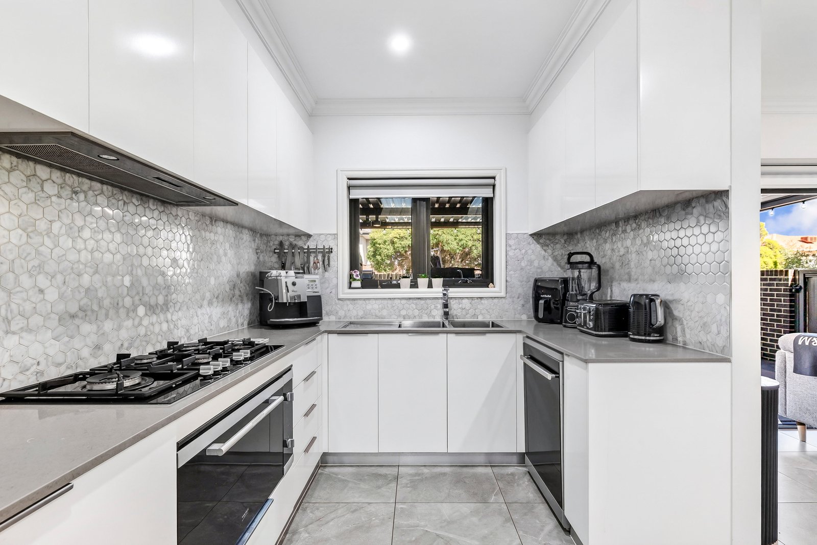 Behind a tall fence, this home welcomes with a lounge and dining room wrapped in its own gardens and complimented by an enormous decked patio that provides a great extension of the living zone or easy entertaining in any weather. Served by a tasteful kitchen furnished with a striking marble splashback, stone topped benches, 900mm gas cooktop, 900mm oven and a dishwasher.