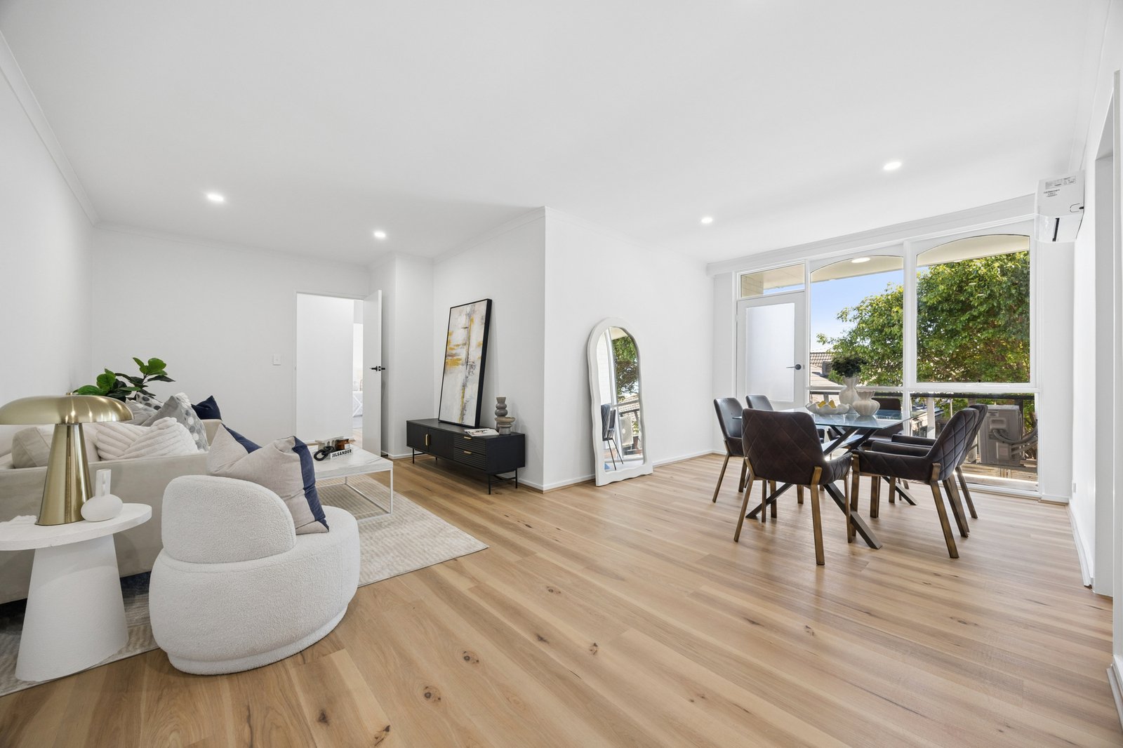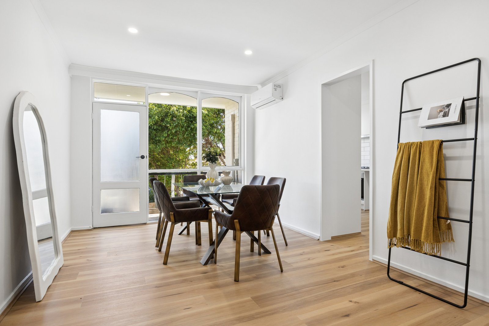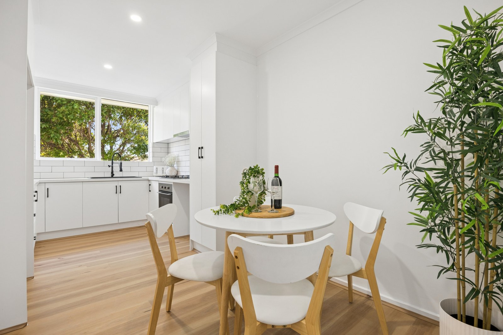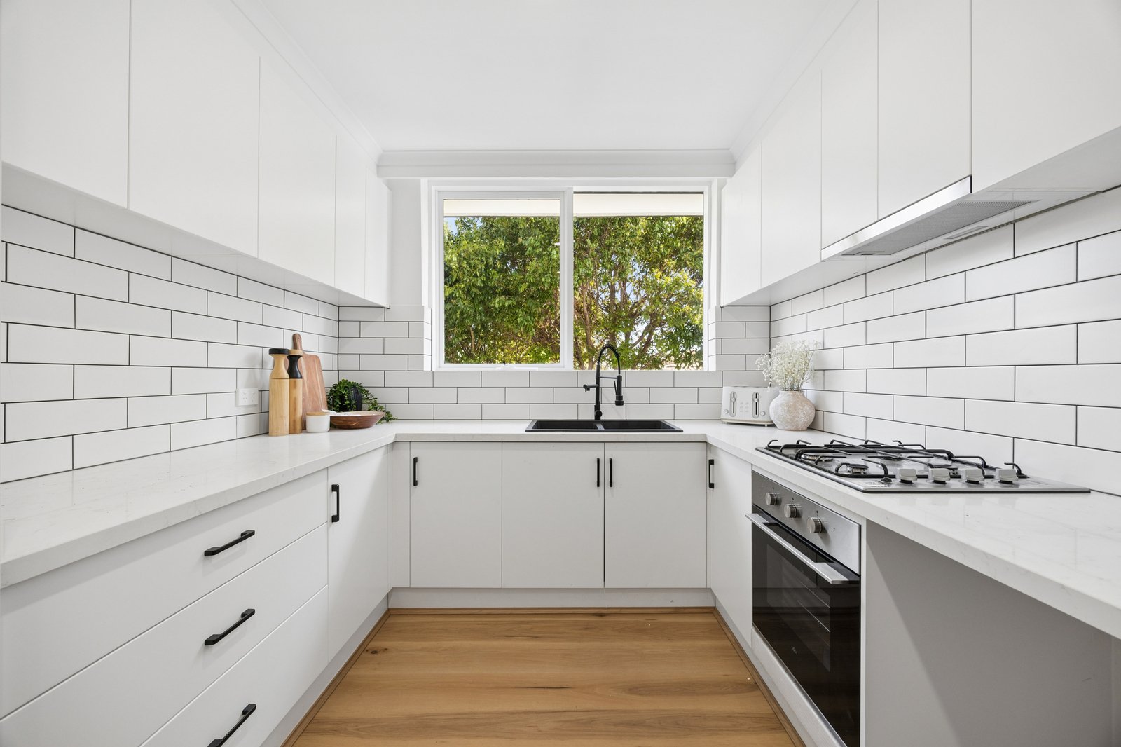 The entry with storage leads into an L-shaped living and dining room that opens up beautifully. One full wall of glass draws in the greenery, while a door connects to the balcony where the same treed aspect carries through, creating a calm, settled atmosphere. Off to one side, the kitchen is well-appointed with stone benchtops, subway tile splashbacks, new appliances and a large window above the sink where the treetops are always in view.