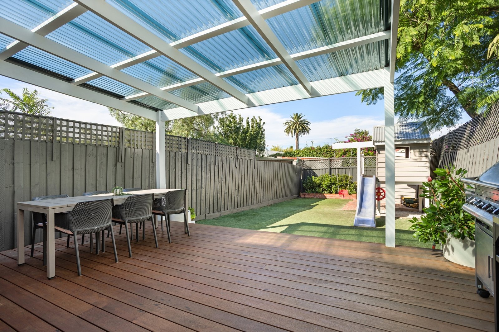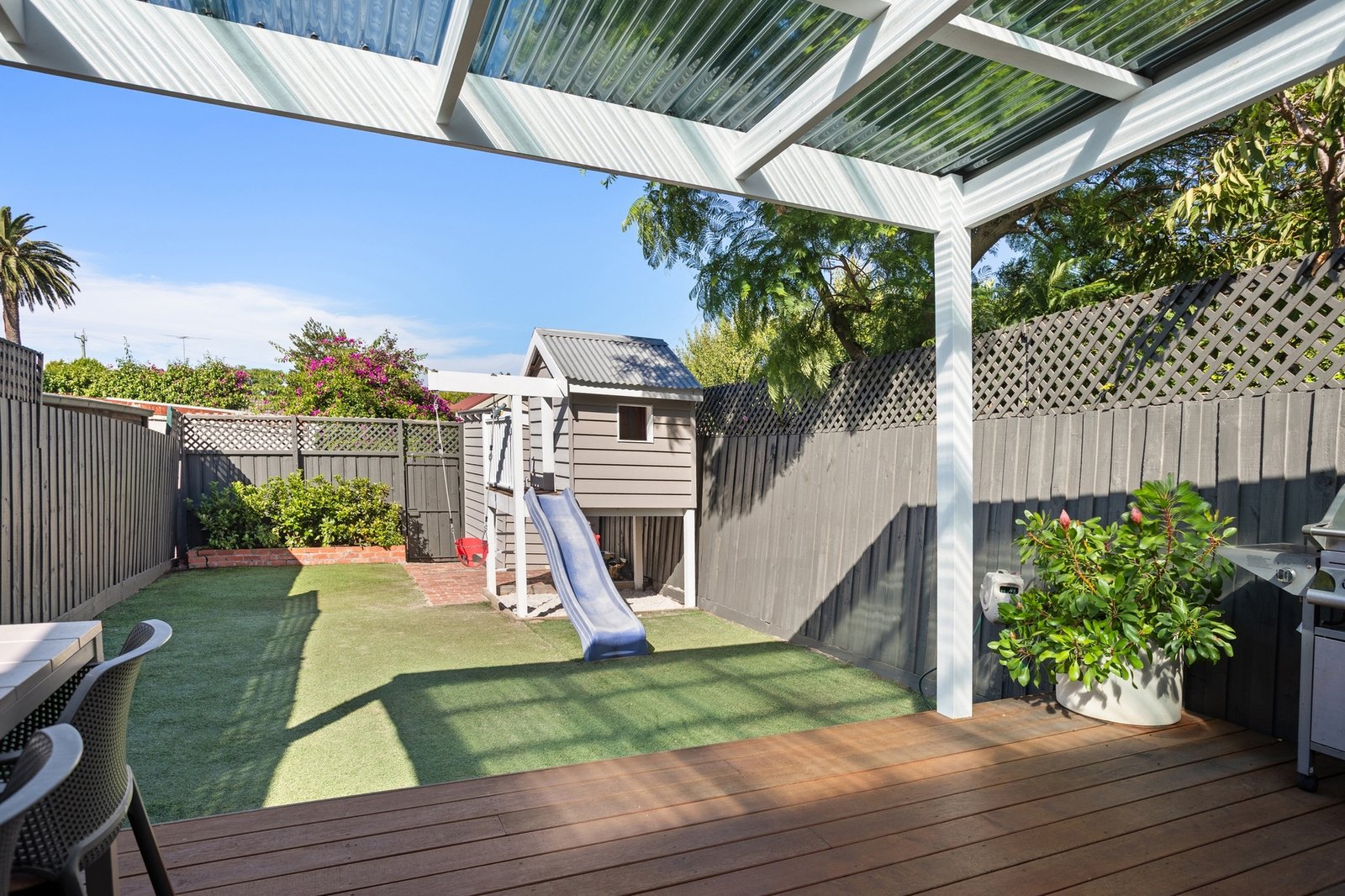 At the heart of the home, an inviting living room with open fire place is complemented by a sleek contemporary kitchen appointed with stone benchtops and stainless steel appliances. Bathed in natural light, the adjoining living area flows seamlessly outdoors to a private, low-maintenance north-east facing garden, complete with a cubby, storage shed and valuable rear right-of-way access offering potential for additional off-street parking.