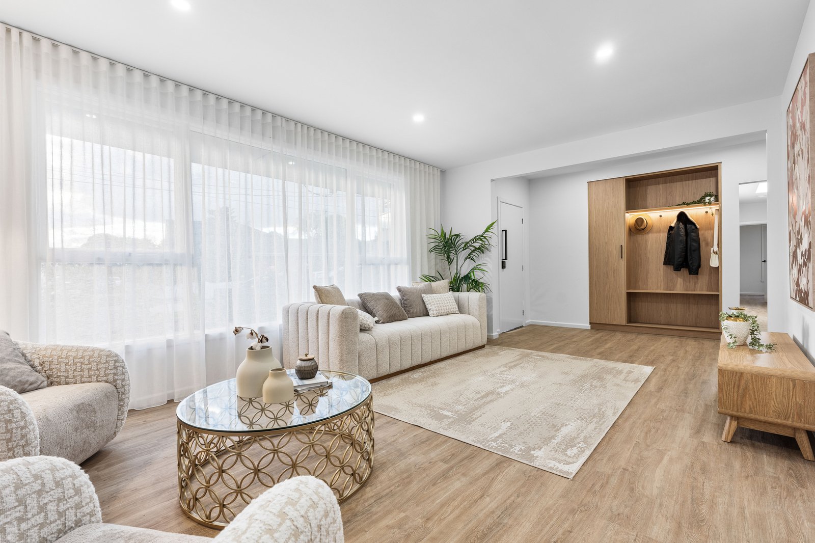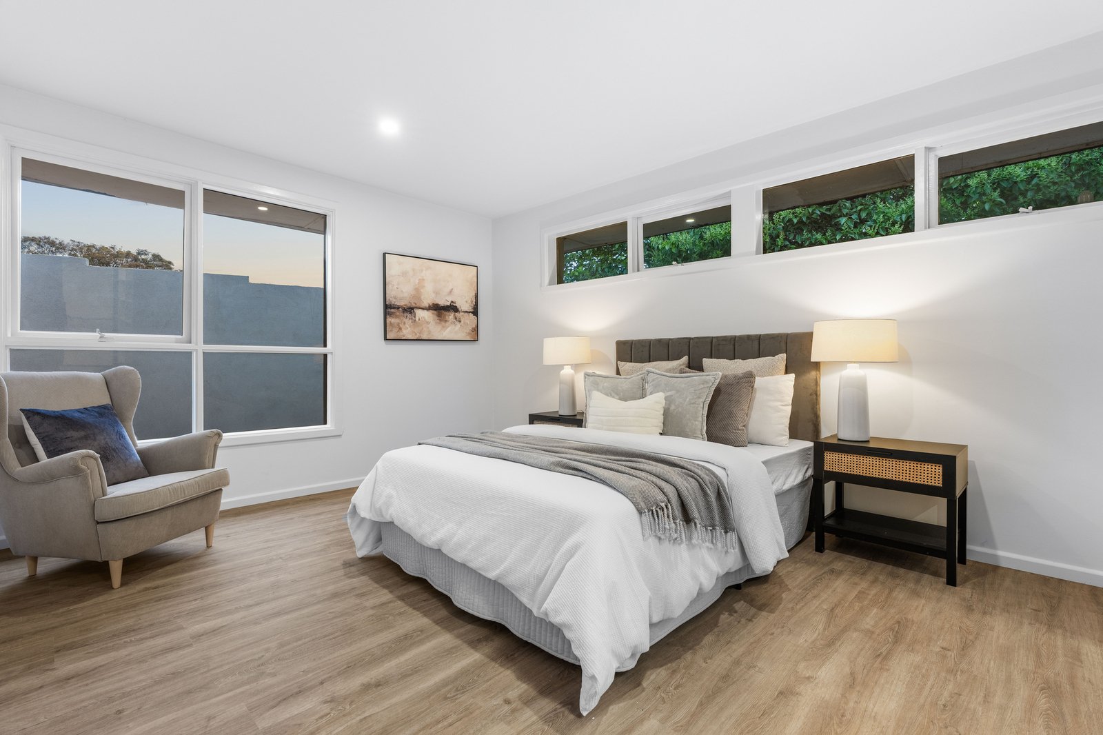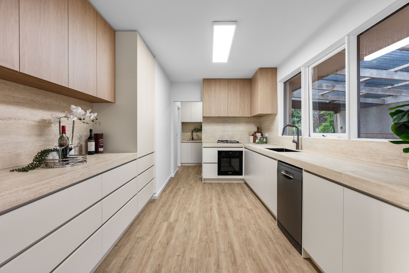 Accommodation requirements are met by four principal bedrooms with robes, a family bathroom, and a parents’ hideaway with walk-in robe and ensuite. Boasting lavish bathrooms with floor-to-ceiling tiling, LED strip lighting and frameless waterfall showers; the home features a gourmet homemaker kitchen, fabulously appointed with premium stone benchtops, Bosch appliances, a suite of new cabinetry, coffee bar, and adjoining laundry/scullery.