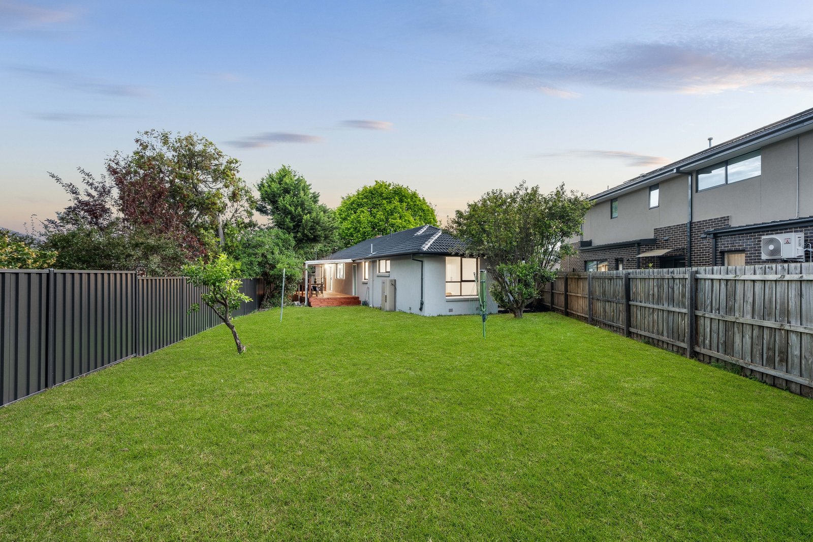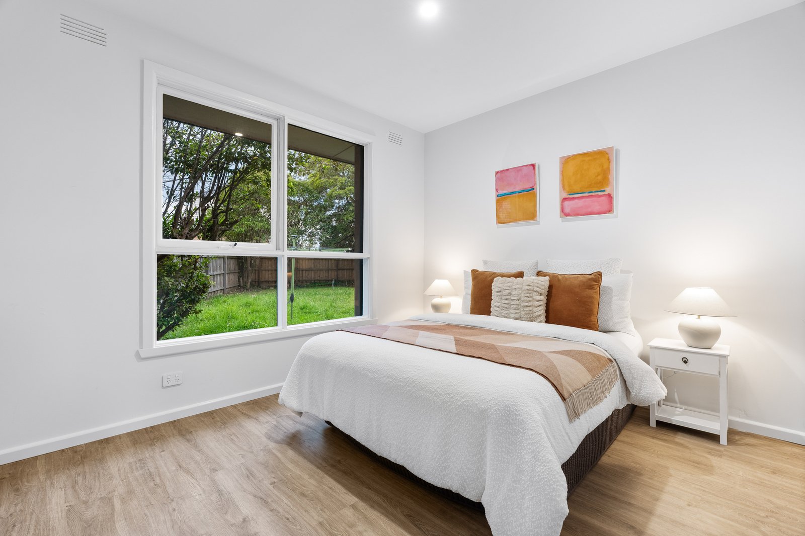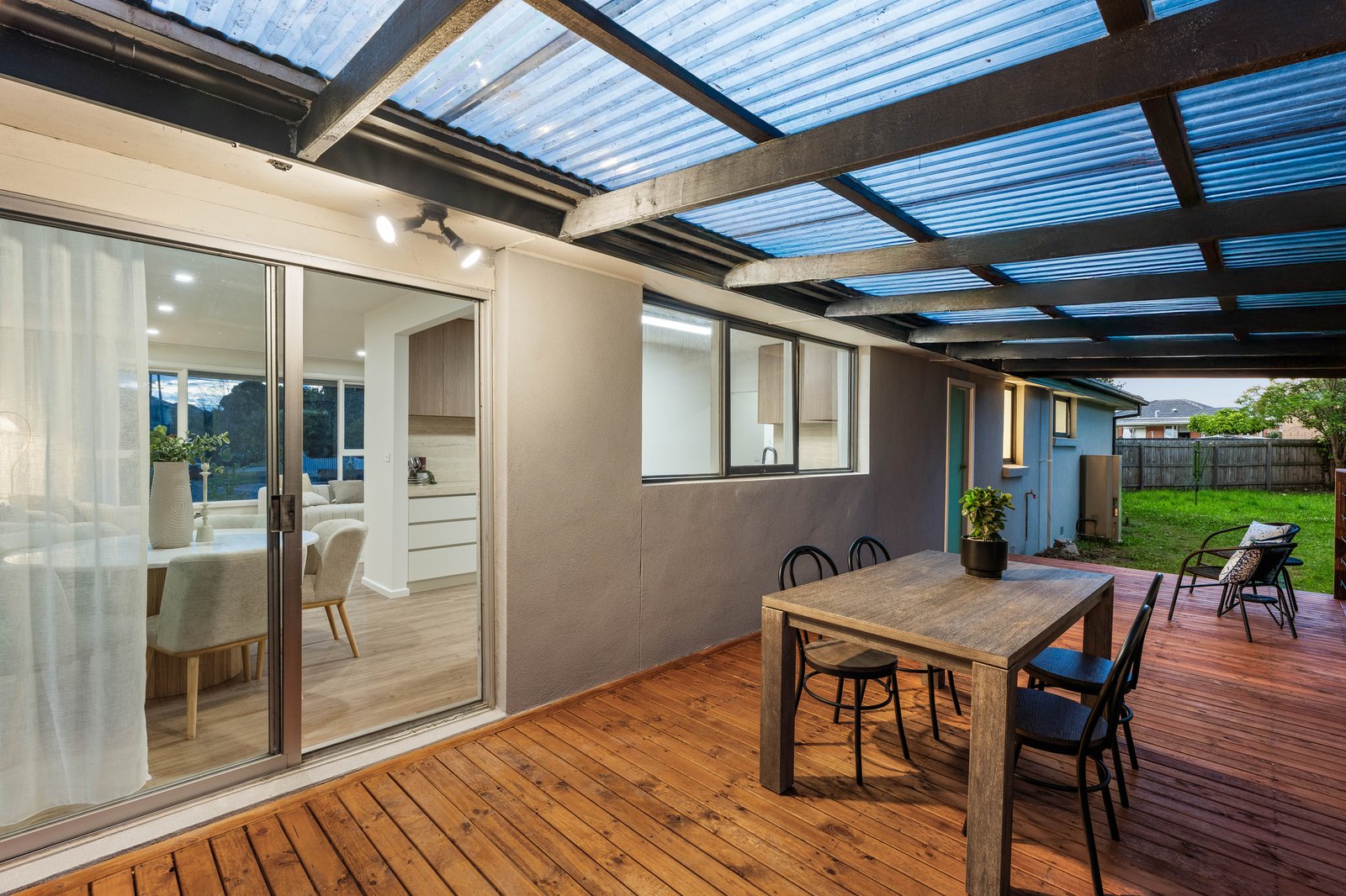 A spacious living and dining zone greets you upon entry. Its white and bright colour palette finds a beautiful counterpoint in the natural accents of hardwood flooring, while sheer curtains work to diffuse the natural light flooding into the property. The eastern wall opens onto an extensive undercover deck, flowing outwards onto substantial north-facing gardens with plenty of space for the kids and pets to play. Its generous 713 sqm (approx) allotment will allow for the establishment of a granny flat if desired (STCA).