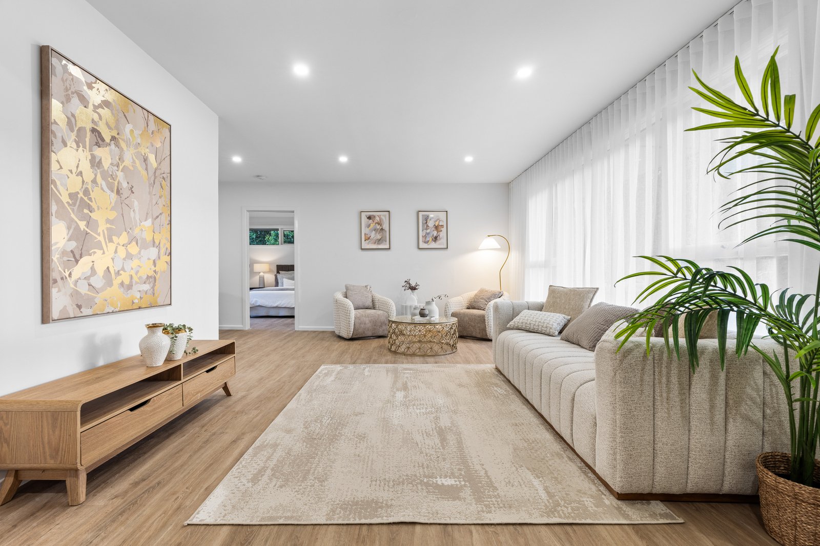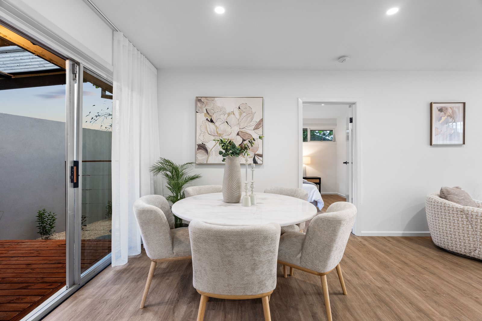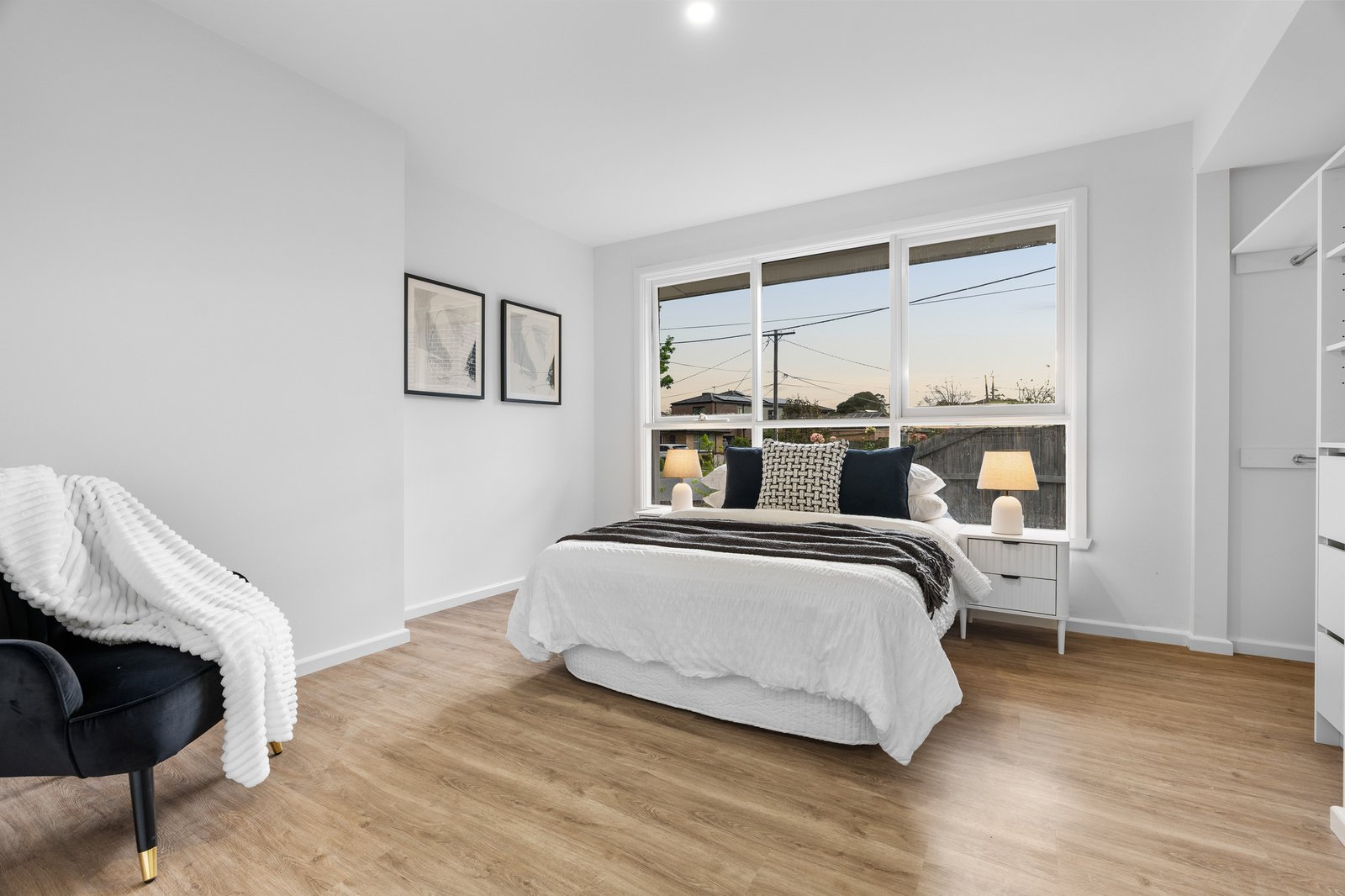 A spacious living and dining zone greets you upon entry. Its white and bright colour palette finds a beautiful counterpoint in the natural accents of hardwood flooring, while sheer curtains work to diffuse the natural light flooding into the property. The eastern wall opens onto an extensive undercover deck, flowing outwards onto substantial north-facing gardens with plenty of space for the kids and pets to play. Its generous 713 sqm (approx) allotment will allow for the establishment of a granny flat if desired (STCA).