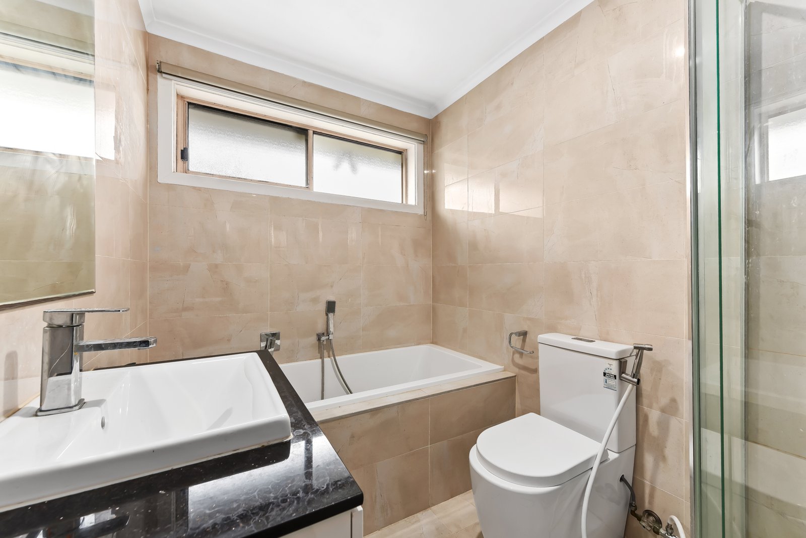 Pristine central bathroom with bathtub