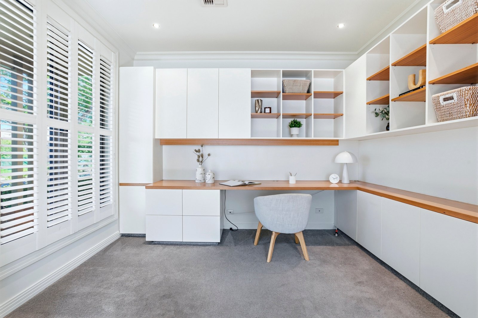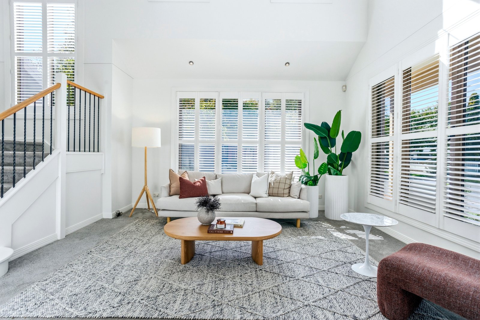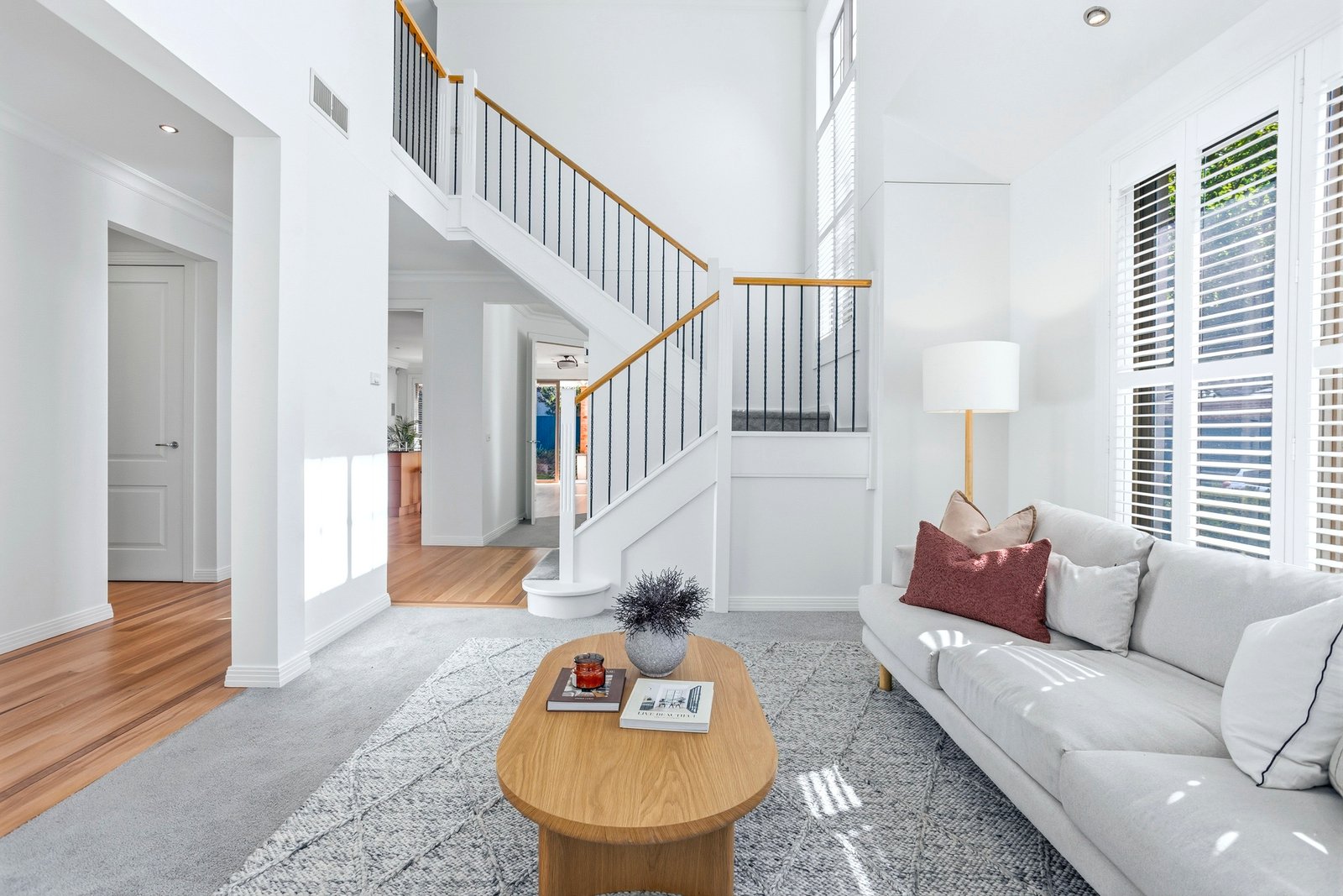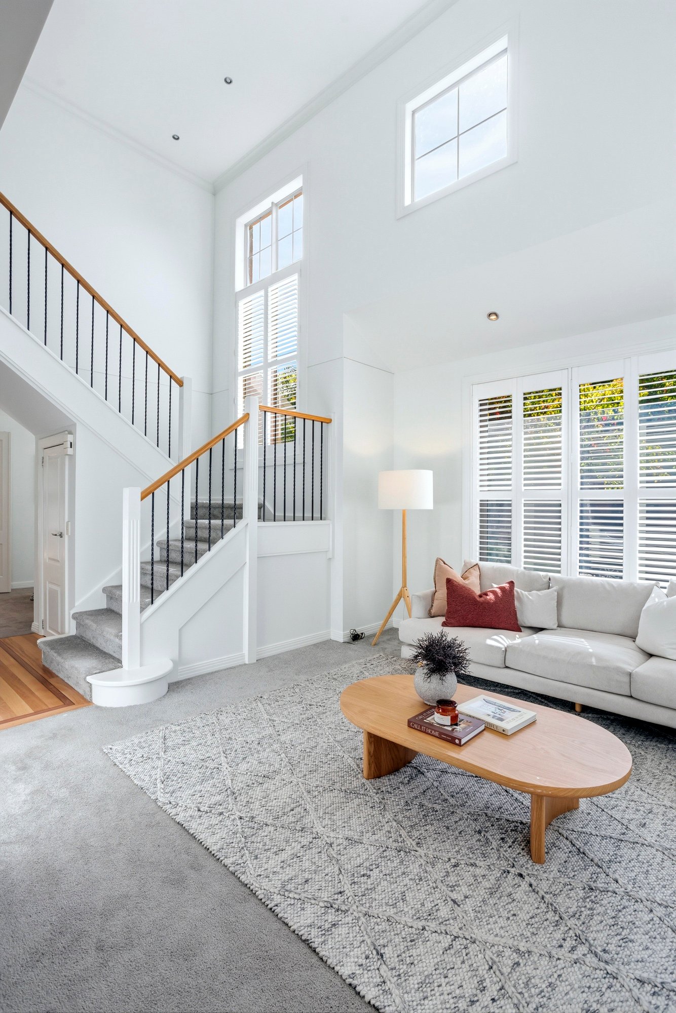 Step inside and you’re immediately greeted by a sense of warmth and light. A dedicated study with built-in shelving sits just off the entry, while a separate living room to the right impresses with soaring ceilings and oversized windows framed by plantation shutters - creating a calm, sunlit retreat. A central powder room, full laundry and an additional lounge (or optional fourth bedroom) provide flexibility for growing families or those working from home.