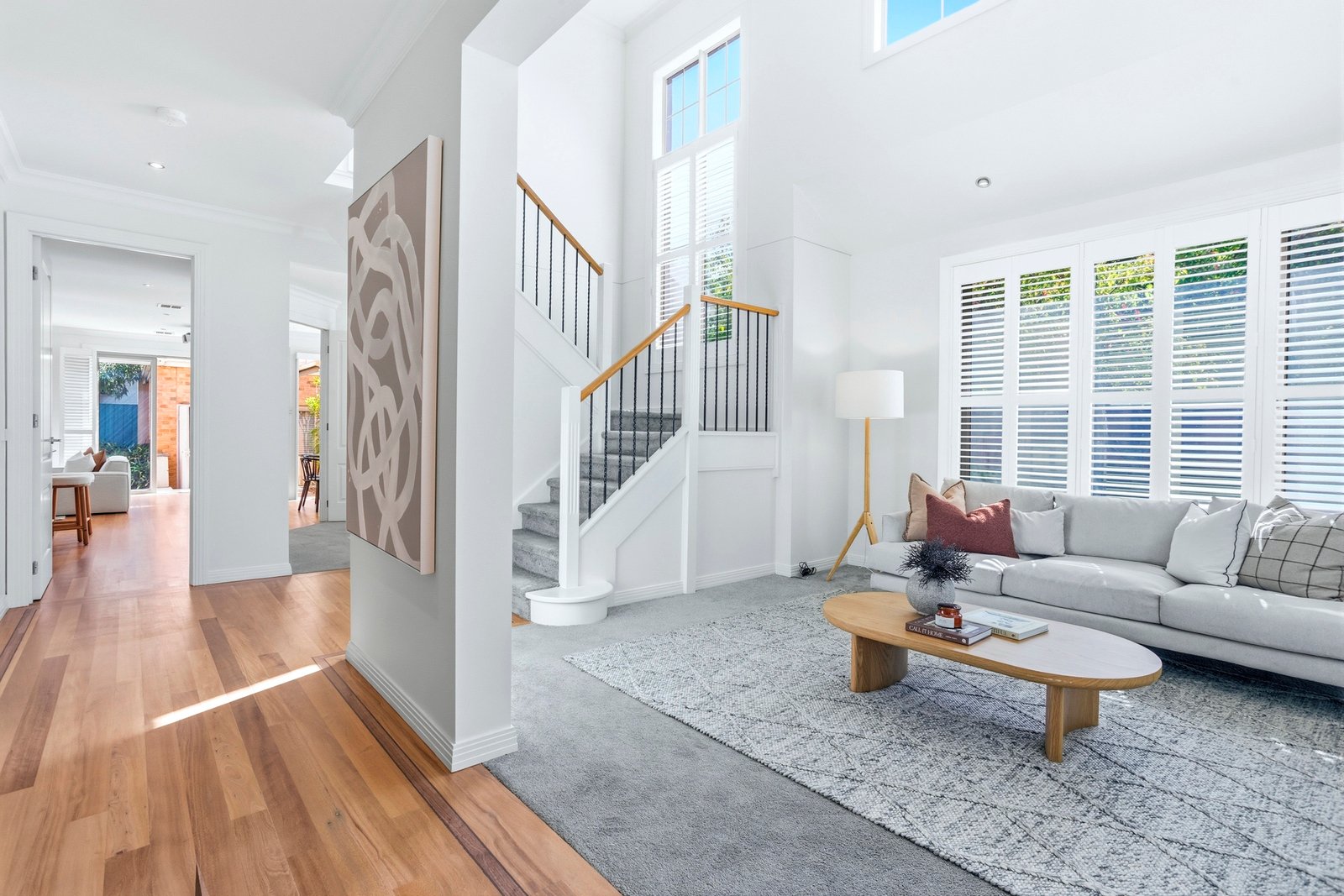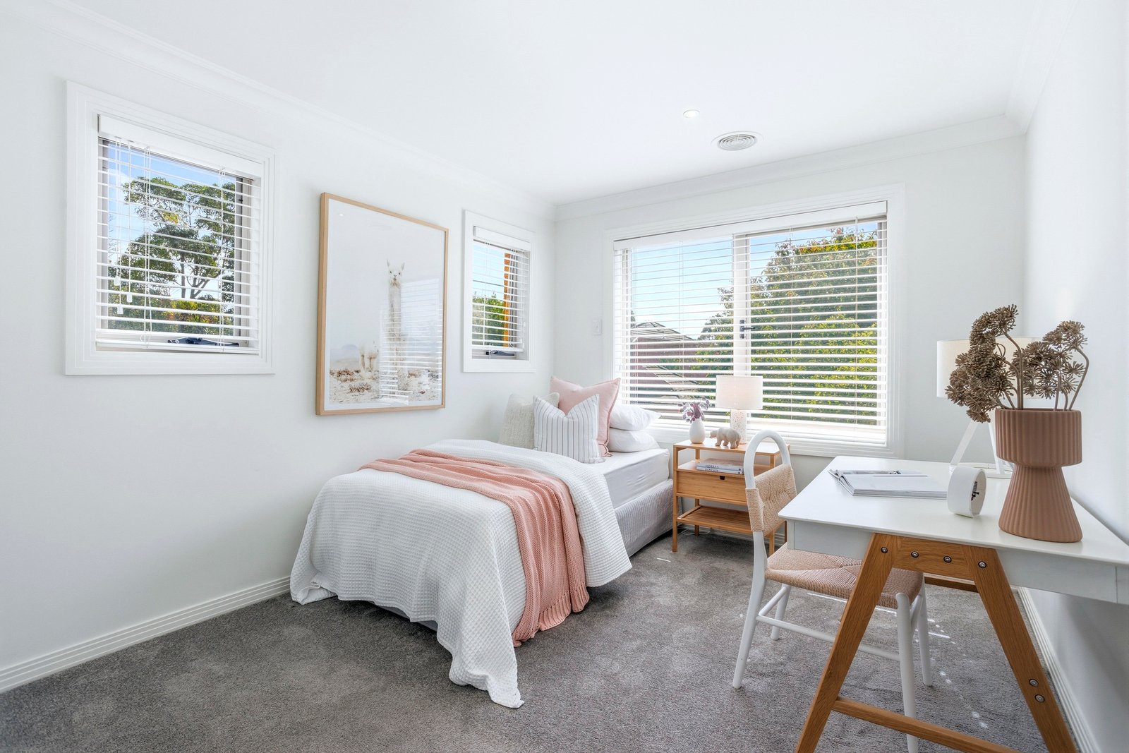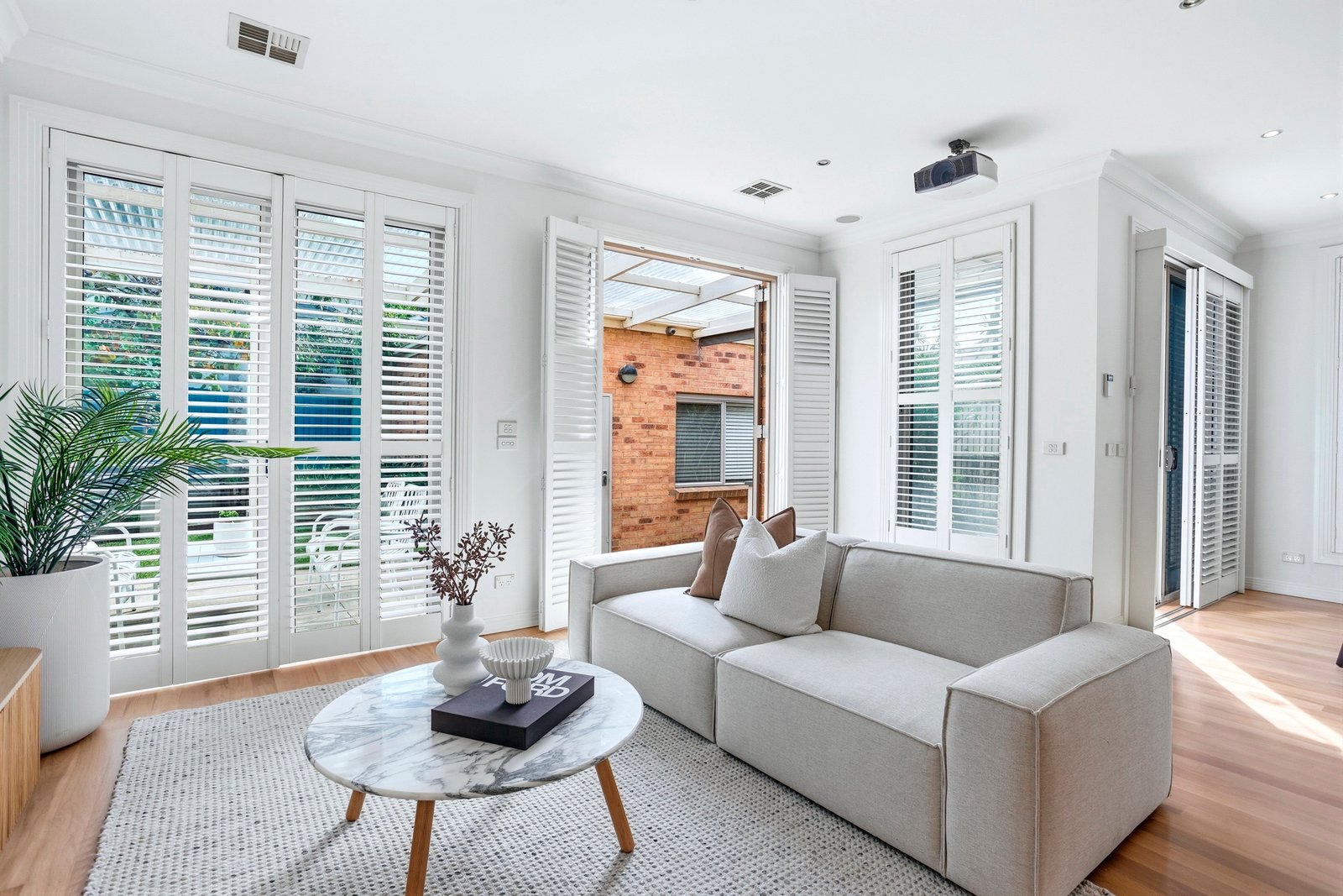 Step inside and you’re immediately greeted by a sense of warmth and light. A dedicated study with built-in shelving sits just off the entry, while a separate living room to the right impresses with soaring ceilings and oversized windows framed by plantation shutters - creating a calm, sunlit retreat. A central powder room, full laundry and an additional lounge (or optional fourth bedroom) provide flexibility for growing families or those working from home.