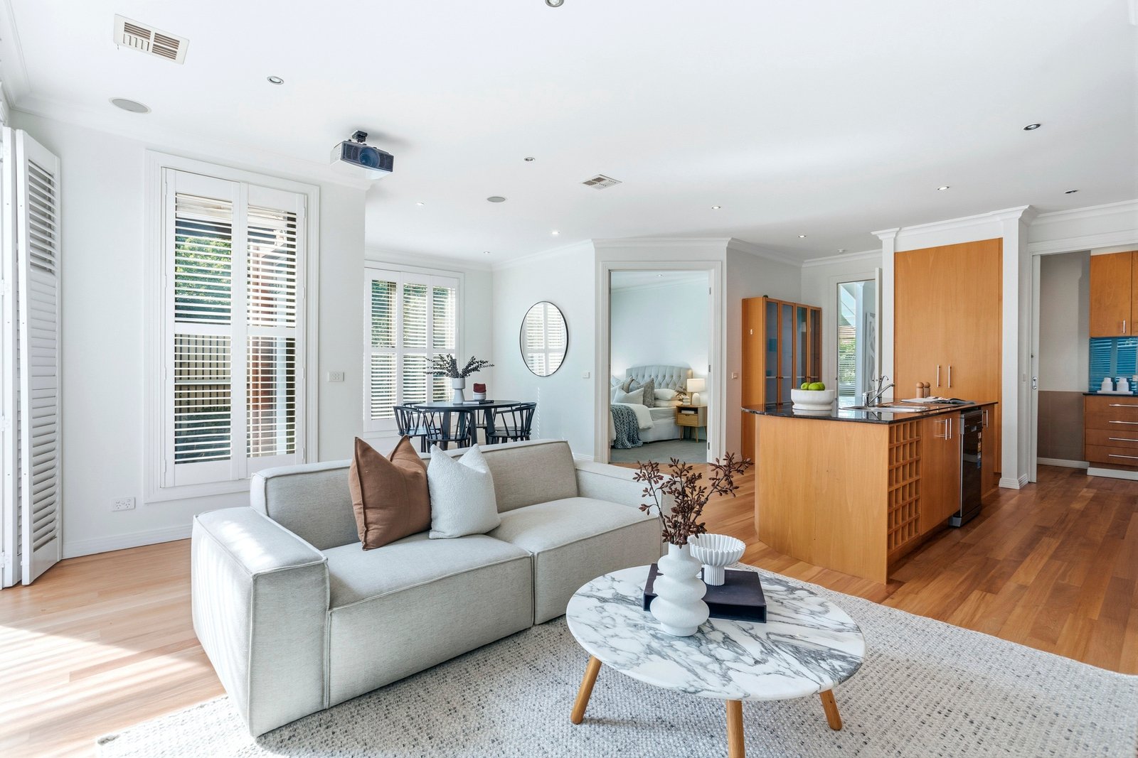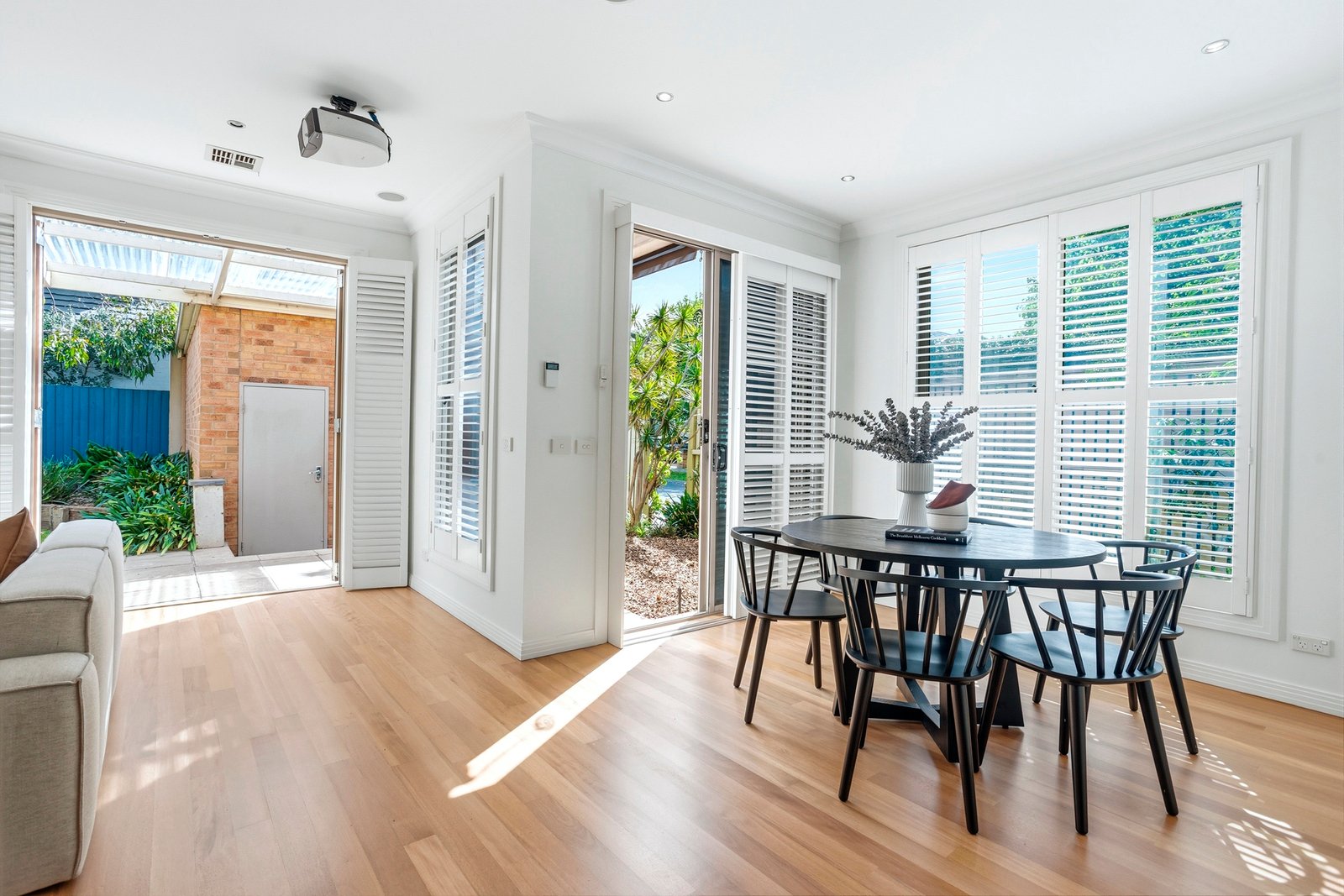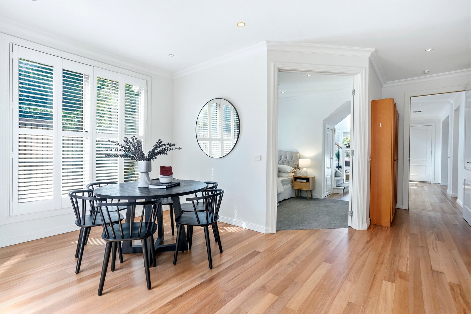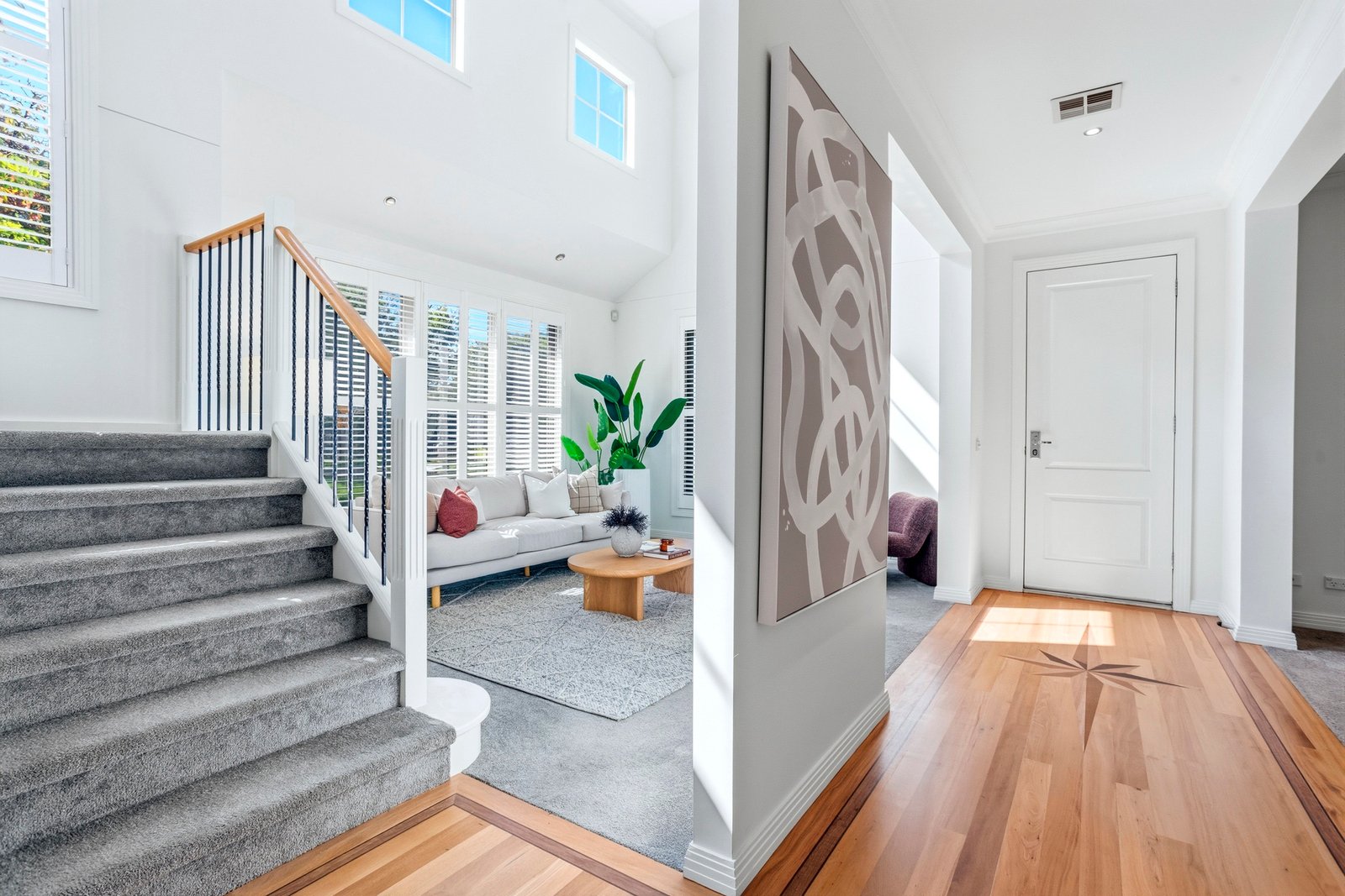 Step inside and you’re immediately greeted by a sense of warmth and light. A dedicated study with built-in shelving sits just off the entry, while a separate living room to the right impresses with soaring ceilings and oversized windows framed by plantation shutters - creating a calm, sunlit retreat. A central powder room, full laundry and an additional lounge (or optional fourth bedroom) provide flexibility for growing families or those working from home.