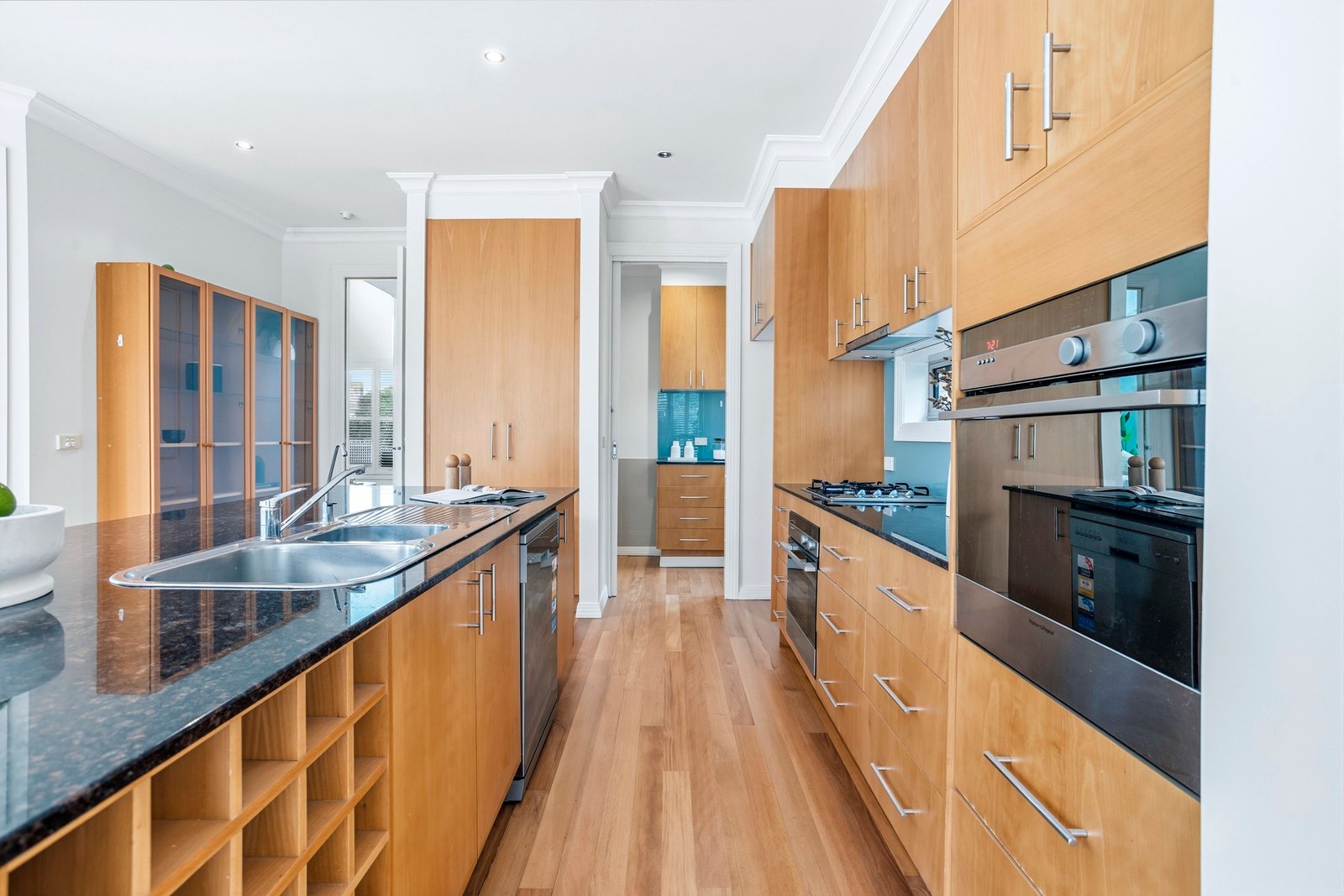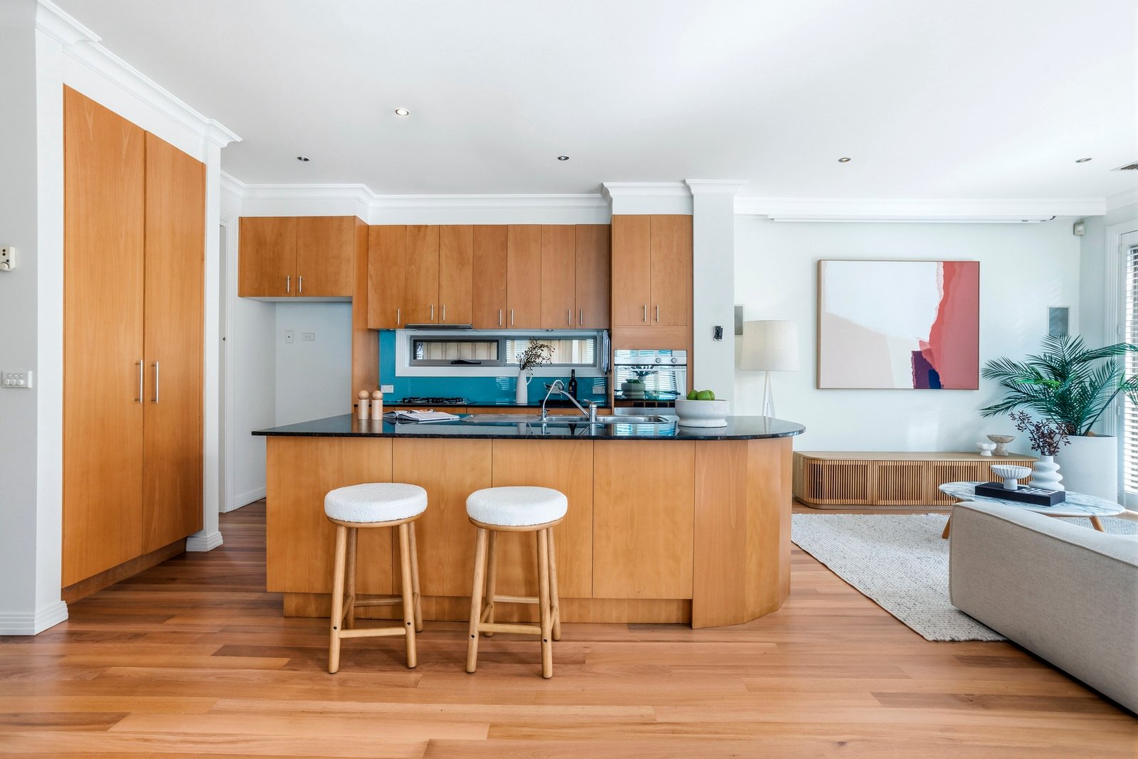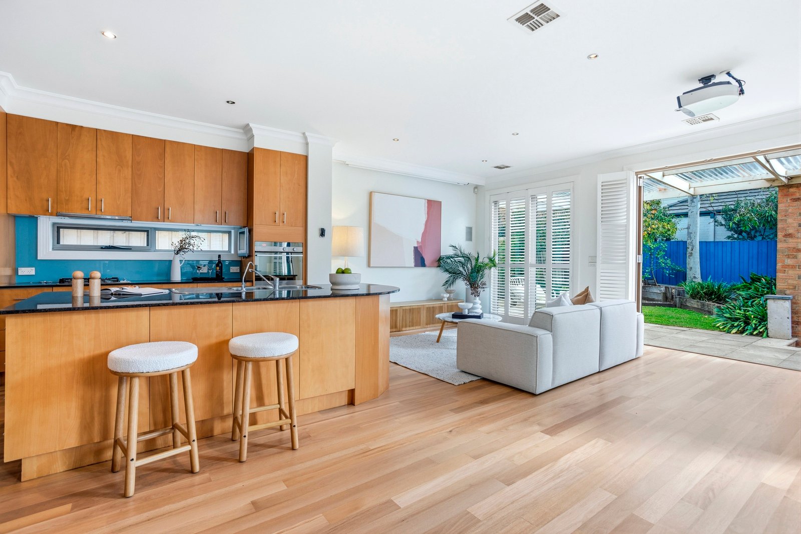At the rear, the home opens into a generous open-plan domain where everyday living and entertaining come together. The kitchen is both practical and inviting, featuring timber cabinetry, a stone-topped island bench, wine storage, quality appliances and ample workspace. Sliding doors extend the living space outdoors to a covered, paved entertaining area and easy-care garden - perfect for relaxed weekends and family gatherings.