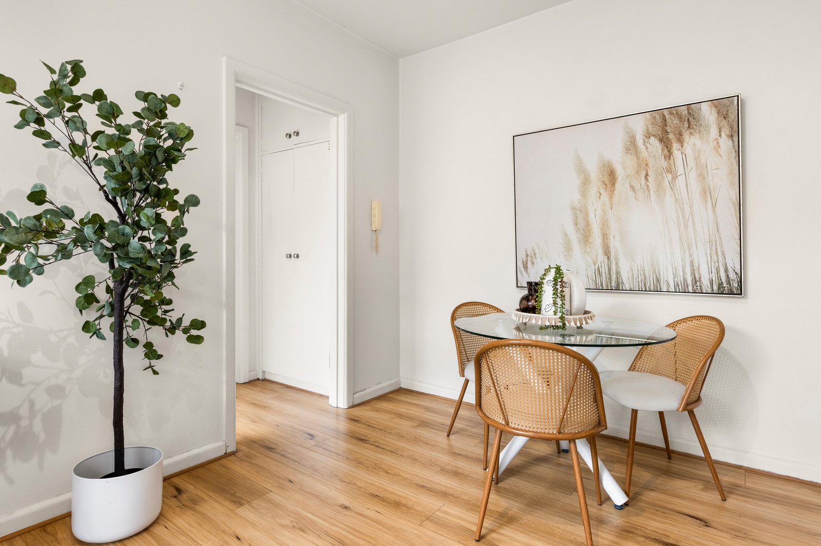 Boasting a large internal layout, the generous open-plan living and dining area is enhanced by warm floorboards and a full wall of windows, inviting abundant natural light and a tranquil leafy outlook. The stylishly renovated kitchen features timeless finishes, gas cooking, and excellent storage, making it as functional as it is appealing.