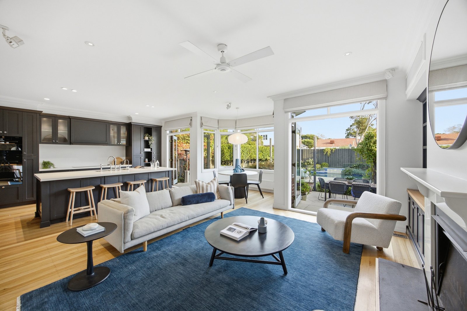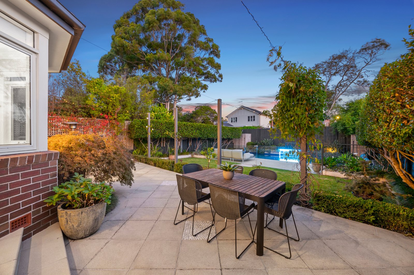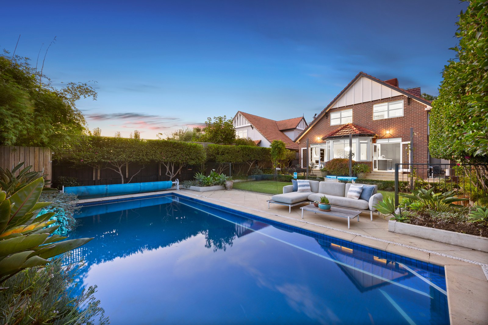 French doors extend the living domain outdoors, where paved entertaining zones step down to a broad lawn and pool terrace framed by clipped hedging, creating a setting that is private and highly functional.