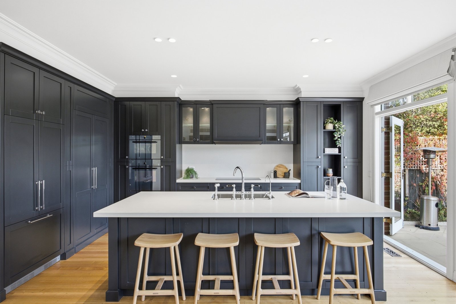 The kitchen adopts the same darker palette, where moody cabinetry unites with natural stone surfaces and a generous island. A suite of premium appliances including VZUG induction cooktop and double ovens, integrated Fisher & Paykel refrigeration, Vintec wine fridge, and extensive storage are delivered through a clean, highly resolved fit-out.