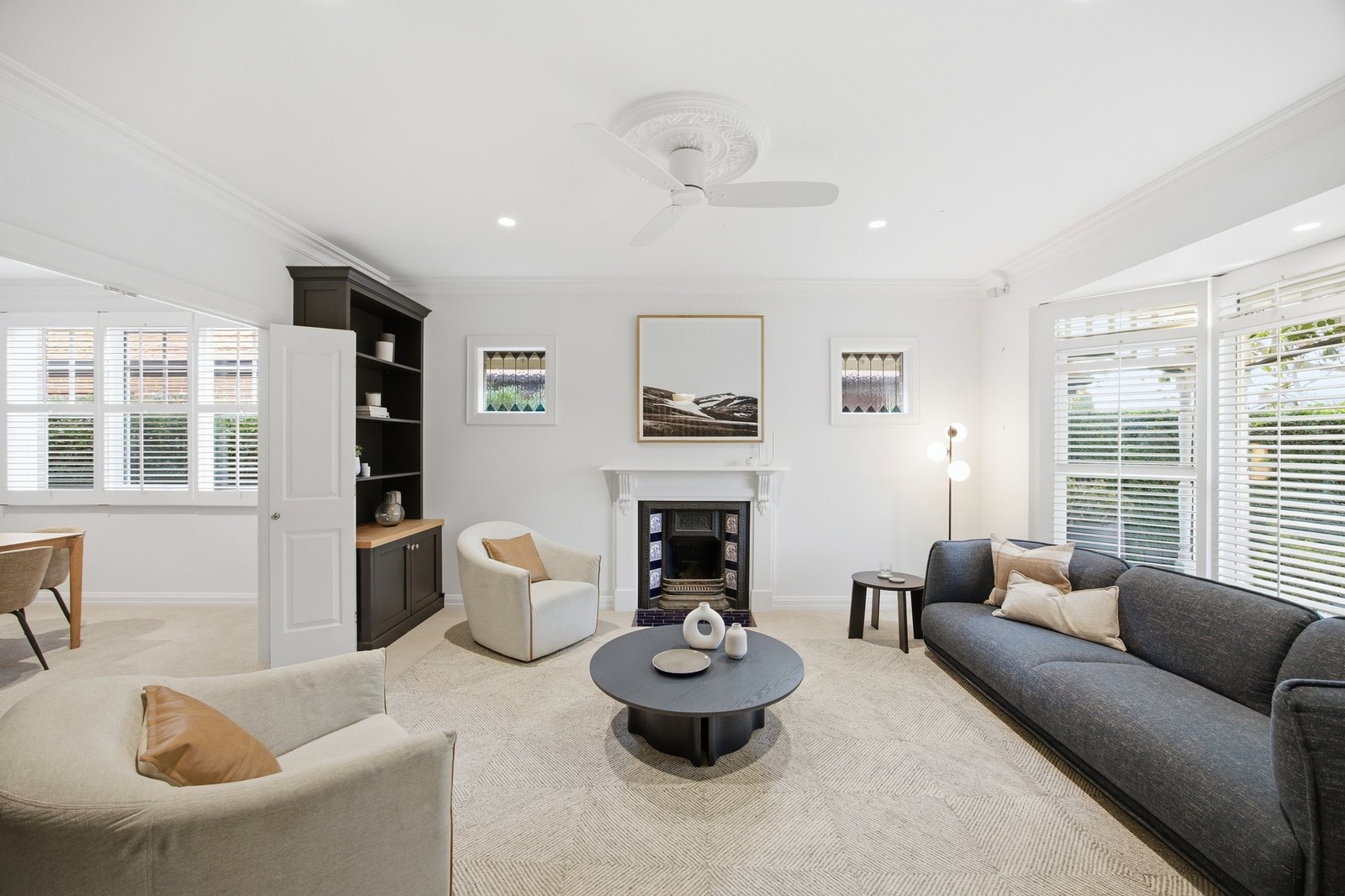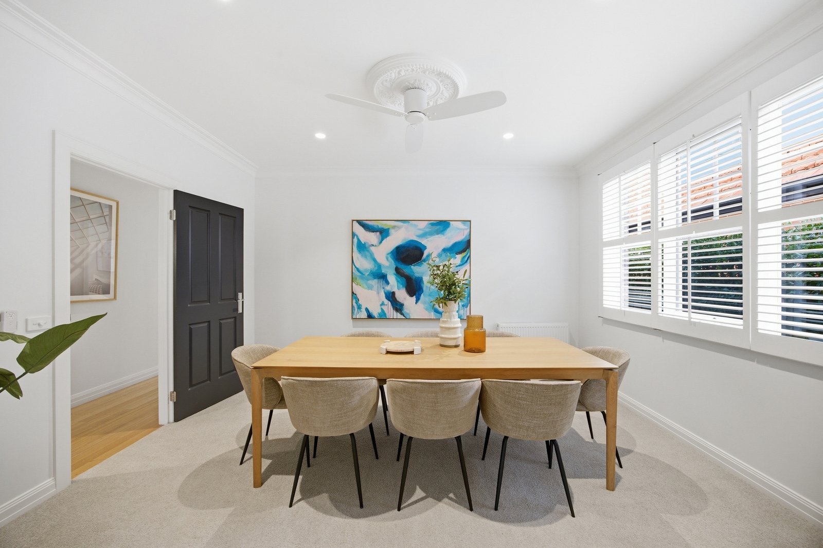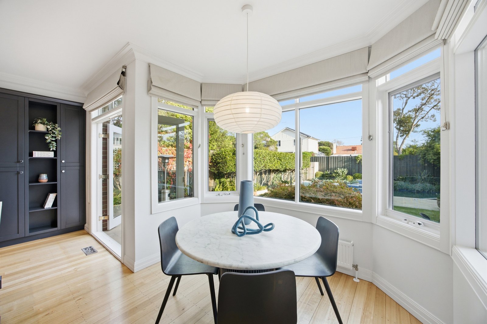 At the front, the formal lounge is anchored by a north-facing bay window, where light settles across the room through the day. A fireplace with a detailed mantel, ceiling roses and stained glass windows reference traditional form with clarity and control.