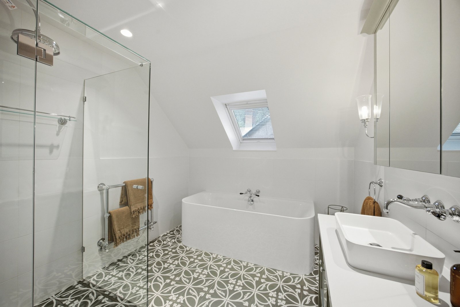 Two further bedrooms are well proportioned and fitted with mirrored robes and integrated desks. They share a central bathroom incorporating a bath and separate shower, where decorative finishes introduce subtle character.