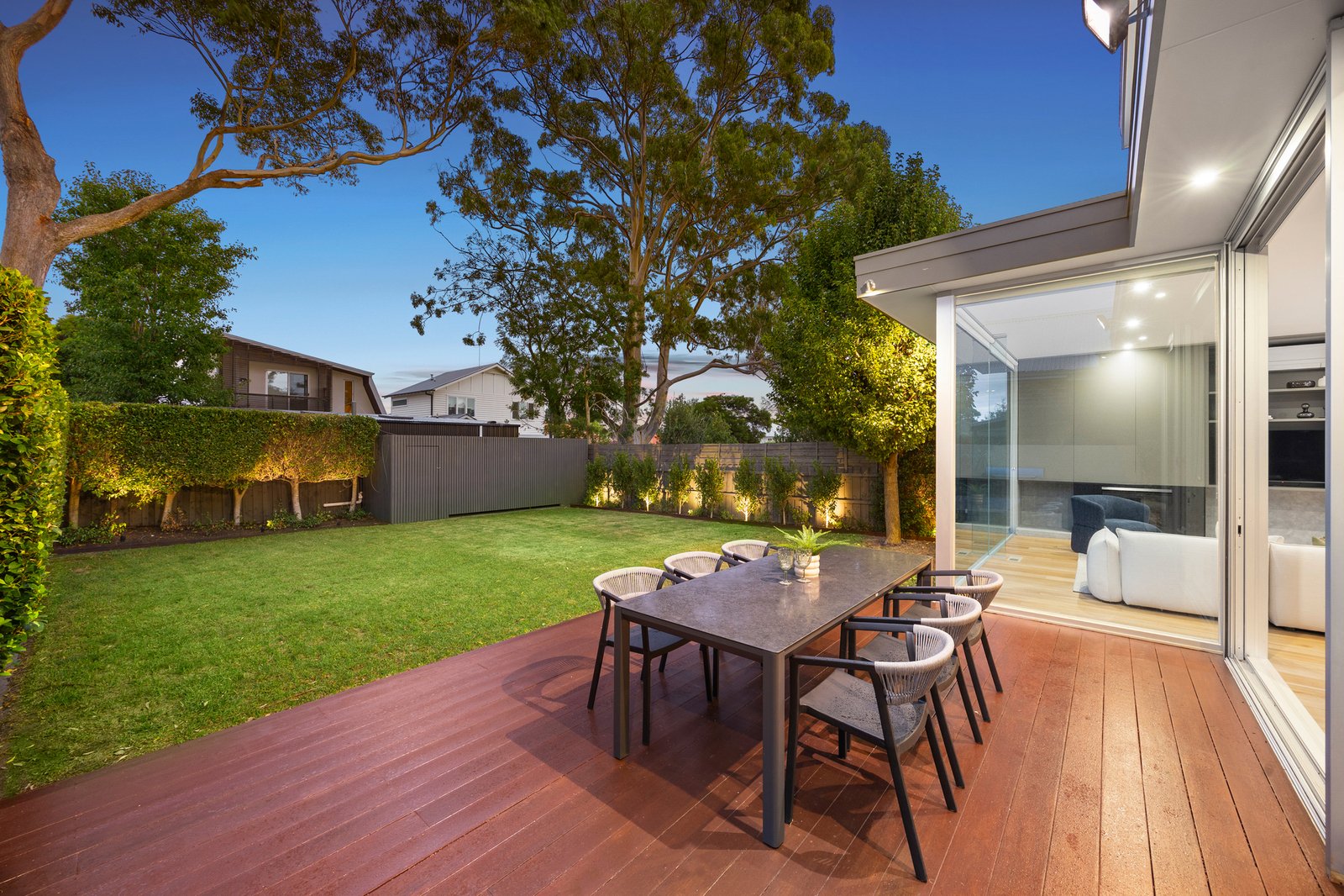 A substantial timber deck extends from the dining area, where a built-in barbeque and integrated bench support effortless outdoor preparation and serving. Beyond, a deep lawn is embraced by established plantings offering generous space for children, entertaining and long afternoons spent outdoors.