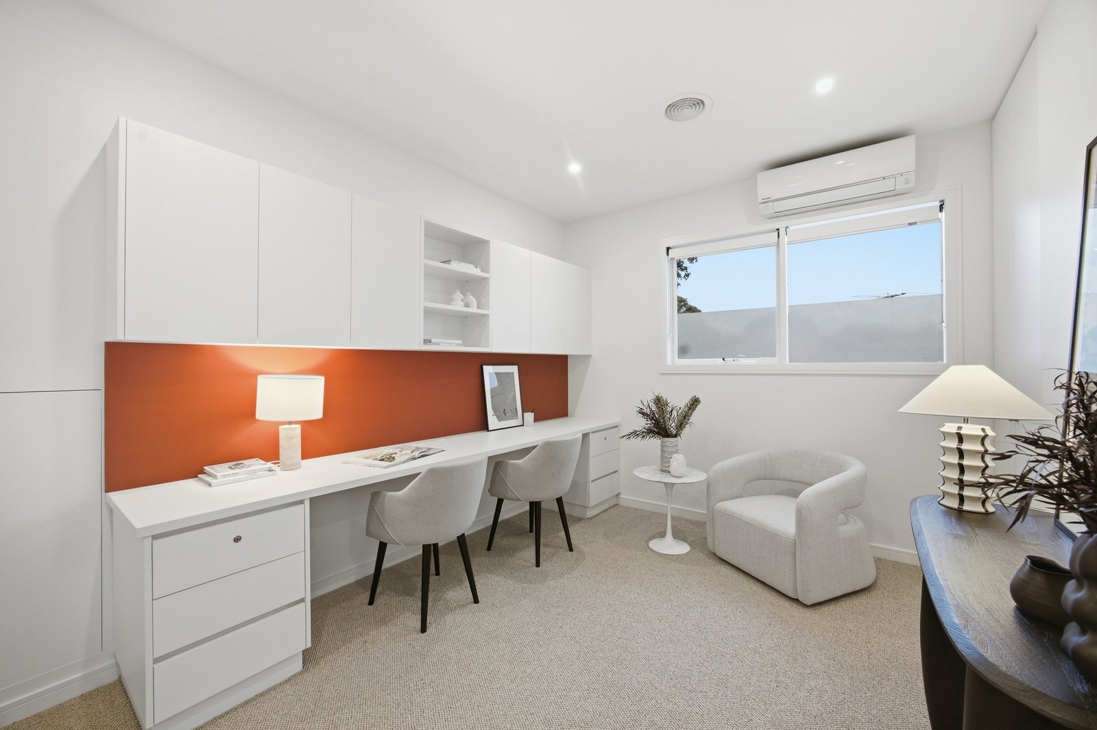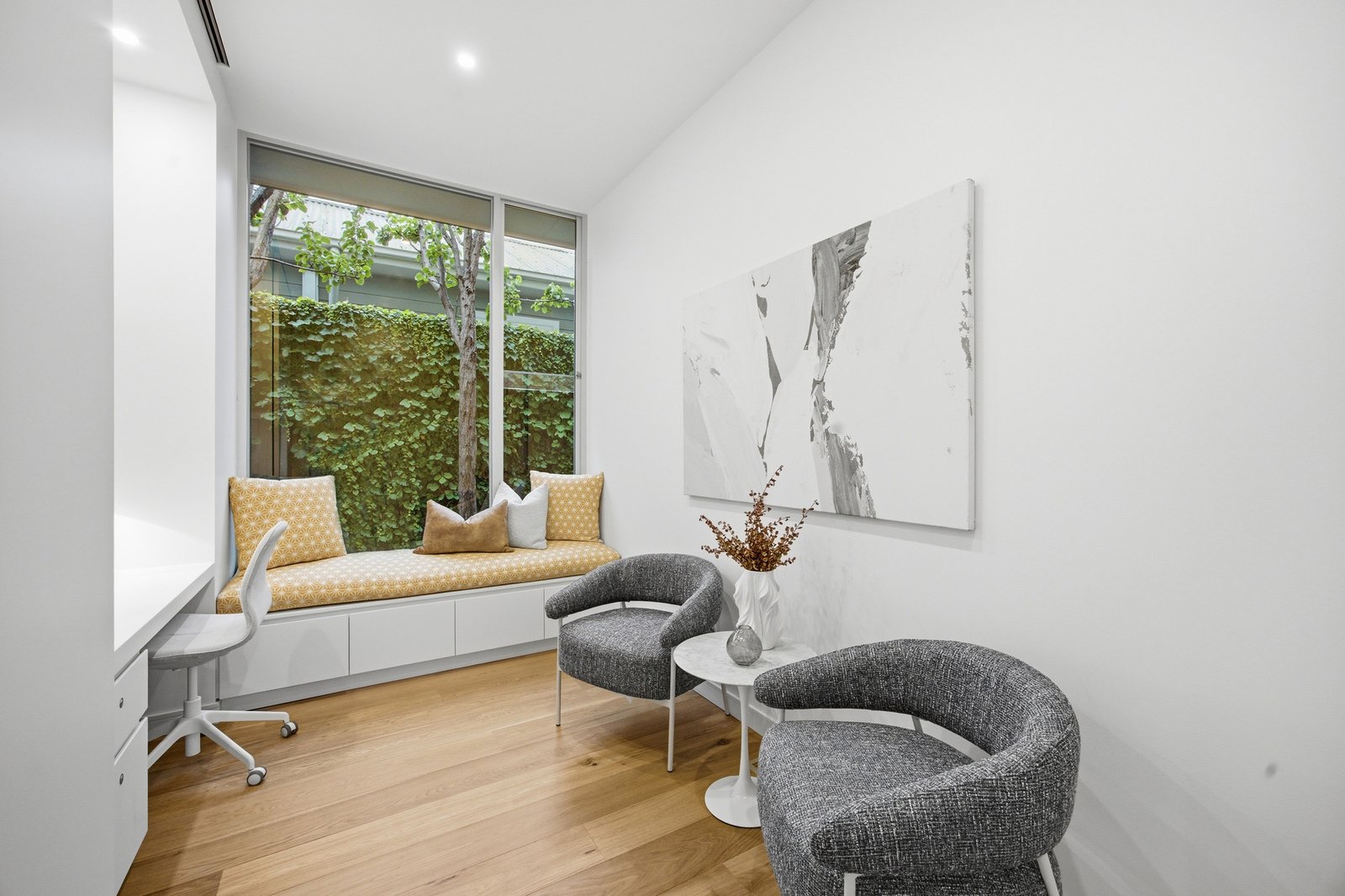 Further along the hall, a fitted study with integrated cabinetry and a window seat, creates a peaceful, functional space as the layout begins to open.