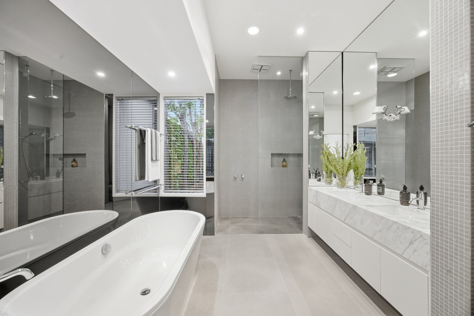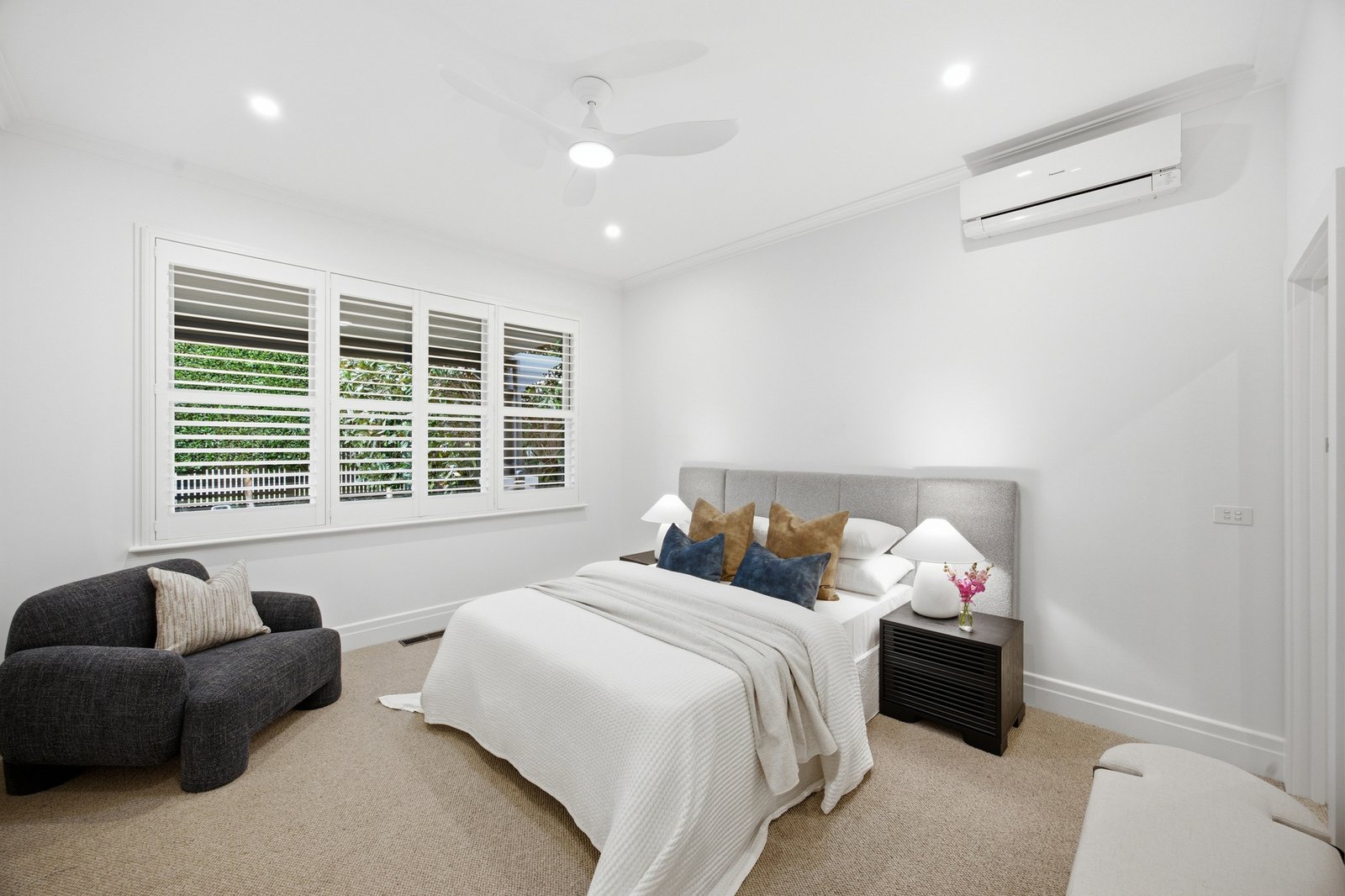Accommodation is thoughtfully arranged, with a ground-floor main bedroom suite enjoying garden outlooks and a sense of separation. A substantial walk-in robe precedes a decadent ensuite with marble surfaces, where a freestanding bath, dual vanities and walk-in shower create a space of genuine indulgence.
