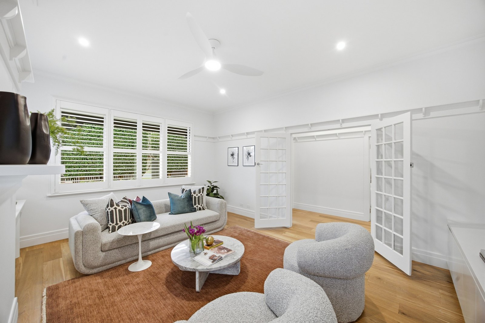 Double doors open to a central hallway where engineered oak floors bring warmth to the generous proportions. A north-facing lounge is immersed in garden outlooks, establishing an immediate connection to the landscape, while glass doors allow the space to be closed off when required.