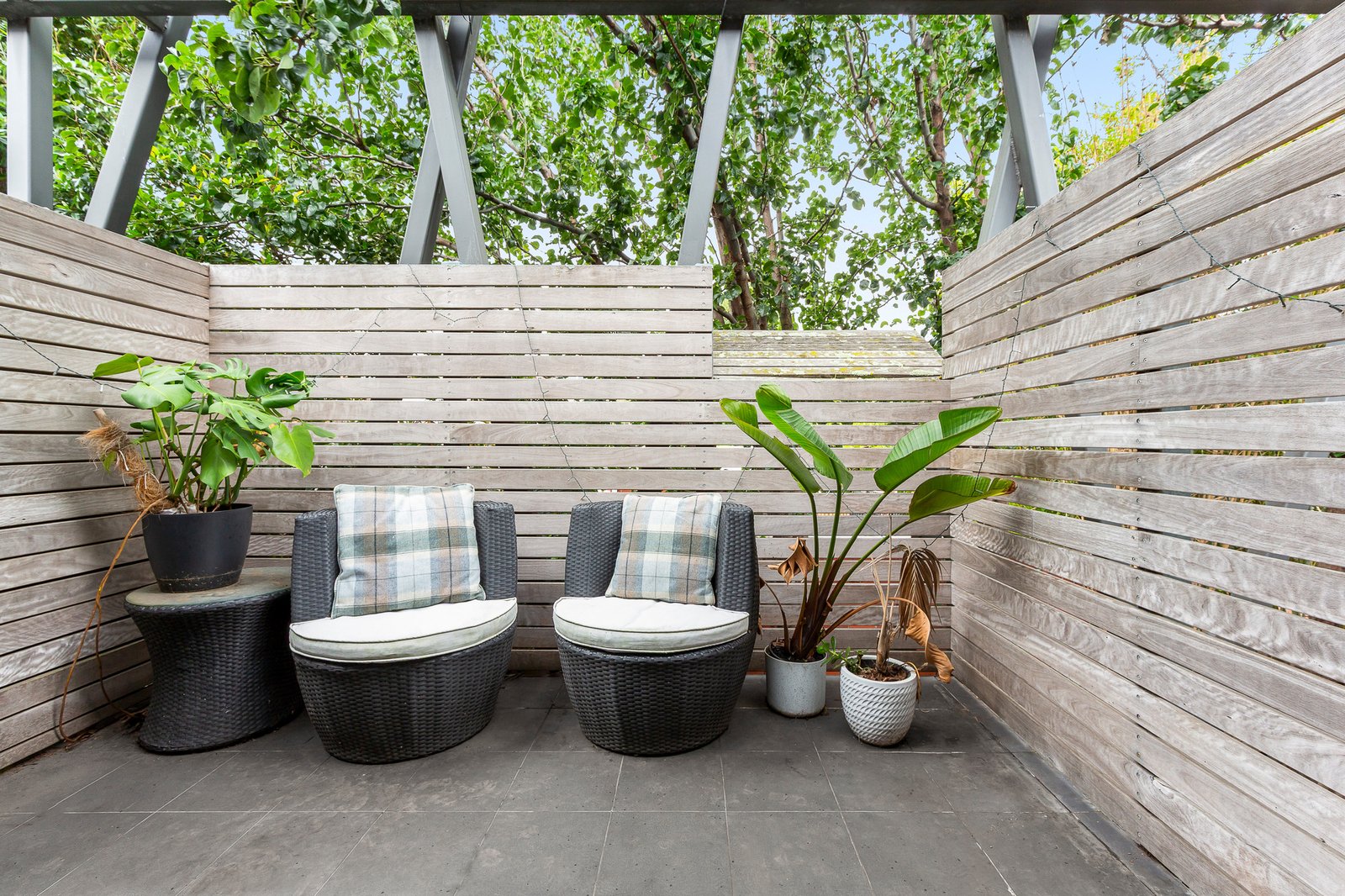 The generous double bedroom includes built-in robes and is serviced by a stylish central bathroom, while a European laundry adds everyday convenience. Positioned quietly at the rear of the block, the apartment enjoys excellent privacy with no direct overlookers, along with a north-facing balcony framed by leafy greenery—perfect for soaking up the afternoon sun.