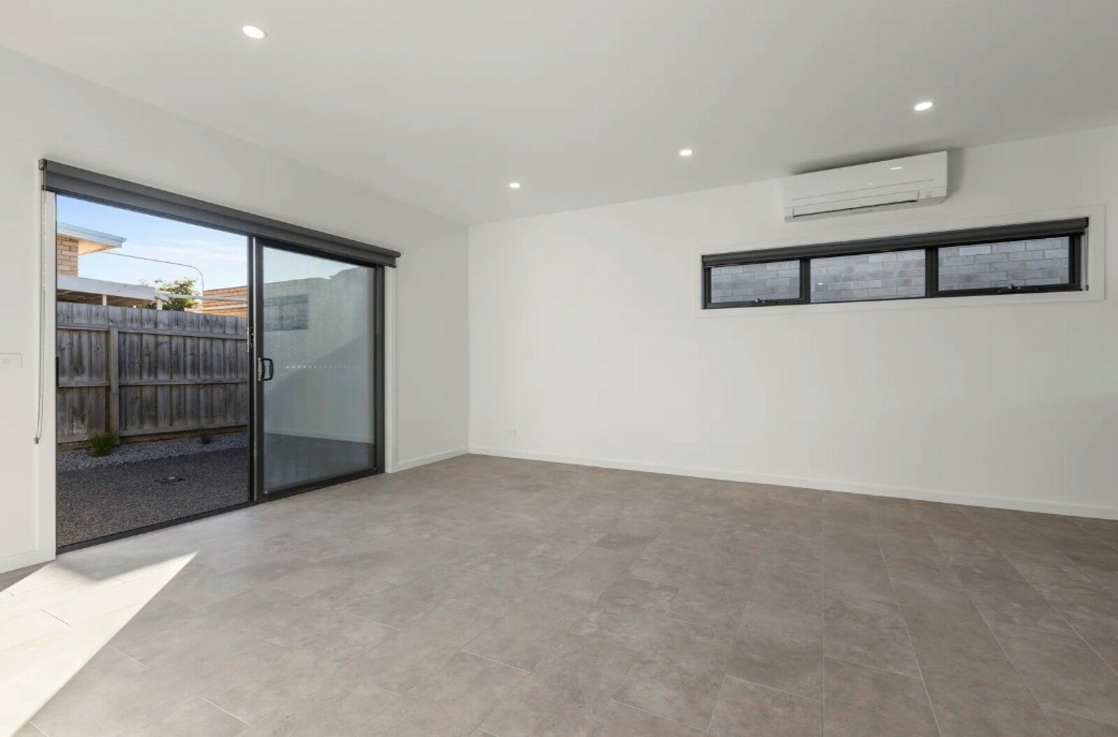 The open-plan living and dining zone is filled with natural light and flows seamlessly into a modern kitchen, fitted with an induction cooktop, electric oven, and dishwasher. A split-system unit provides year-round climate control for added comfort.