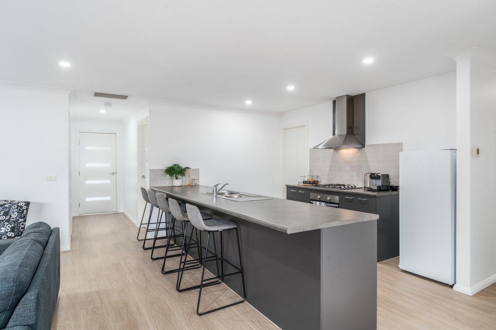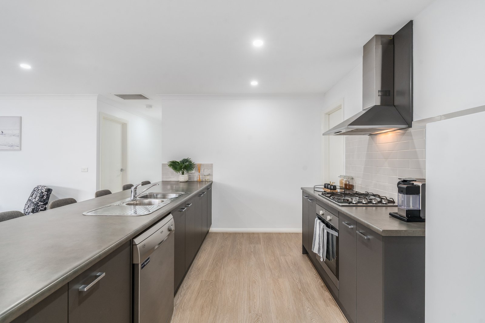 Inside, the home continues to impress with a spacious and light-filled open plan living and dining zone, seamlessly connected to the outdoors via sliding doors on both sides—creating the perfect indoor-outdoor flow. At the heart of the home, the modern kitchen is sure to delight, featuring stainless steel appliances including a gas cooktop, oven, rangehood and dishwasher, dual sinks, subway tile splashback, ample bench space, abundant storage, and a walk-in pantry.