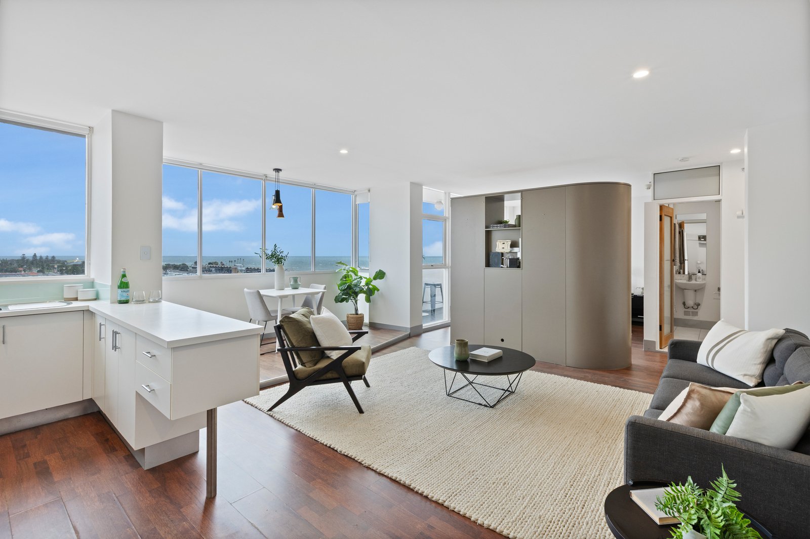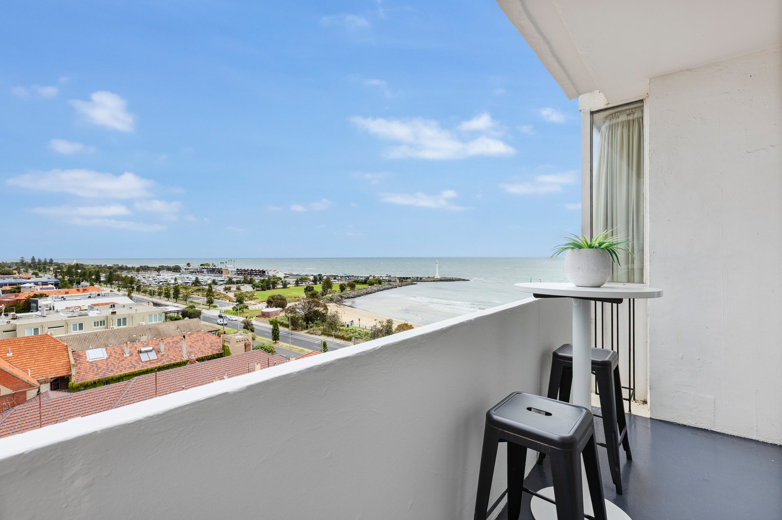 Elevated on the eighth floor of iconic Edgewater Towers, this beautifully updated apartment captures sweeping Bay views across St Kilda Marina to Brighton and beyond, a rare coastal vantage point...