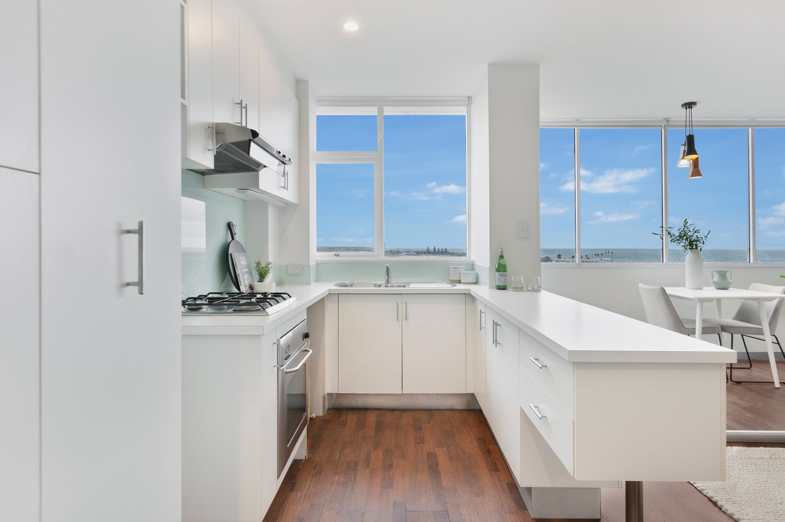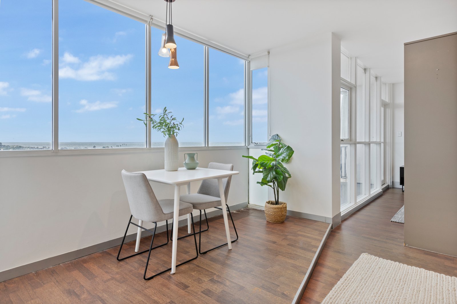 Elevated on the eighth floor of iconic Edgewater Towers, this beautifully updated apartment captures sweeping Bay views across St Kilda Marina to Brighton and beyond, a rare coastal vantage point where the seaside and the many moods of the water become part of everyday living.