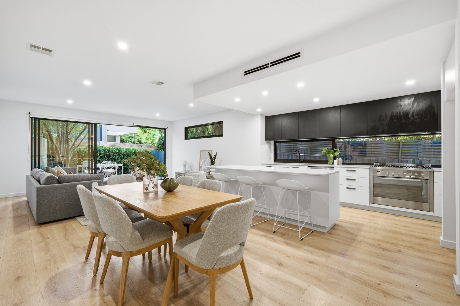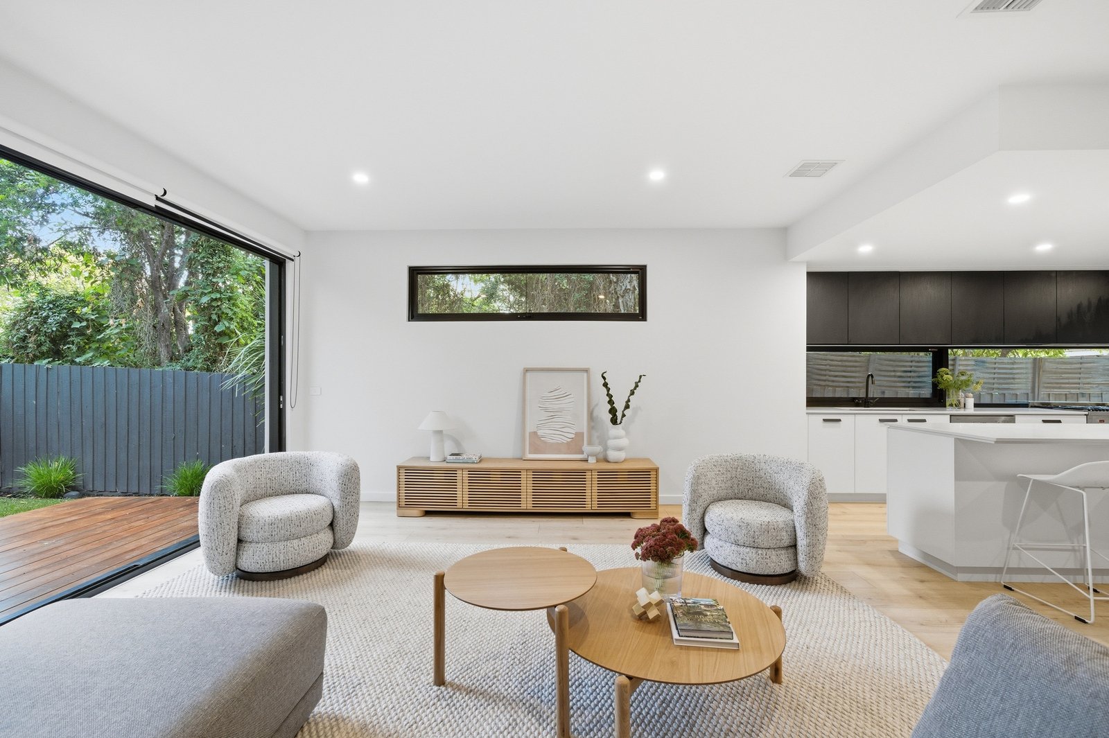 Living, dining and kitchen unfold as a cohesive open domain, framed by expansive glazing across the rear. Garden outlooks remain ever-present, while stacker doors extend to an elevated deck, shaping a natural setting for outdoor entertaining.