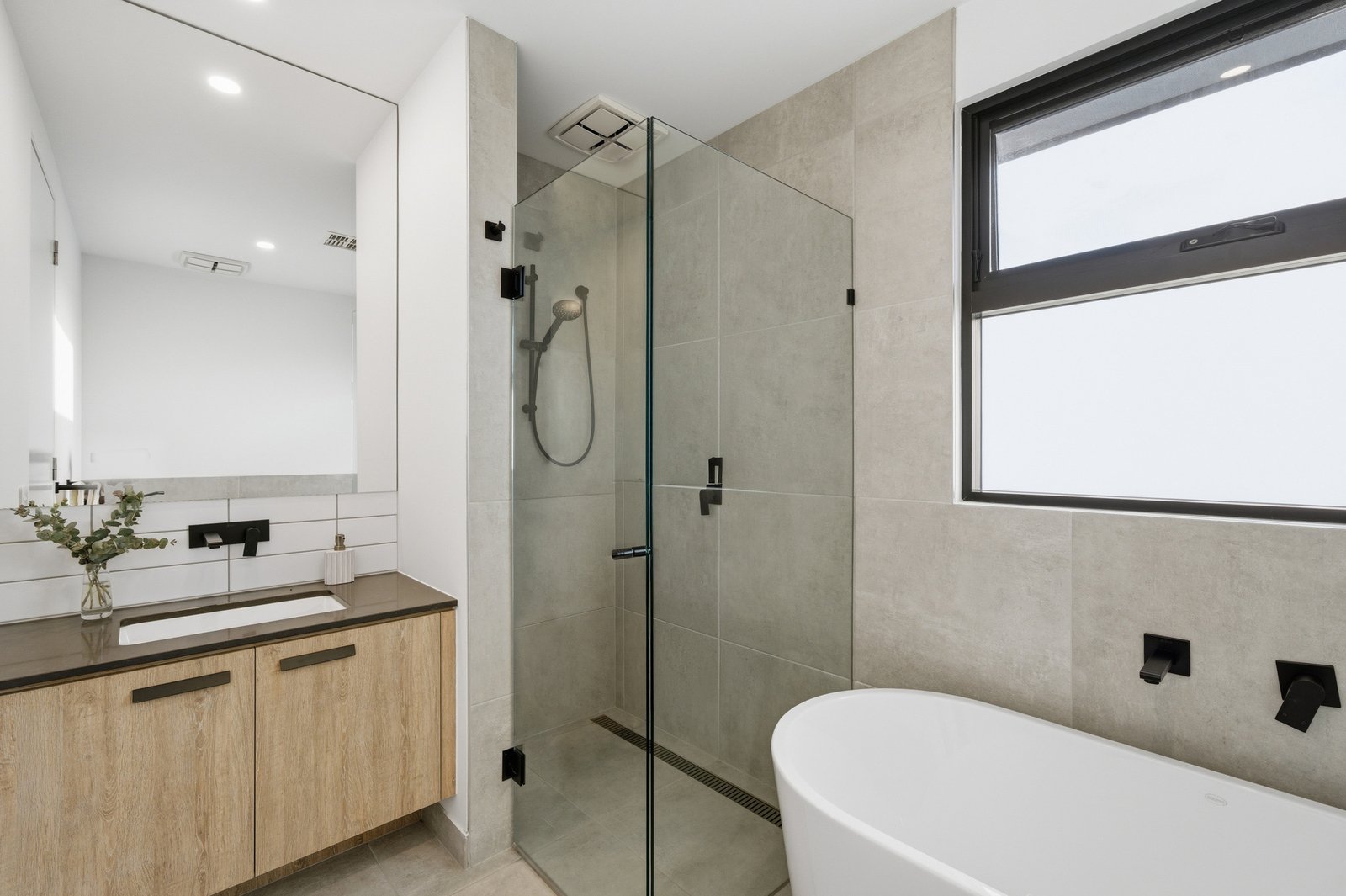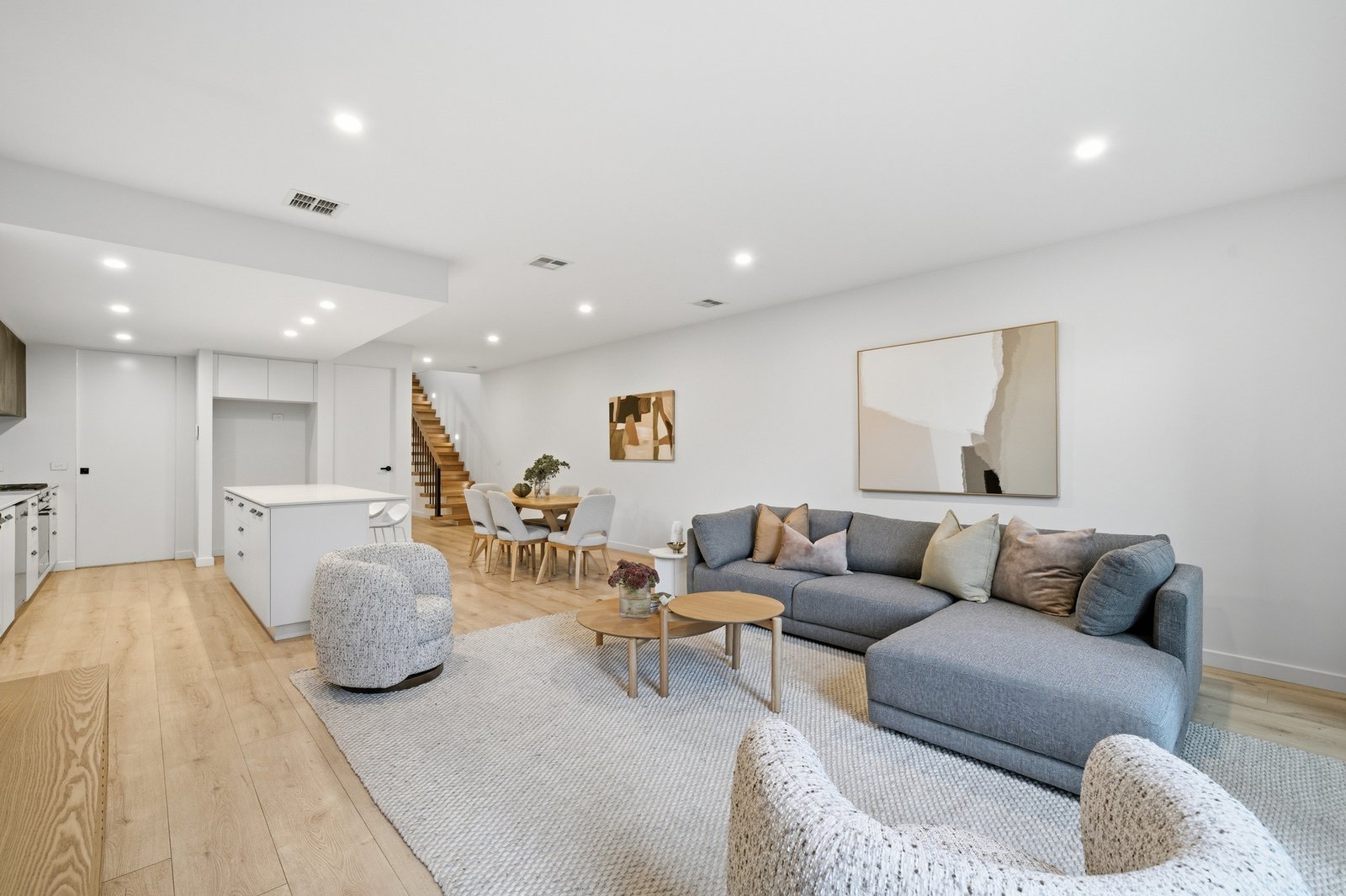 Upstairs, the main suite is set apart, where soft natural light and generous proportions are complemented by a fitted walk-in wardrobe and a beautifully appointed ensuite. A skylit retreat provides separation, accompanied by two additional bedrooms with mirrored robes and a luxurious central bathroom appointed with a freestanding bath and oversized shower.