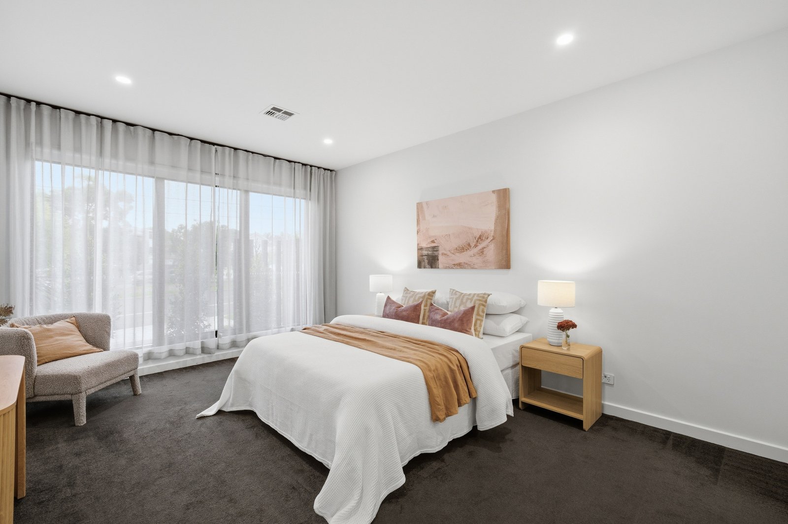 A broad entry defines the arrival, where engineered oak floors carry warmth underfoot and the layout reveals itself in stages rather than all at once. To the front, a north-facing bedroom captures all-day light, complemented by a walk-through robe and access to a two-way bathroom.
