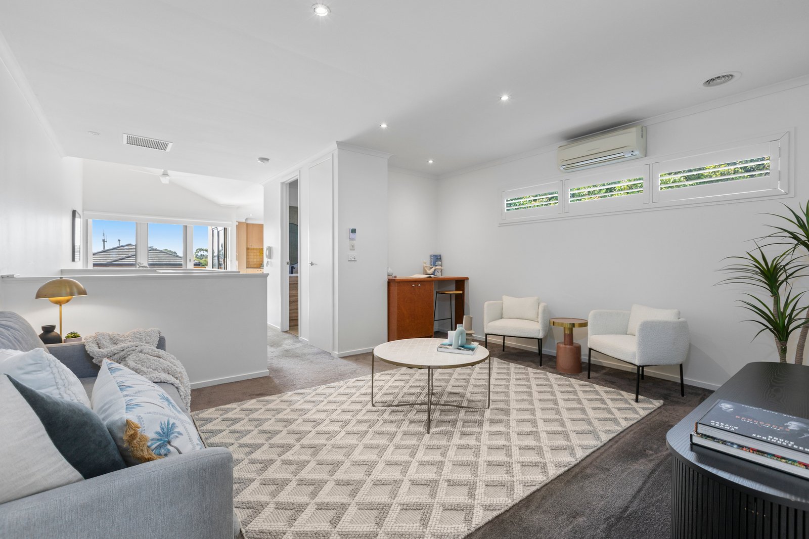 Set to the rear of an immaculate group with just three on the block, the accommodation features a reverse floorplan which maximises the sunshine through the well-equipped upstairs kitchen and the dining zone that opens to a sundrenched northerly terrace. The living room is an inviting space to relax, whilst also on this level is a comfortable bedroom with study nook and park-view balcony serviced by a stylishly renovated bathroom.
