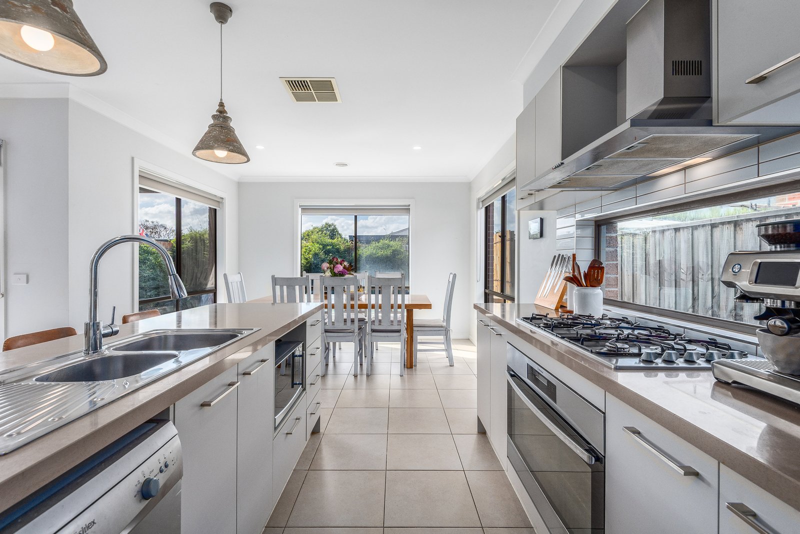 The rear of the home transitions to a light filled open plan kitchen, dining and living area. The quality kitchen features stone benchtops, a 900mm oven, gas cooktop, rangehood, dishwasher, generous storage including a large walk in pantry, and contemporary pendant lighting. Glass sliders extend the living area into the alfresco for seamless indoor–outdoor living and entertaining.