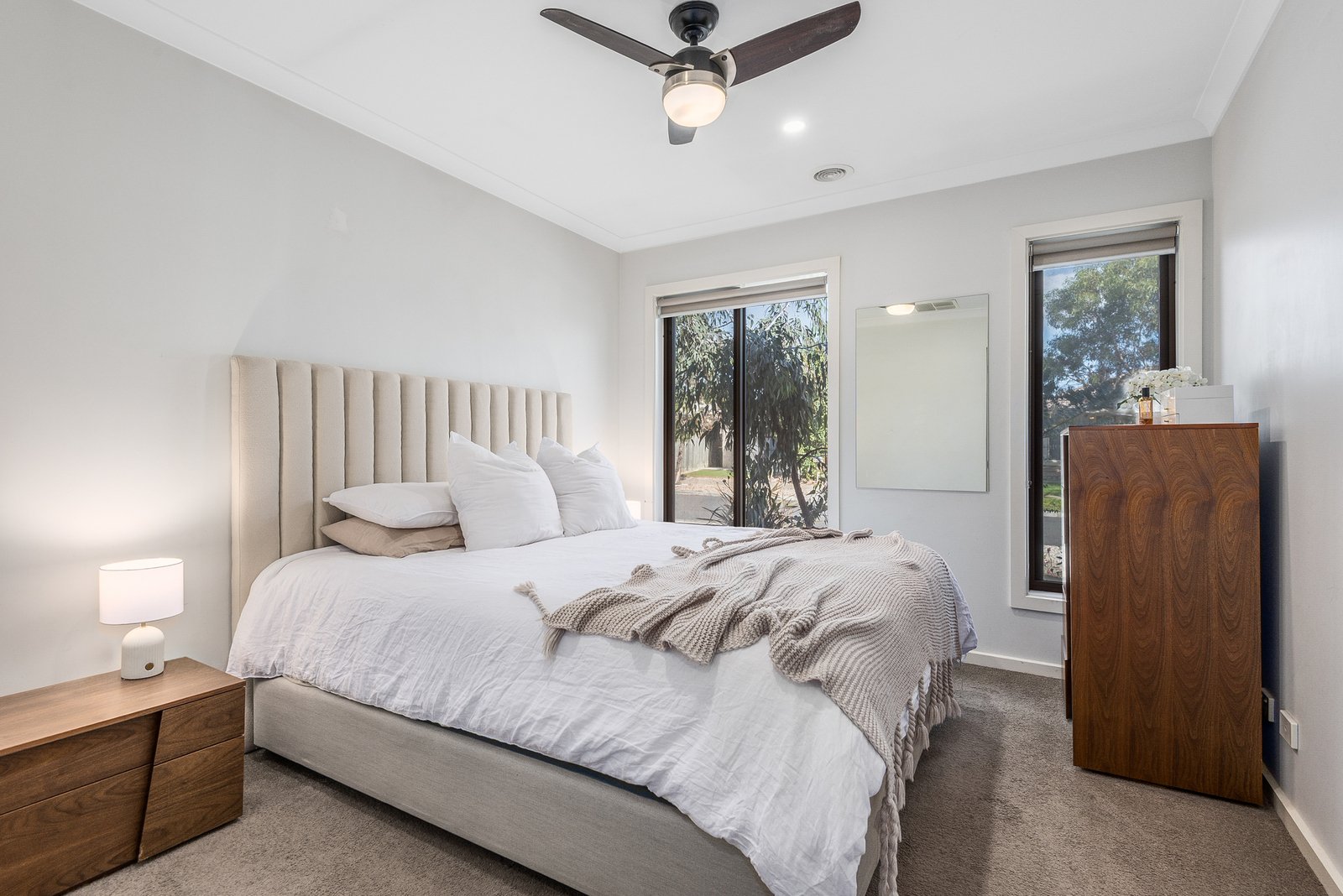 Landscaped easy care gardens and a classic contemporary façade impress on arrival. Inside, a central hallway draws your eye through the home, showcasing elegant neutral interiors and light filled spaces. Off the entry, the main bedroom features walk through robes and a tastefully presented ensuite. Two additional bedrooms include built in robes, serviced by a stylish main bathroom with luxurious bath, separate shower, modern vanity and a separate WC. A central study offers a versatile space, ideal for a home office, sitting nook or play area for the kids.