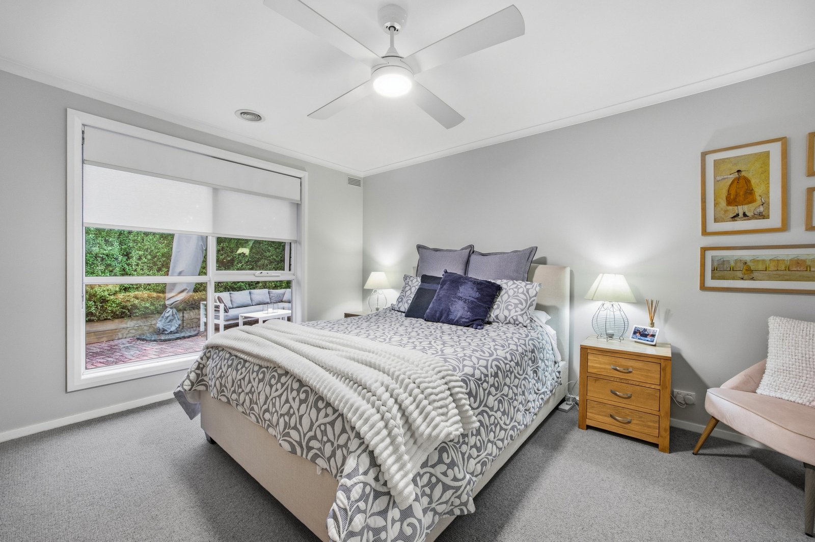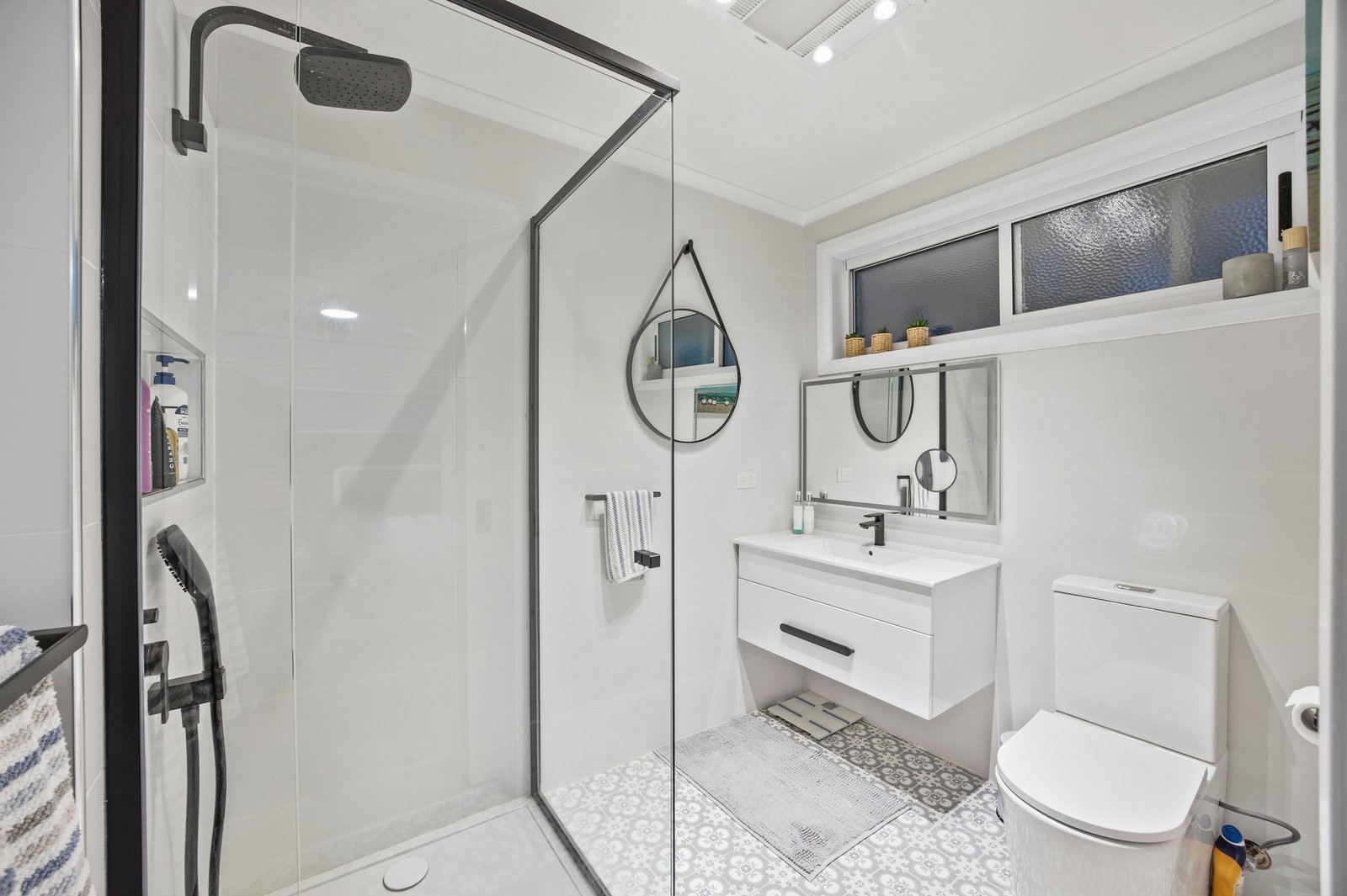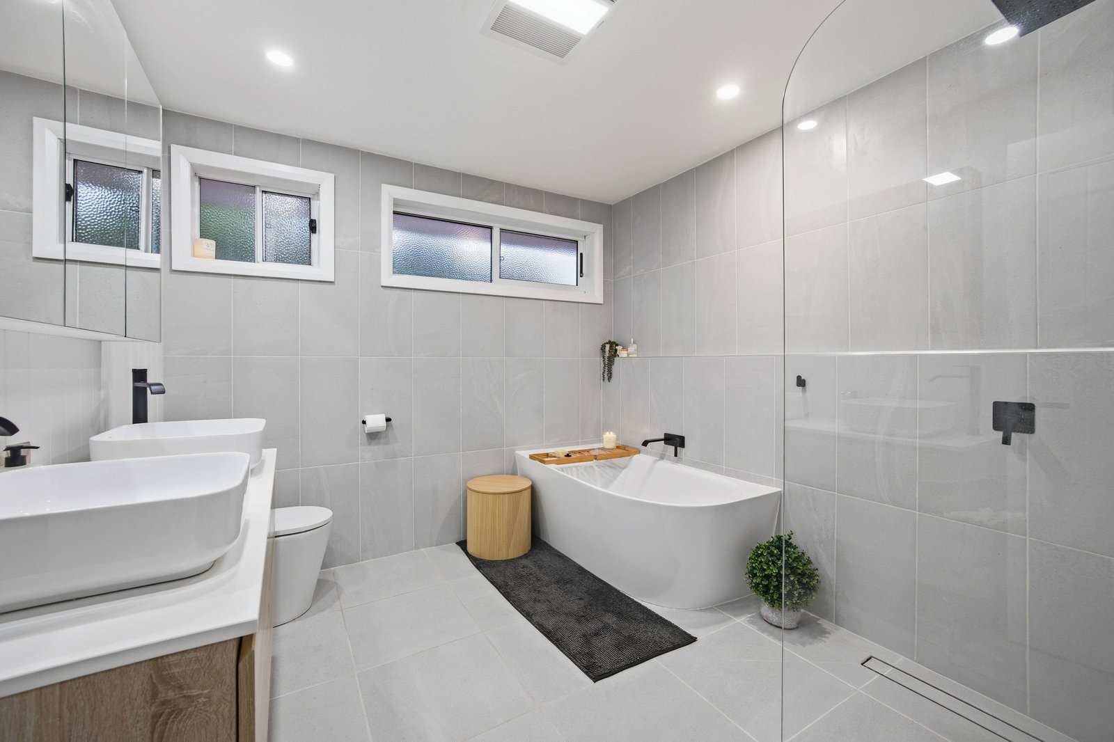 Accommodation comprises four generous bedrooms, headlined by a king-sized master suite complete with built-in robes and a beautifully appointed ensuite. The main bathroom is equally impressive, showcasing a double vanity, separate bath, shower, and heat lamps, all finished to a high standard to match the rest of the home. Both bathrooms have been tastefully renovated to offer a sense of luxury and comfort.