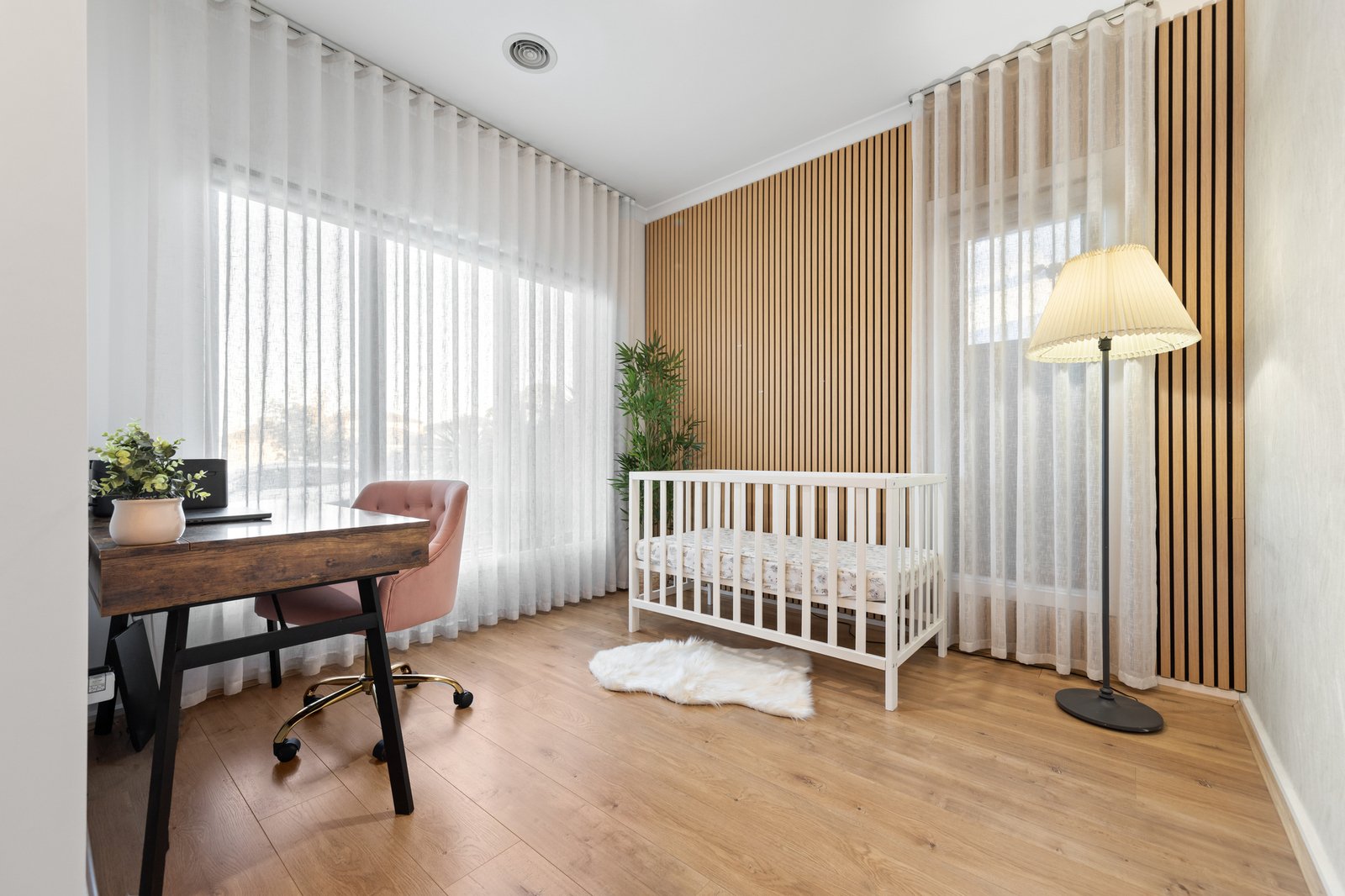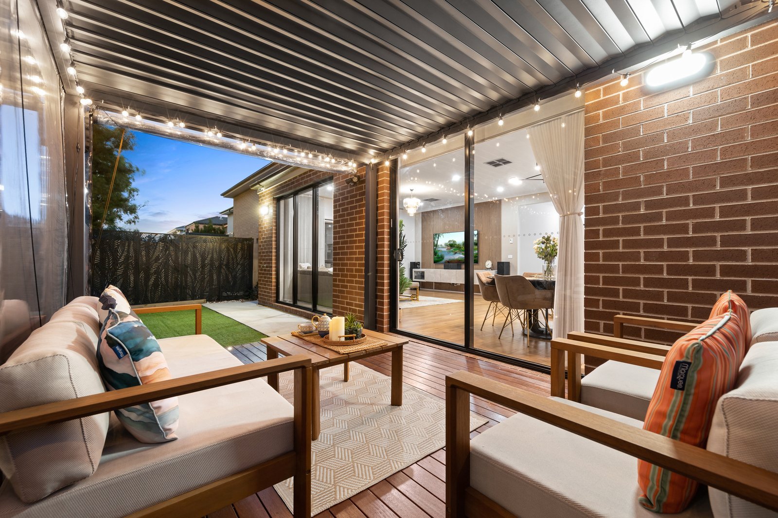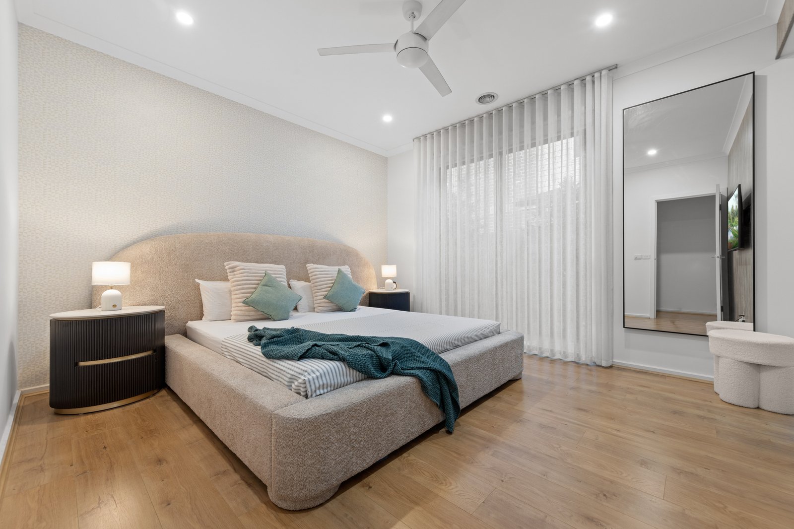 But the brilliant bespoke detail doesn't end there. Luxuriously finished with a high-end mix of airy roof-hung sheers and solid block-out blinds, the home features eye-catching wall-finishes including slatted-panel feature walls (inside and out) plus rich wallpapers, and automated security-shutters for each bedroom. Centrally heated and cooled with additional fan-cooling, the home has the ease of great storage including built-in robes, a full family laundry and the security of keyless smartlock entry plus eight-camera Swann sensor CCTV, and a generous double auto garage.