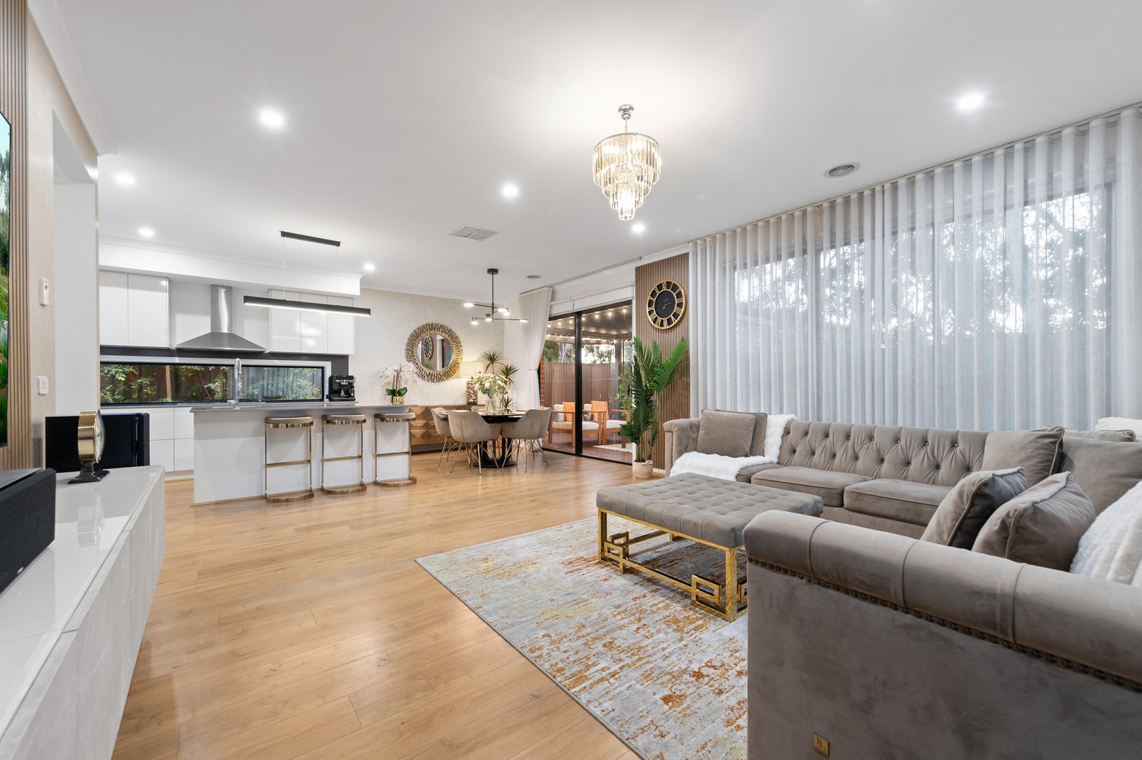 Sized up with large living-dining plus a café-blind enclosed al fresco area as a second all-season living zone, this flexible home is cleverly configured with a multi-purpose home-office (easily returned to fourth bedroom), and a vast master-suite comprising a garden-access bedroom, fitted walk-in robe and deluxe dual-vanity ensuite. Optioned up with prestige appliances including a Bosch dishwasher for the entertainers’ kitchen and a big double sink for the butler's pantry, this designer-detailed home is upgraded with premium stone benchtops, wideboard oak floors throughout, floor-to-ceiling bathroom tiles and sparkling designer lighting - including contemporary chandeliers and a kitchen strip-pendant.