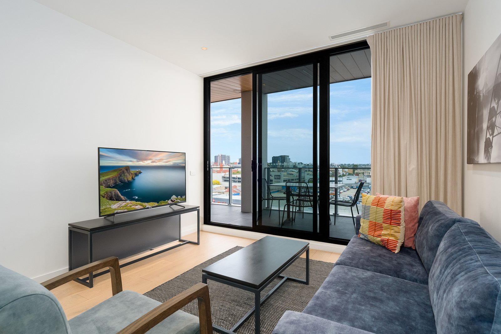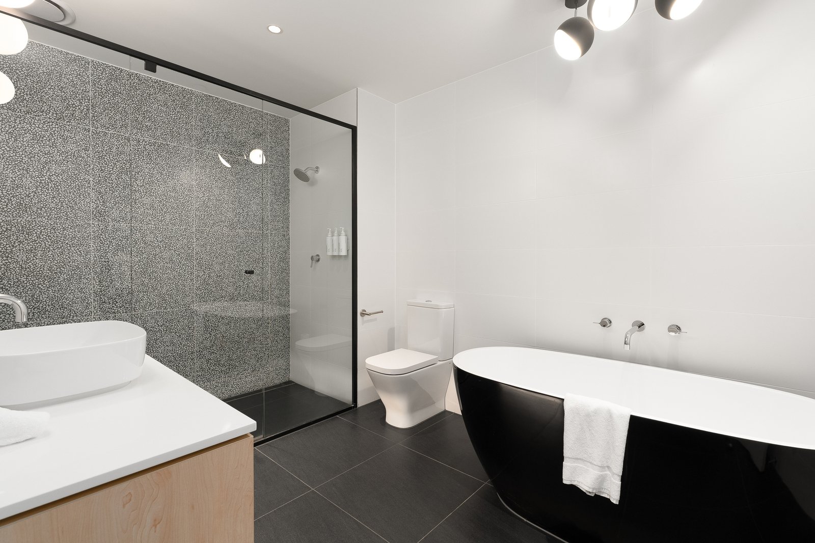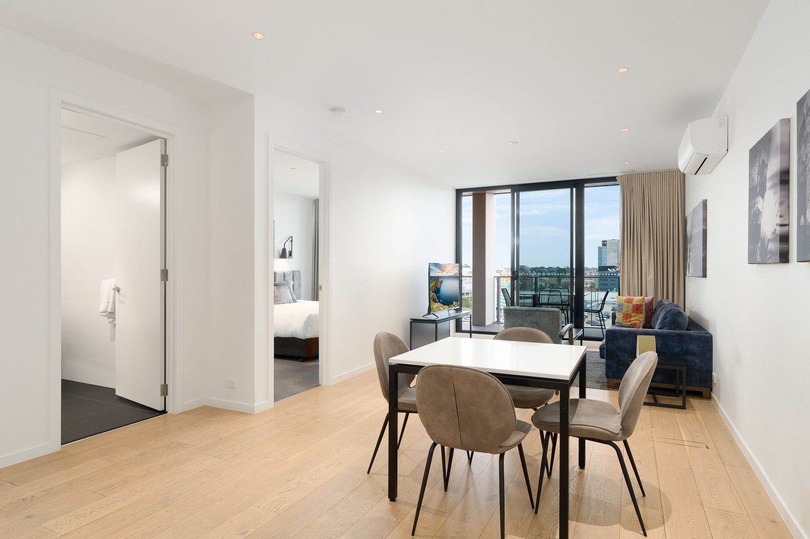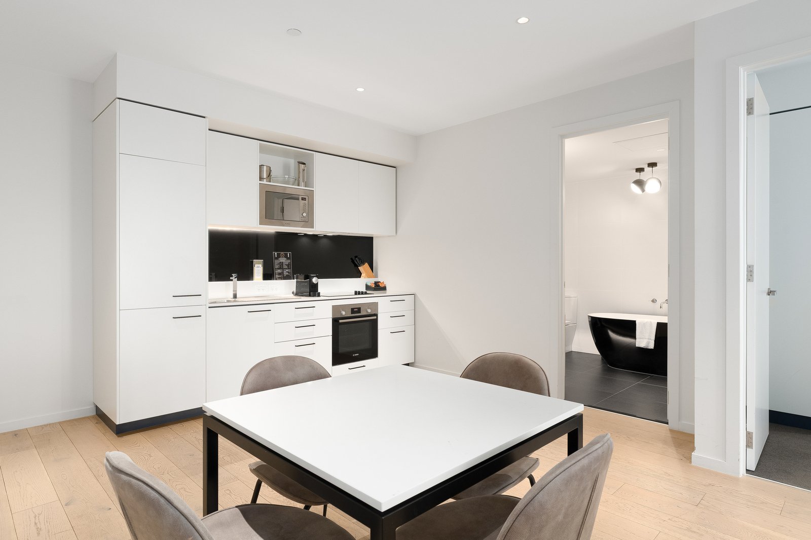 The primary apartment features a light-filled open plan kitchen, dining and living area with floor-to-ceiling glass stacker doors opening up to a private balcony showcasing beautiful views across the vibrant city skyline to the bay. The sleed kitchen features quality Bosch cooking appliances, Ariston in-built microwave, a fully integrated dishwasher, integrated fridge/freezer, and stone benchtop. The luxurious bedroom includes ambient wall lighting and built-in robes, serviced by a stylish bathroom finished in floor-to-ceiling tiles, with freestanding bath, separate shower, and stone-topped vanity. The adjoining studio suite features an ensuite in keeping with the high-end finishes of the apartment, breakfast bar, and direct access to a private balcony.