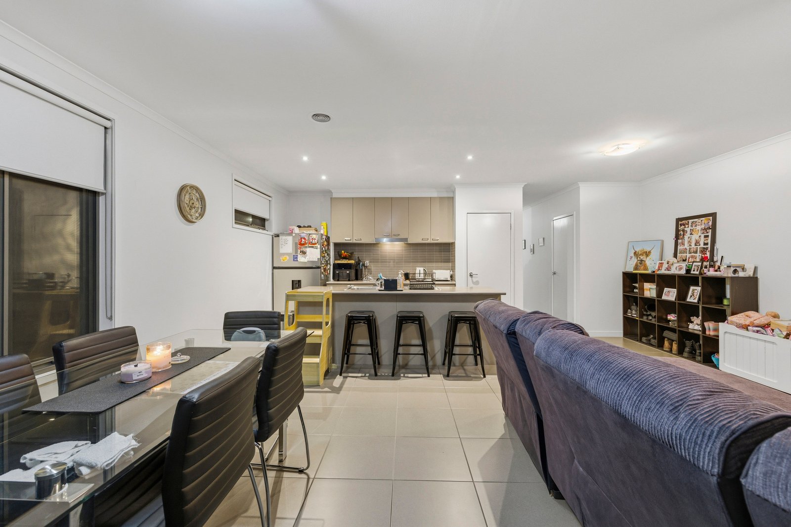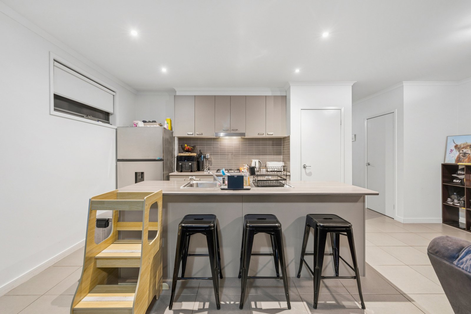 Upon entry, you’re welcomed by a generous front living zone—perfect as a retreat, second lounge, or kids’ space. Flowing through to the heart of the home, the open plan kitchen, meals, and living area is impressively spacious and bathed in natural light, thanks to expansive windows along the side of the home. The kitchen is well-appointed with quality stainless steel appliances, a gas cooktop, and dishwasher, making everyday living and entertaining effortless.