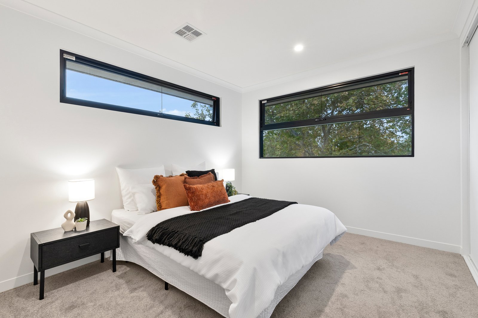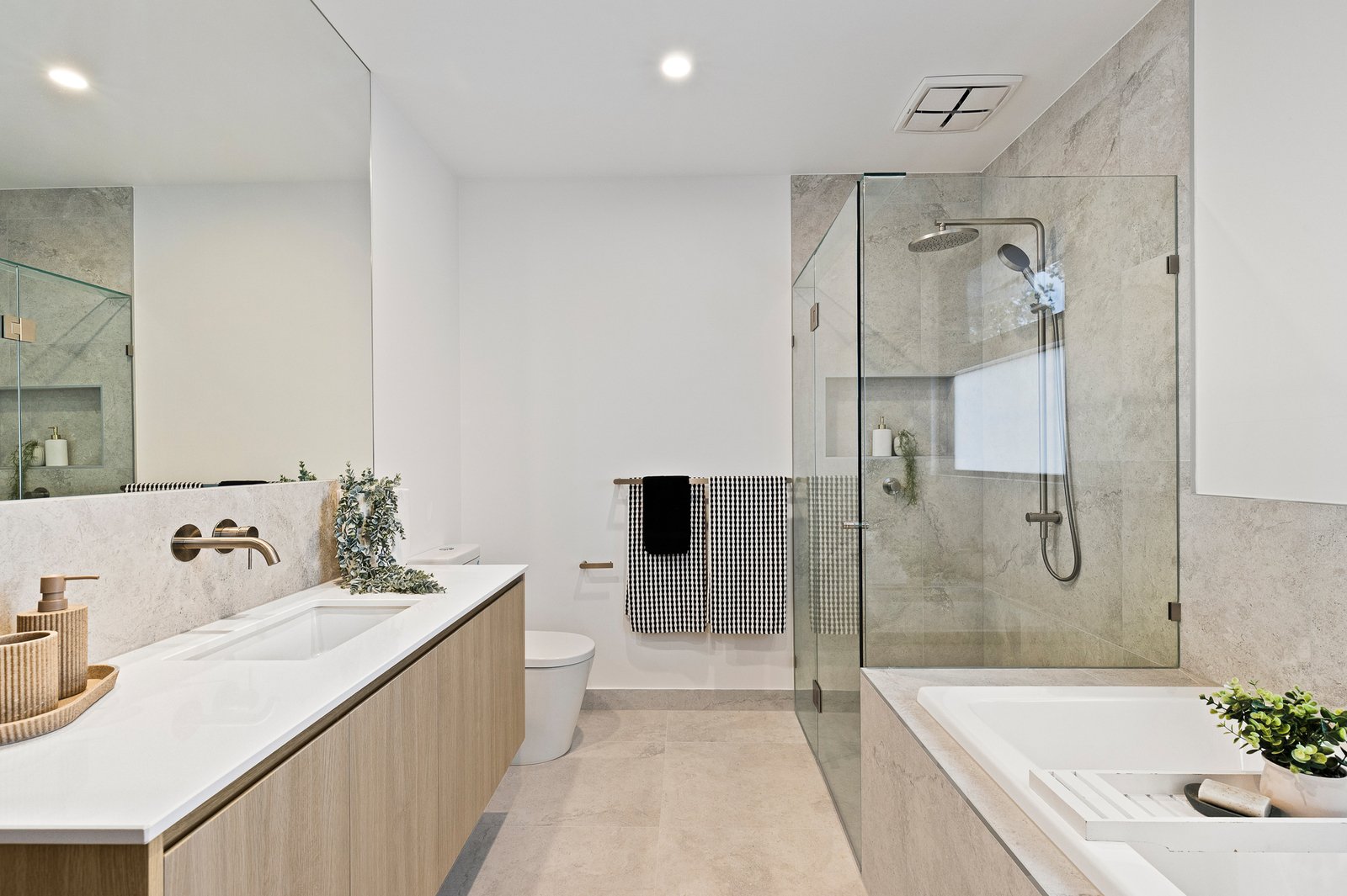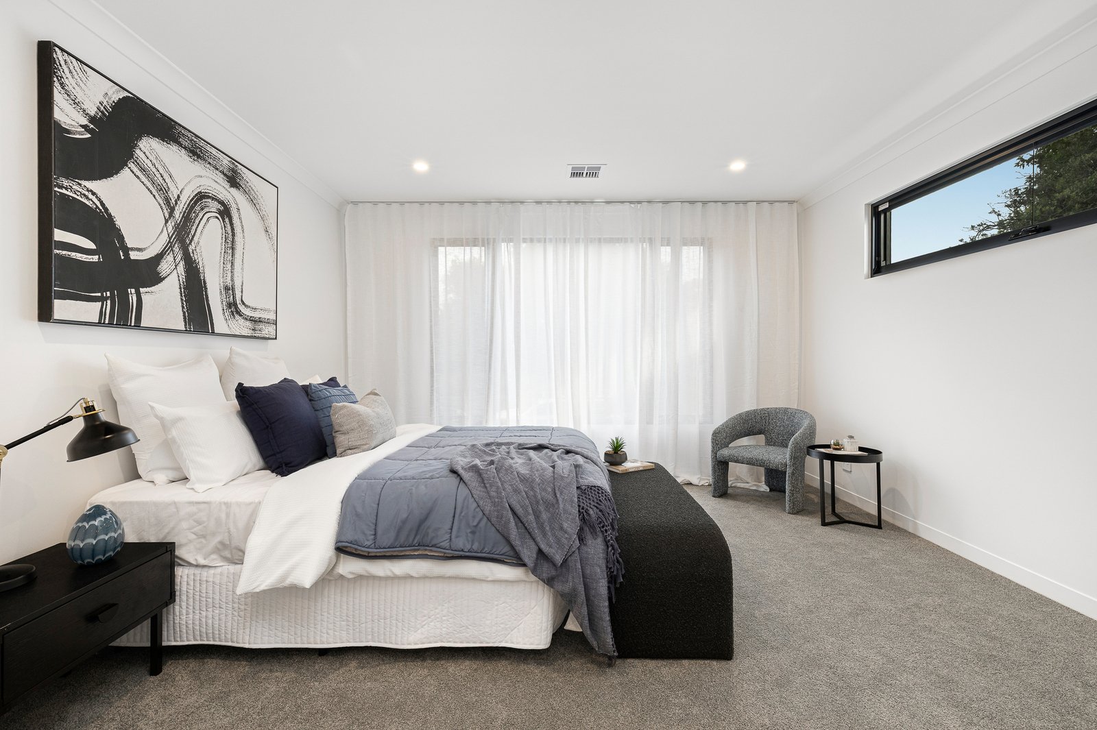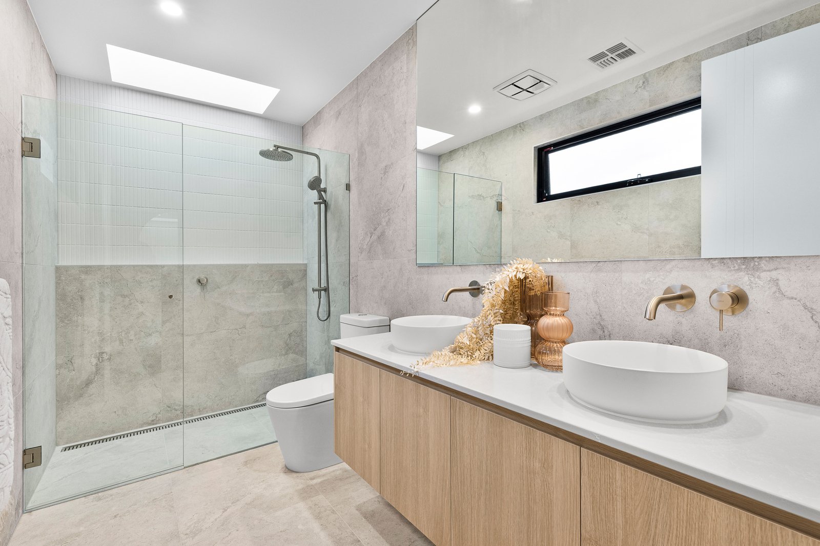 Lighting up with a top-of-the-range entertainer’s kitchen featuring a full complement of the latest (Series 8) Bosch appliances and a wraparound butler's pantry, the home is custom curated with the sleekest stone benchtops, the lightest oak wideboards and the coolest porcelain-tiled bathrooms. Shining with architectural skylights, sparkling dual-head showers and streamlined robes, there’s a stretch of lofty roof-hung sheer-curtains cocooning the principal suite and plush carpets underfoot.