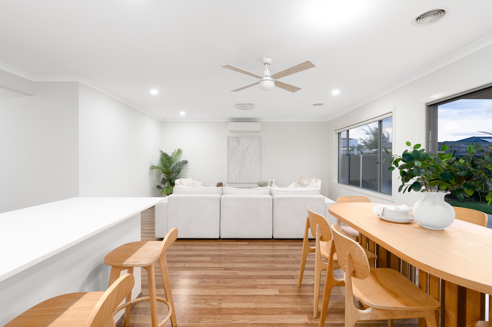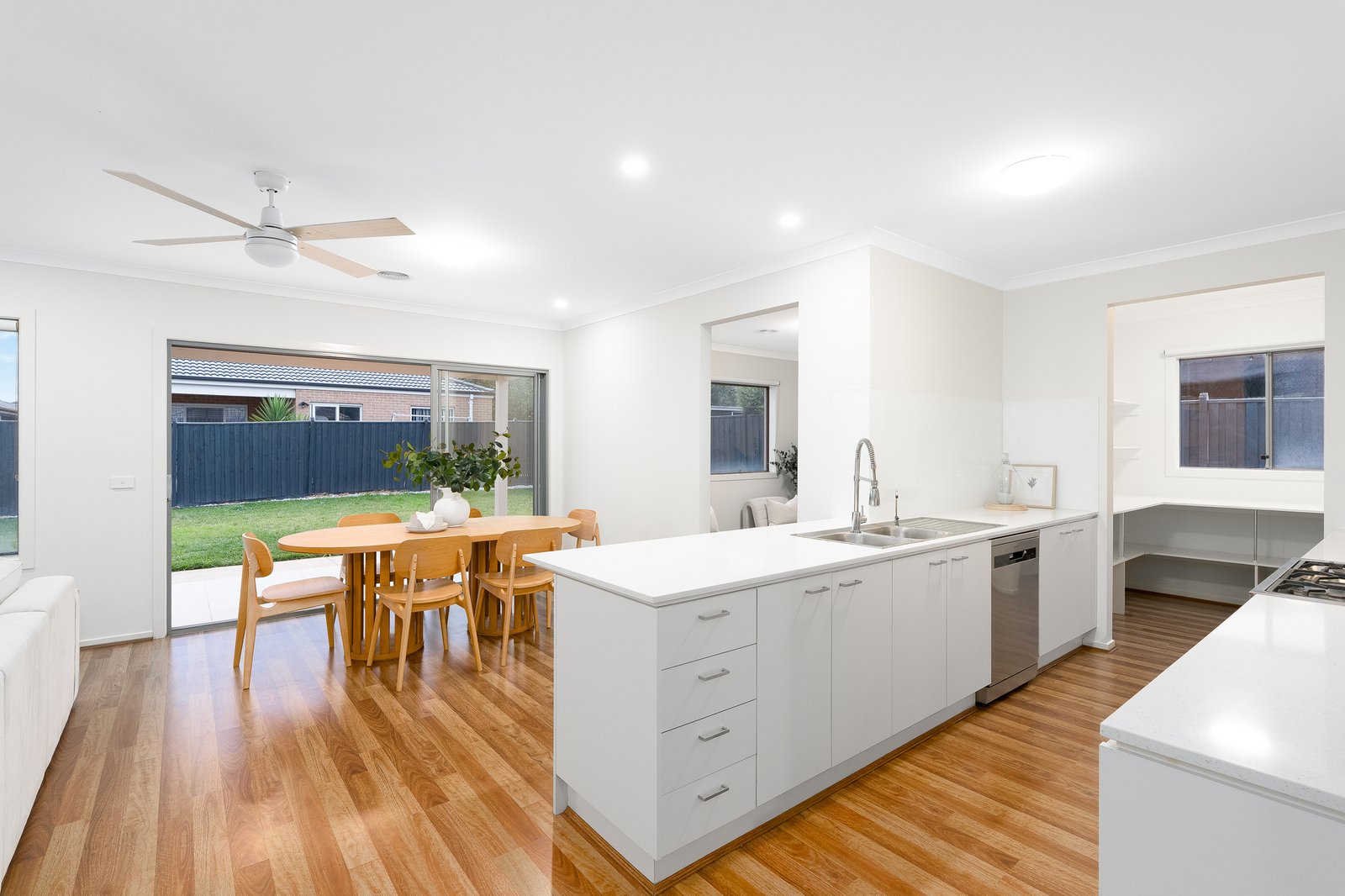 The heart of the home is a light-filled open plan domain, where a well-appointed kitchen with stone benchtops, quality appliances, and a walk-in pantry seamlessly connects to the dining and living areas—creating an inviting space to gather and entertain. A second living zone adds further flexibility, ideal as a theatre, retreat, or home office.