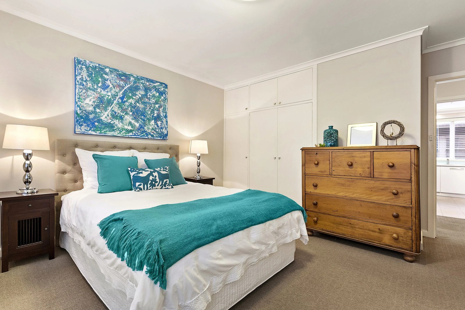 Two spacious bedrooms are complemented by a sleek, fully tiled bathroom featuring a frameless shower, heated towel rail, and separate toilet.