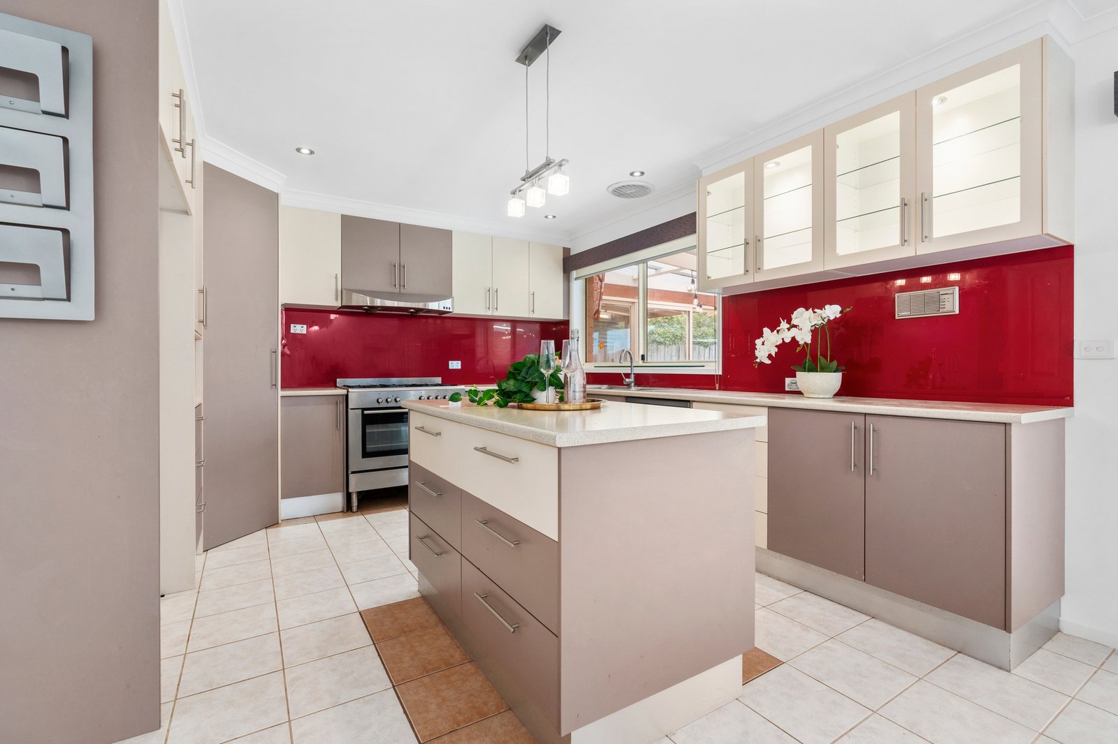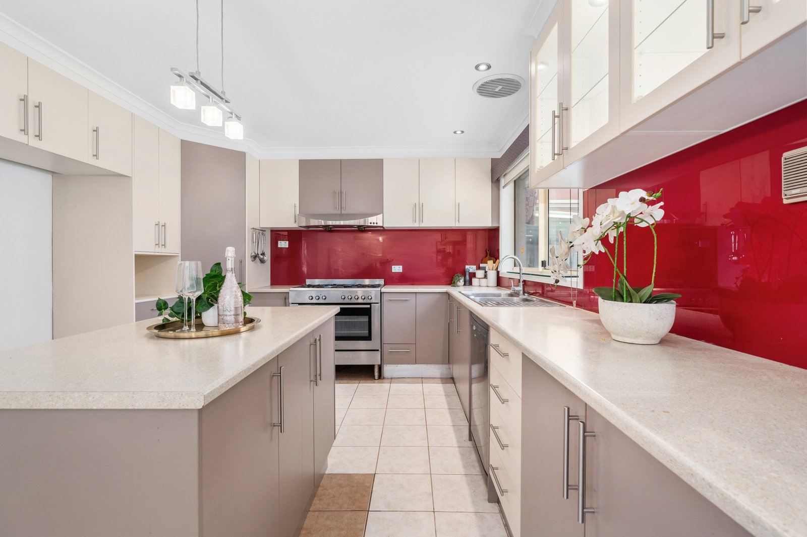 Beyond the rose-lined front garden, the home unfolds with bright and airy living space, free flowing from the formal to the casual wing, with a stylish central kitchen appointed with a 90cm professional cooker and a vibrant cherry red glass splash back.