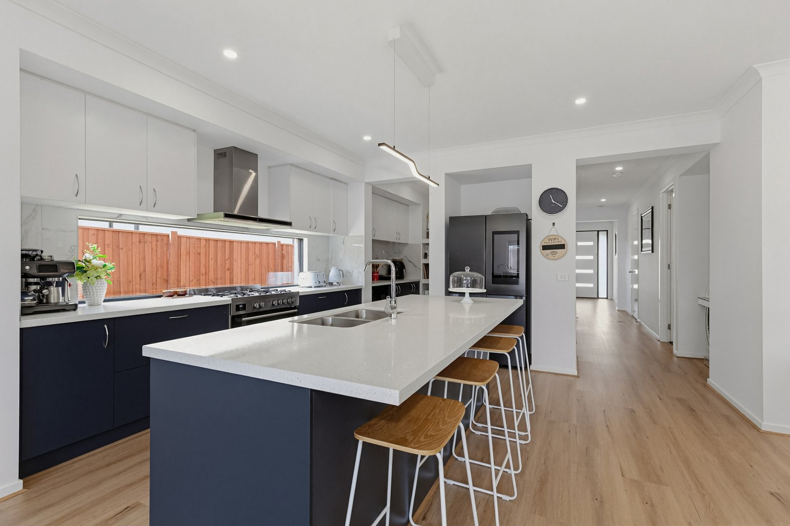 At the heart of the home lies a stunning open-plan kitchen, meals, and living area, designed for both everyday living and entertaining. The kitchen is equipped with 40mm Caesarstone benchtops, a generous breakfast bar with dual Franke sinks, and premium 900mm stainless steel appliances including a 5-burner gas cooktop, electric oven, and dishwasher—all by Sôlt. A walk-in pantry and a stylish window niche overlooking the backyard complete this impressive space.