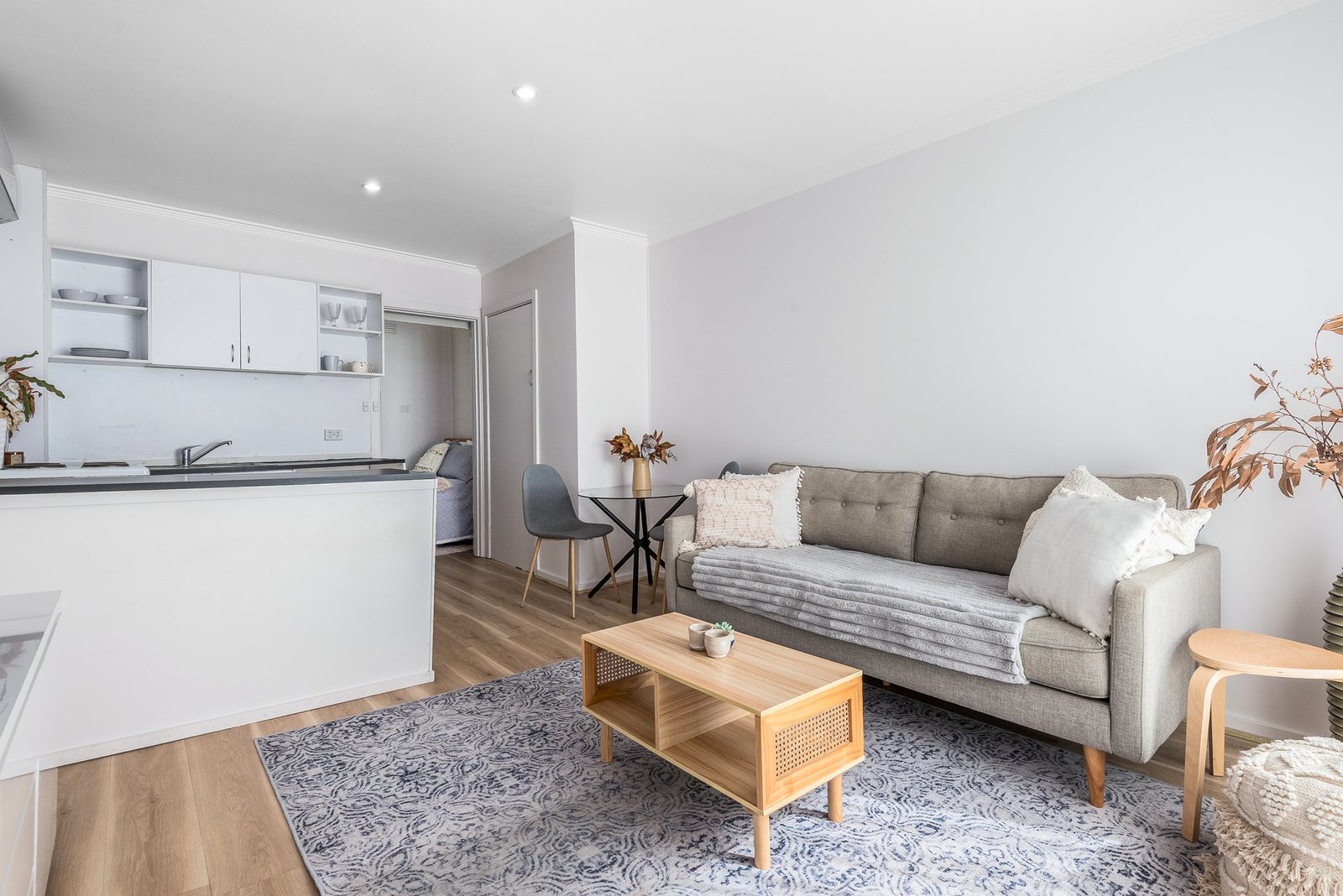Entry into the apartment reveals an open plan kitchen, dining and living area featuring light contemporary interiors, modern flooring and split system heating and cooling for year round comfort. The stylish kitchen is equipped with modern cabinetry, a 600mm oven and cooktop, and is designed to incorporate laundry facilities for self contained functionality. The bedroom adjoins an ensuite with a tiled shower, basin, mirror cabinet and wc.