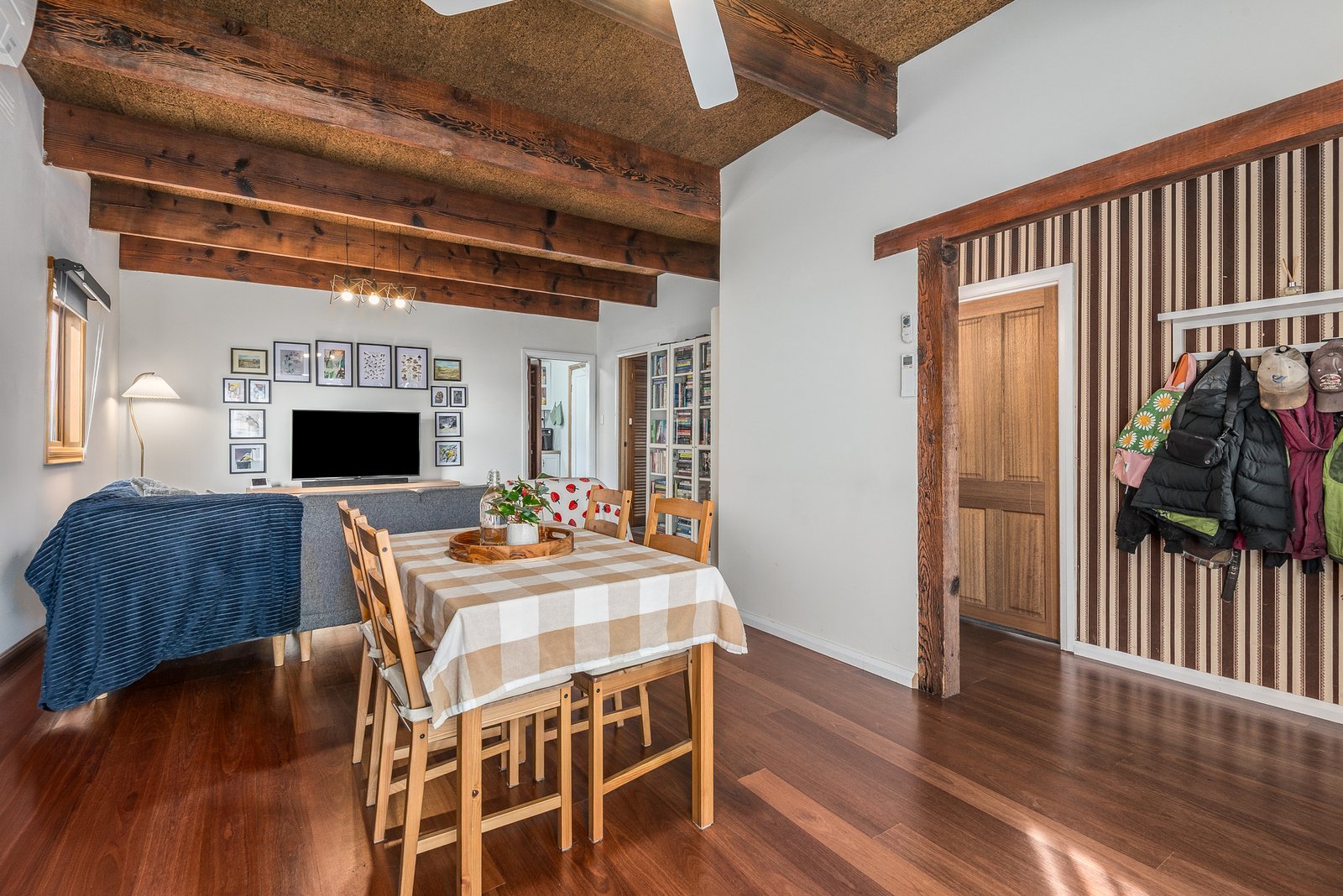 Set behind established trees, the charming weatherboard home is welcoming in appeal. Inside, the entry leads into an open plan living and dining area featuring polished timber floors, exposed beams, and modern lighting, with a ceiling fan and split system heating and cooling for year round comfort. A galley kitchen at the rear features a stone benchtop, 600mm Westinghouse oven, dishwasher, modern cabinetry, and is well-positioned to overlook the backyard. Comprising two generous bedrooms, both include built-in robes, serviced by a bathroom incorporating laundry facilities.