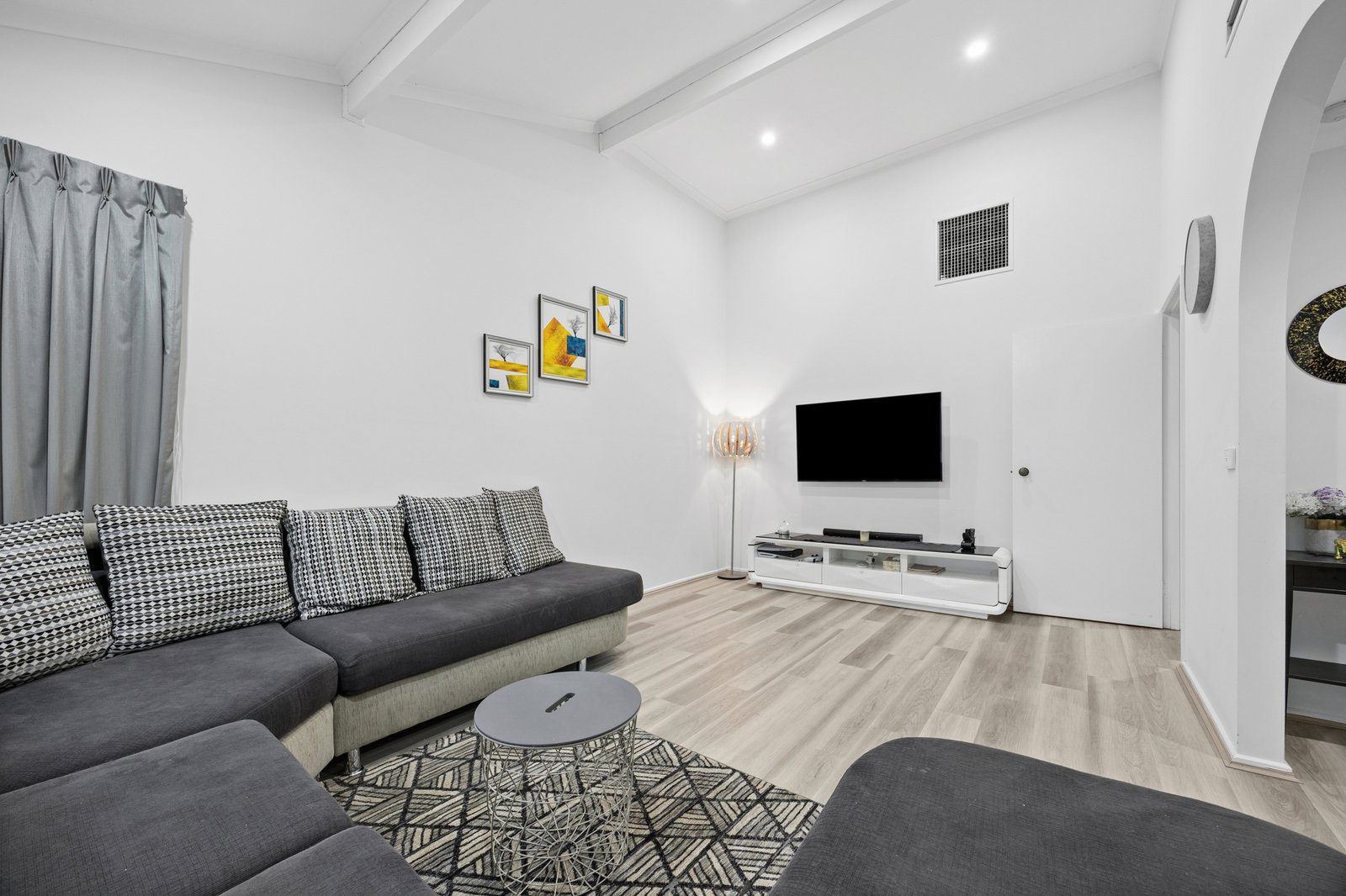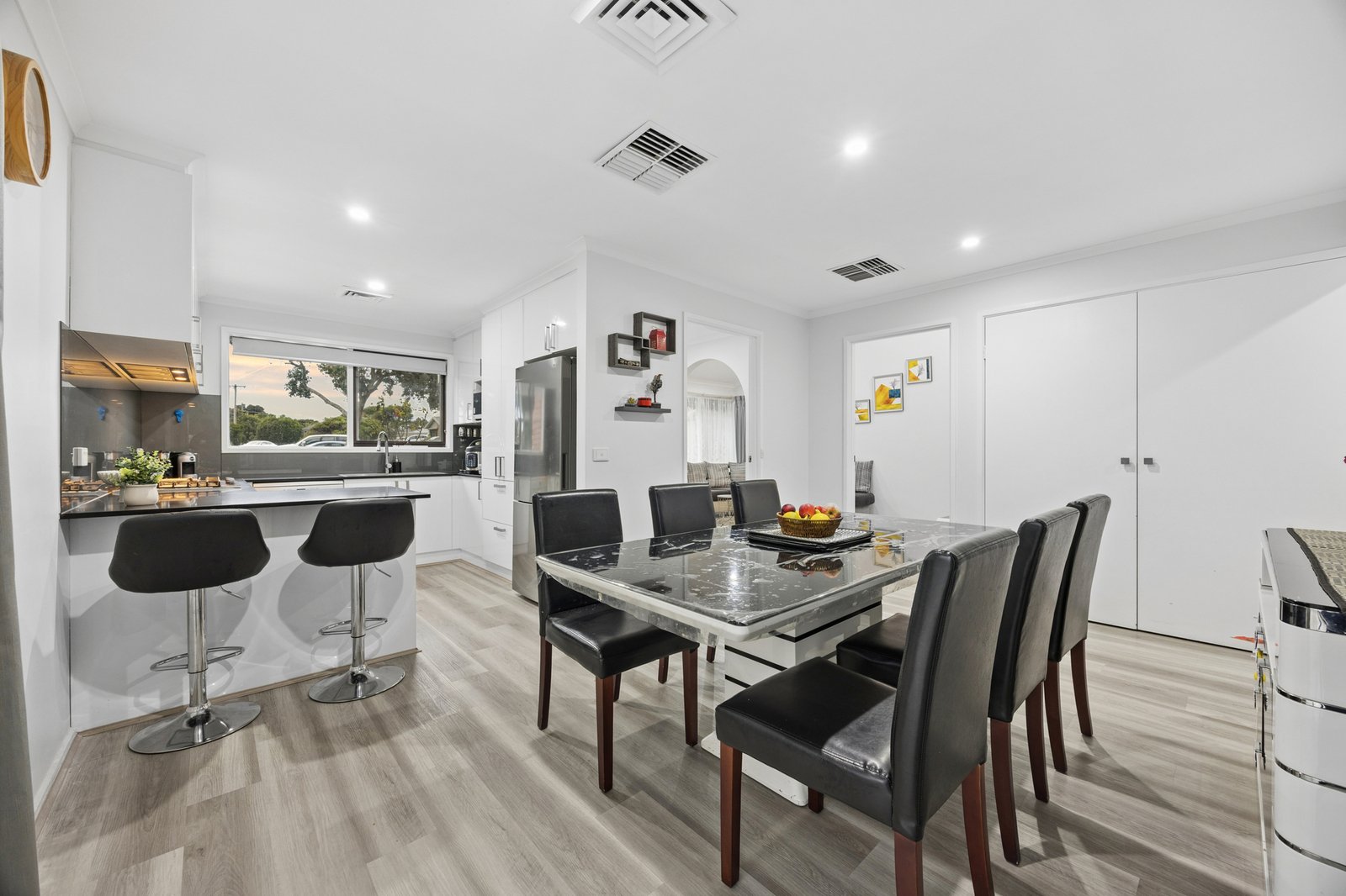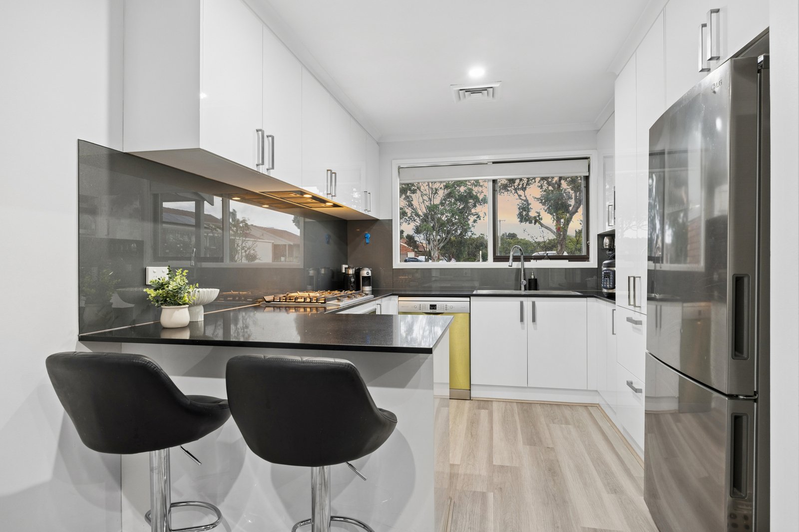 Designed for peace and privacy with garden-view rear bedrooms set quietly beyond the skylit central bathroom, this sizeable single-level home is stylishly renovated with a sophisticated stone-finished kitchen featuring prestige Bosch and Electrolux appliances, fresh new paintwork and hard-wearing new hybrid wideboard floors.