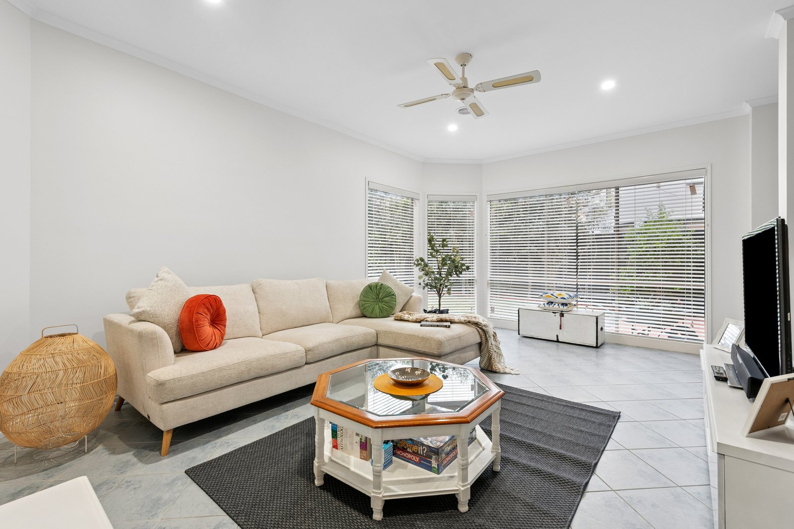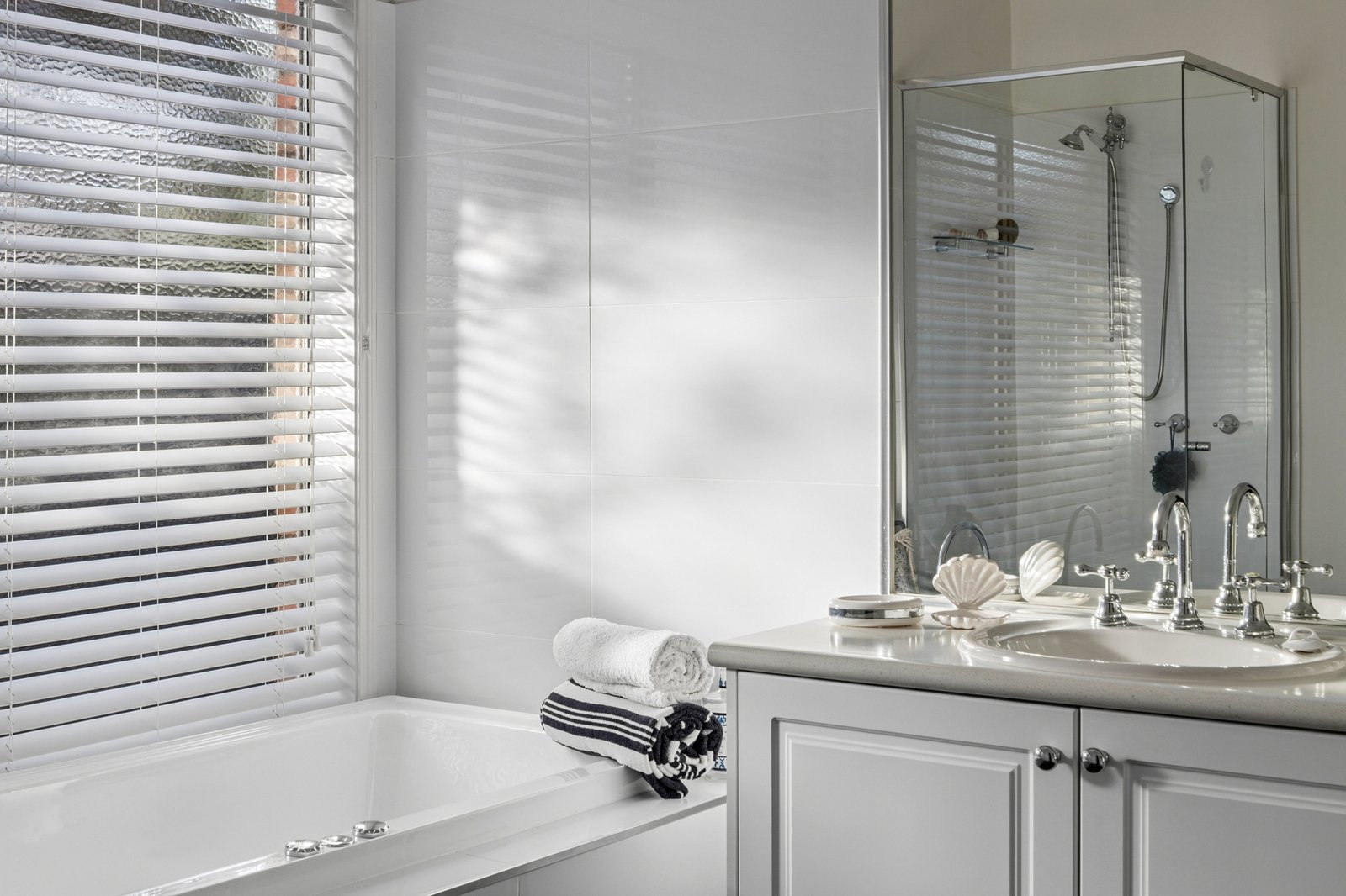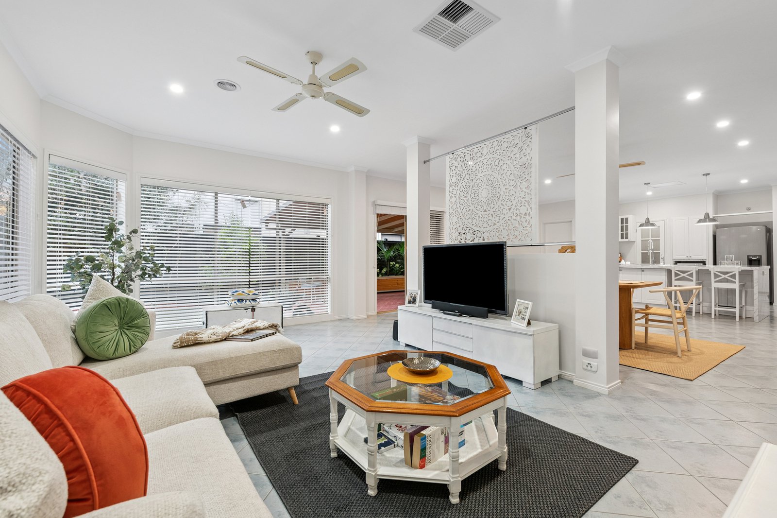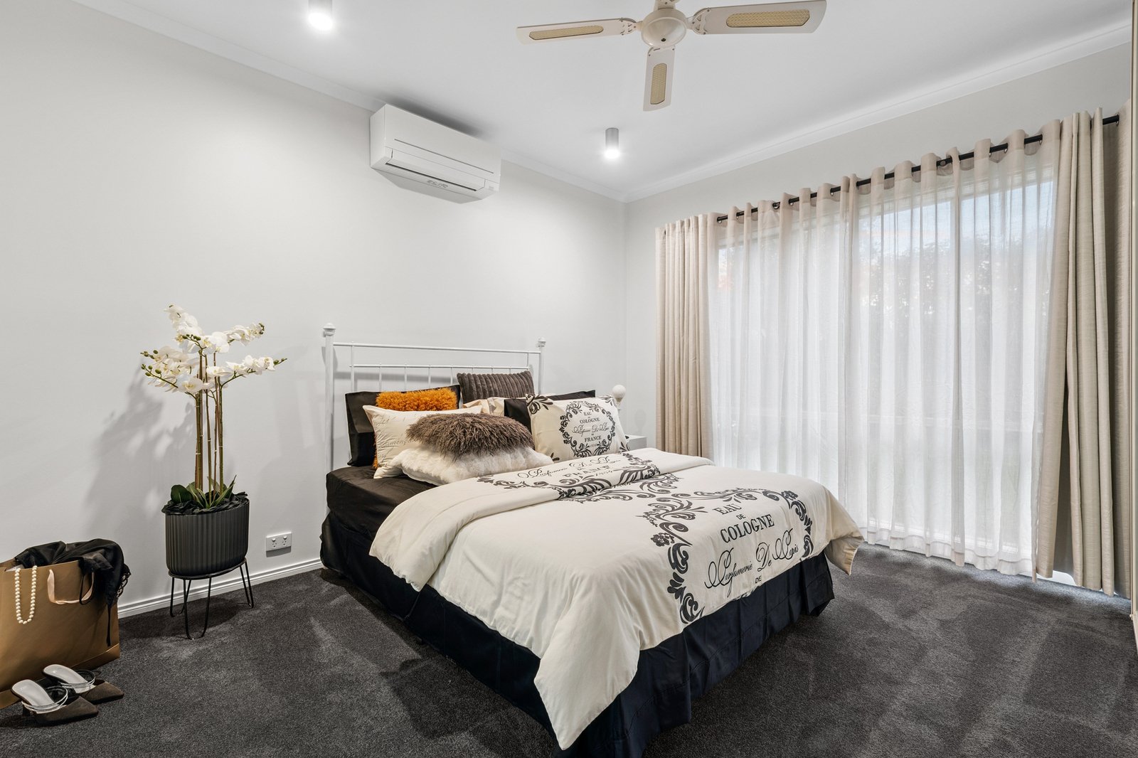 Freshly updated with new carpets, a crisp white palette, and timber venetians, the home feels bright, airy, and move-in ready. Comfort is assured year-round with central heating and cooling, supplemented by reverse-cycle air conditioning in the master suite and ceiling fans throughout. Practicality is well covered with abundant storage, including a generous linen press and a large family laundry.