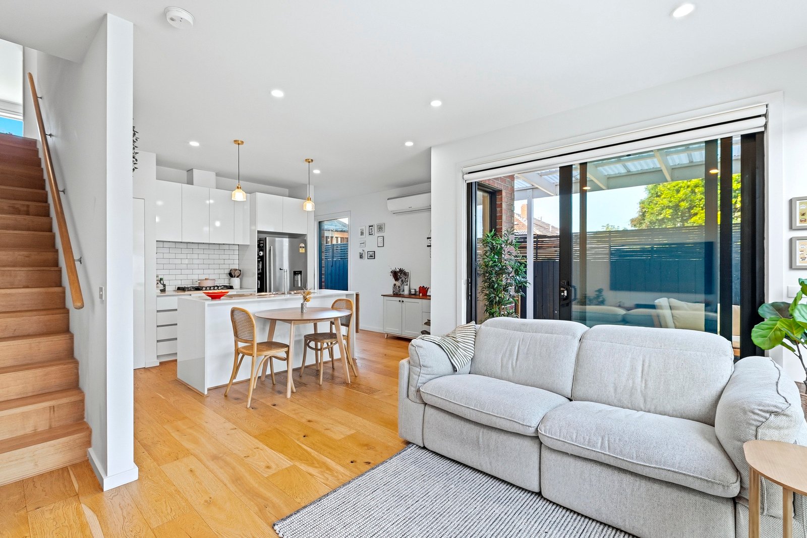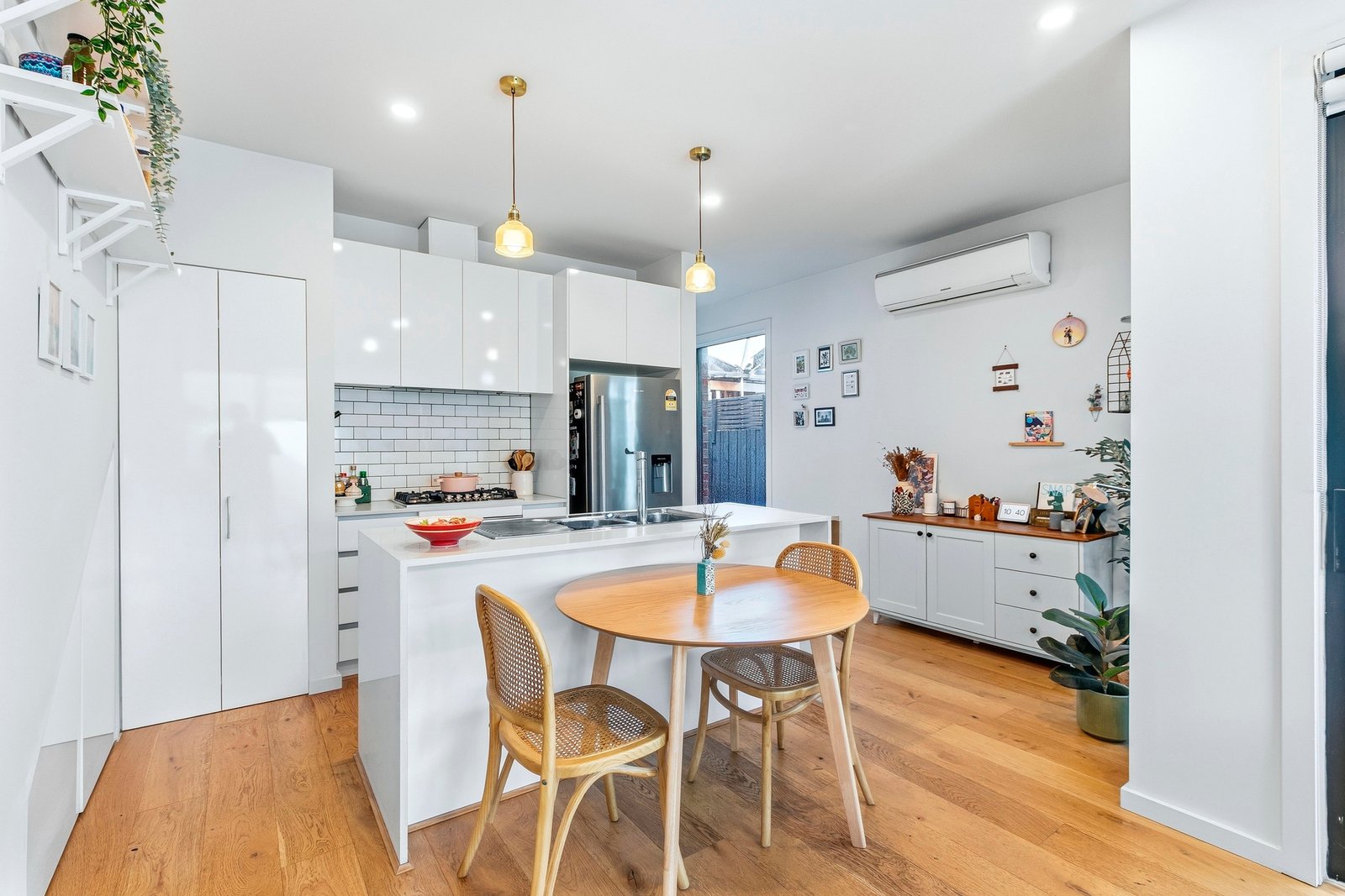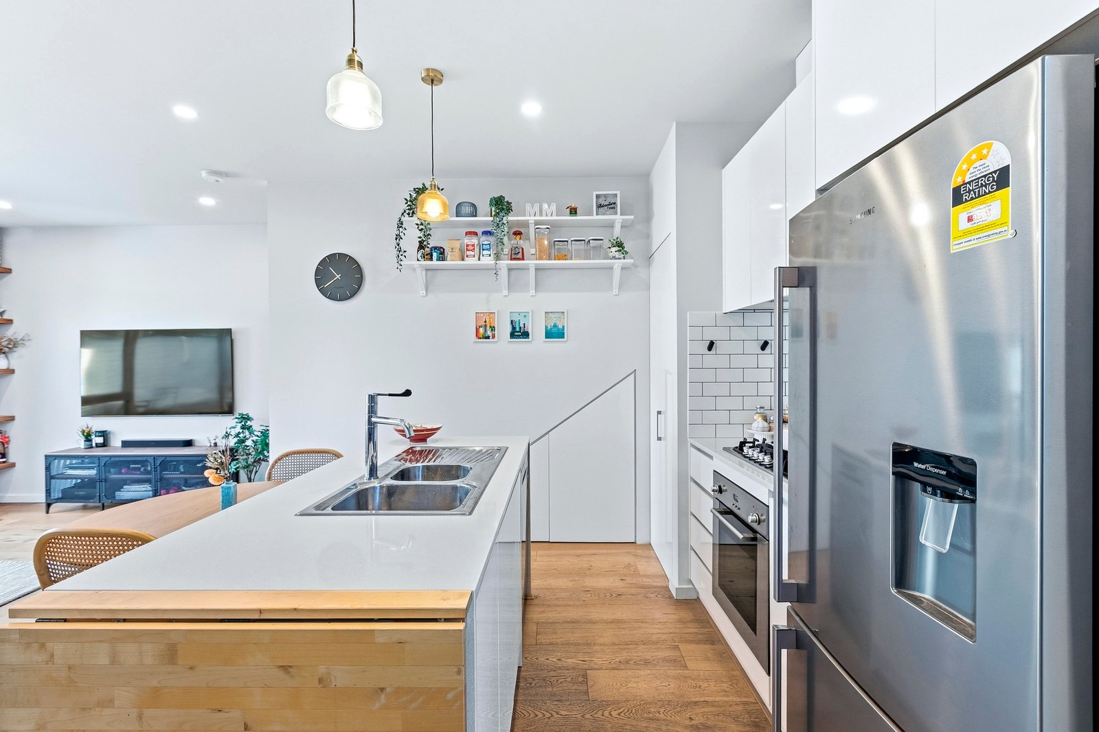 The kitchen is crisp and functional, finished with stone benchtops, subway tiling, quality appliances and excellent storage - including a generous pantry and clever use of space beneath the stairs.
